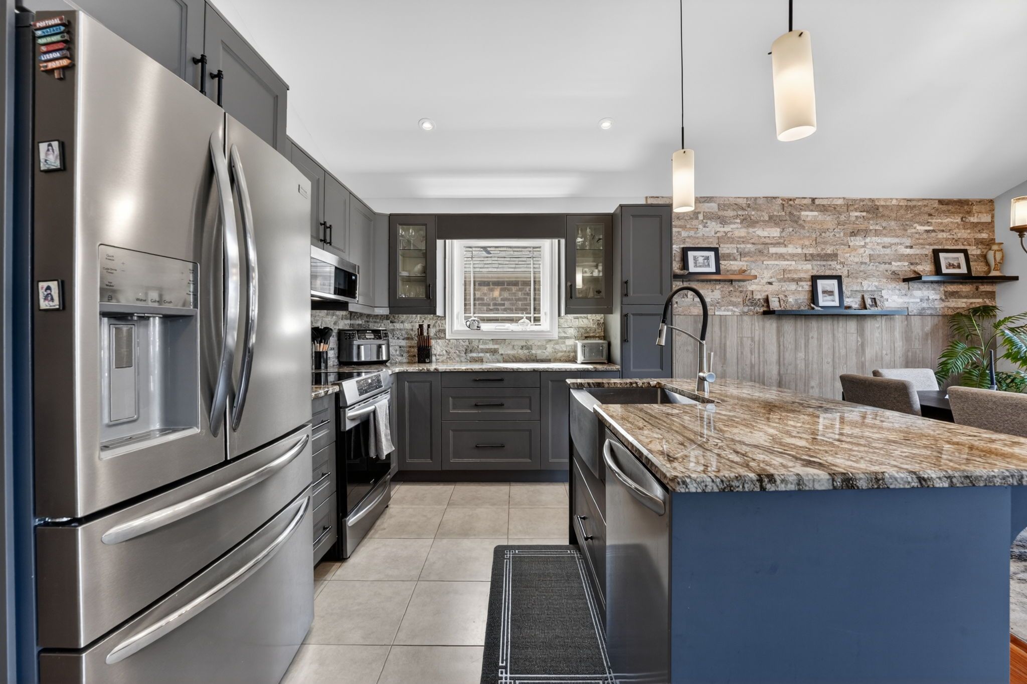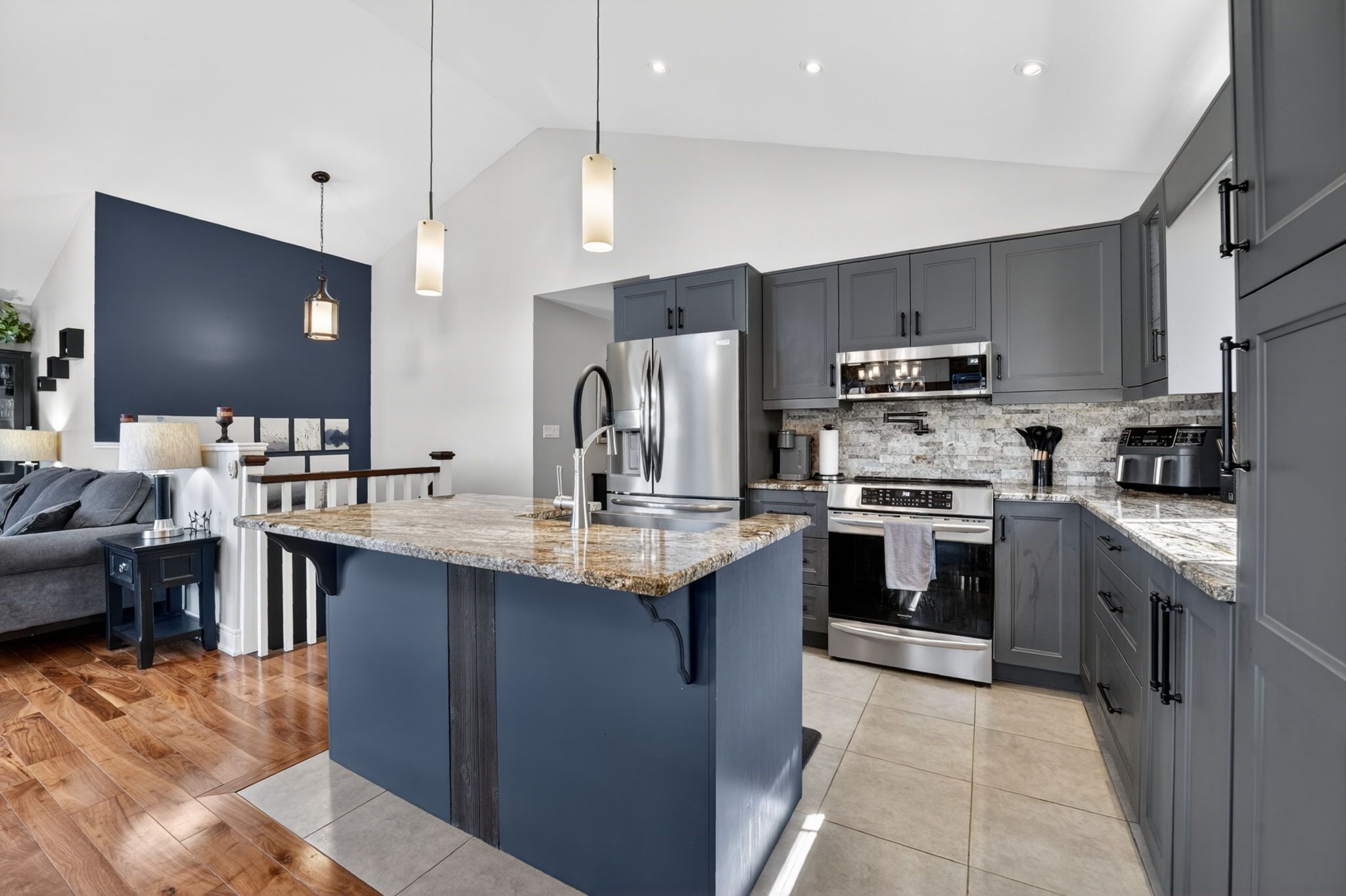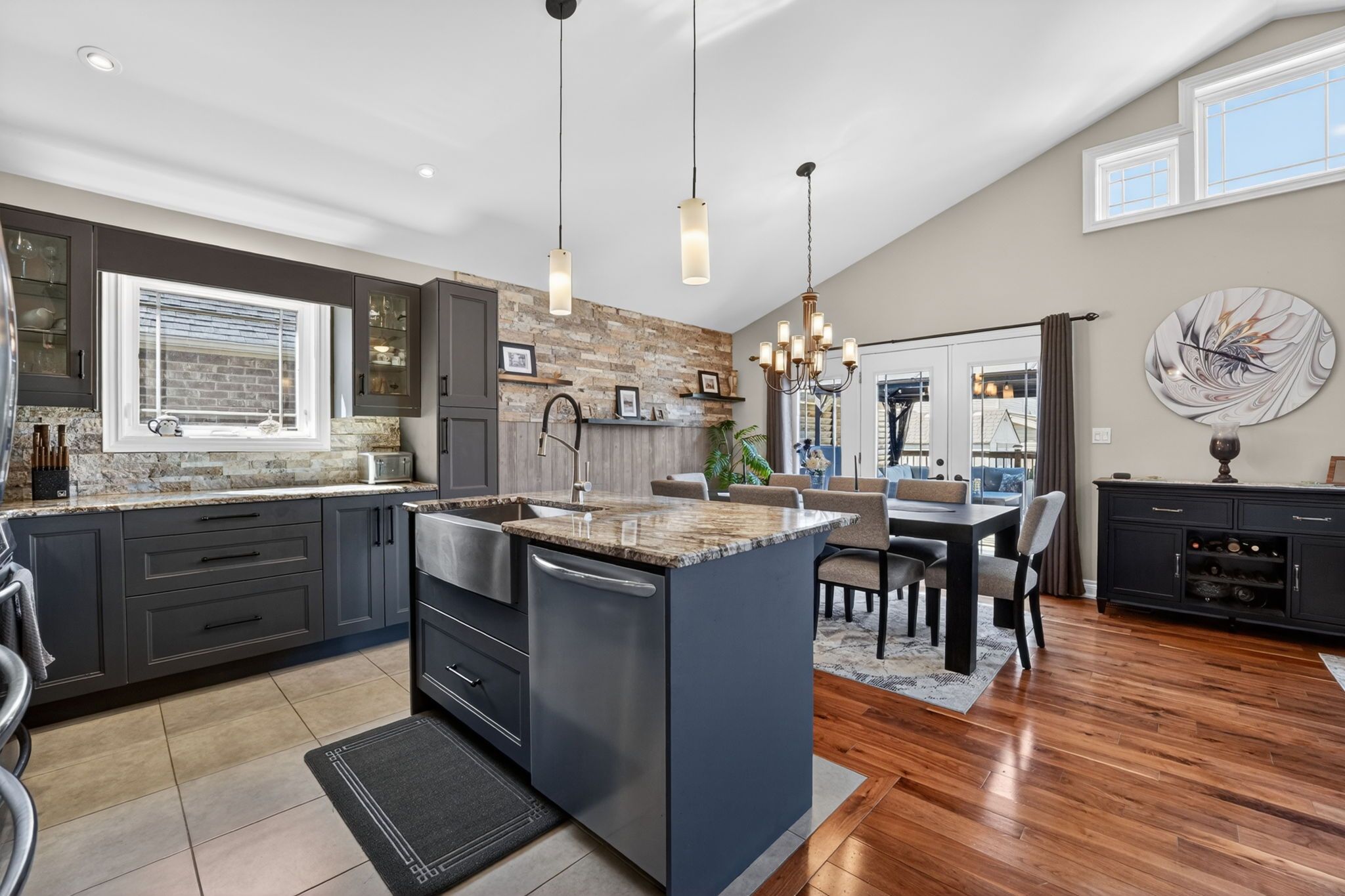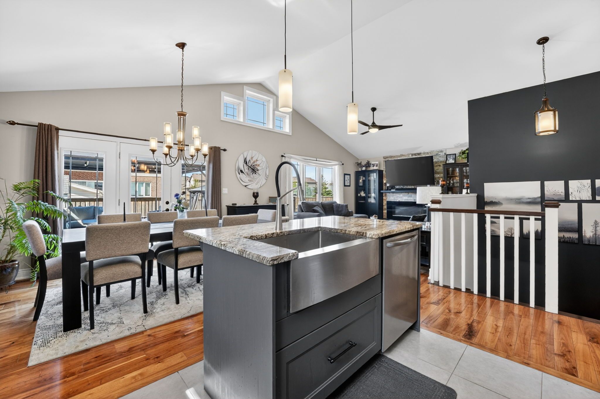 • Open concept kitchen with granite counters and eating island.