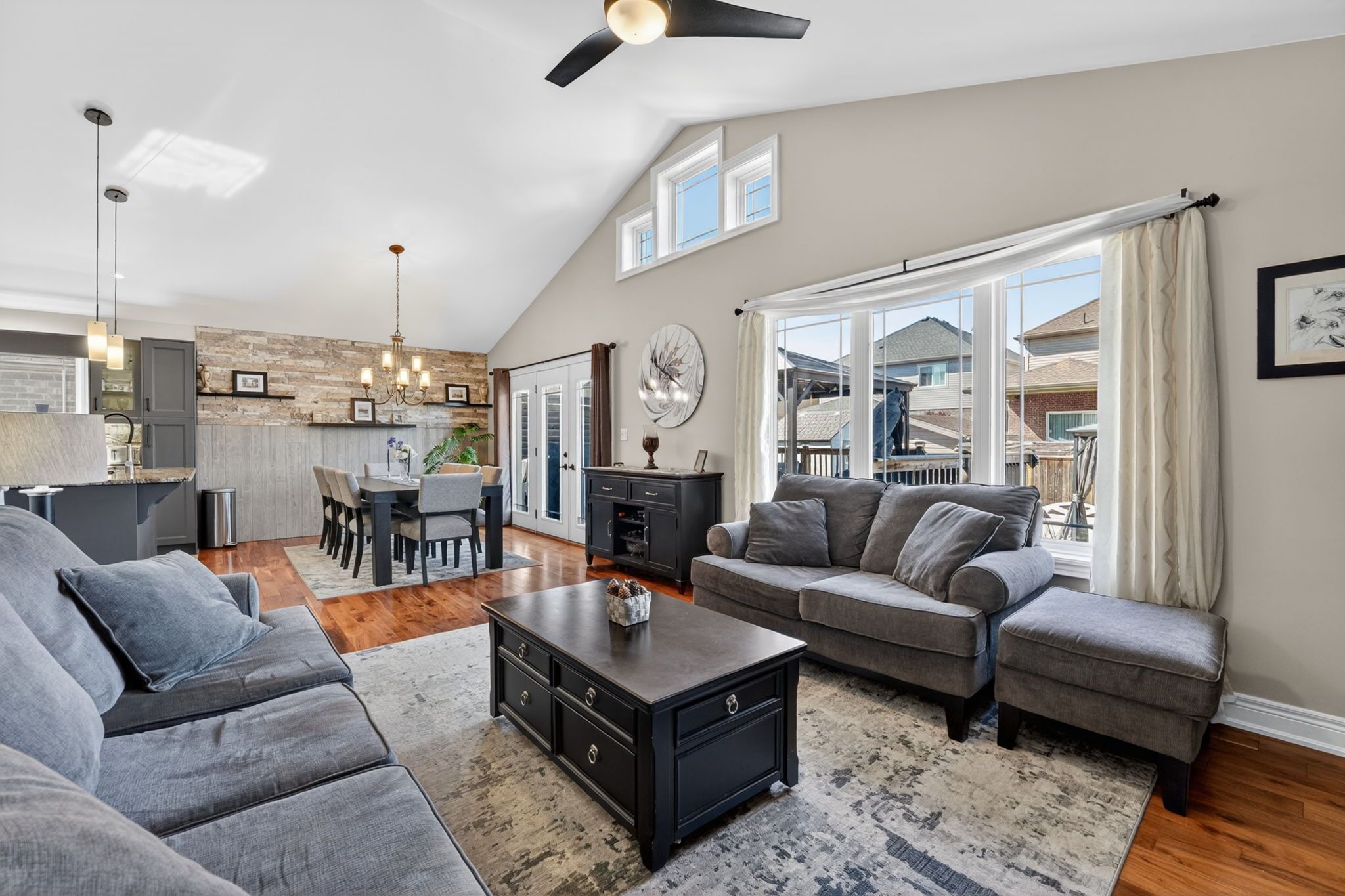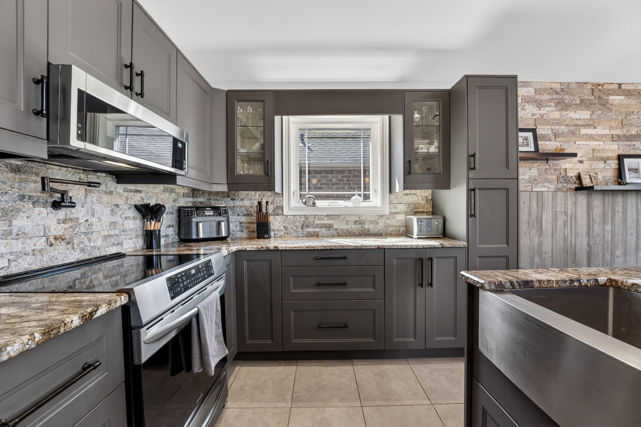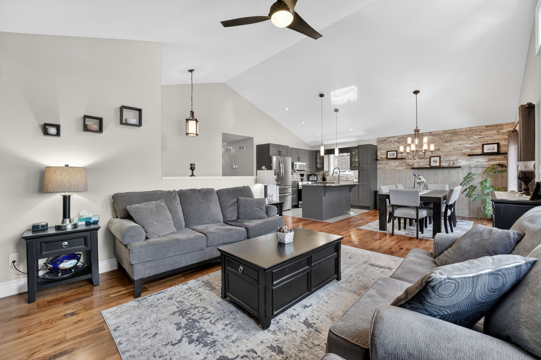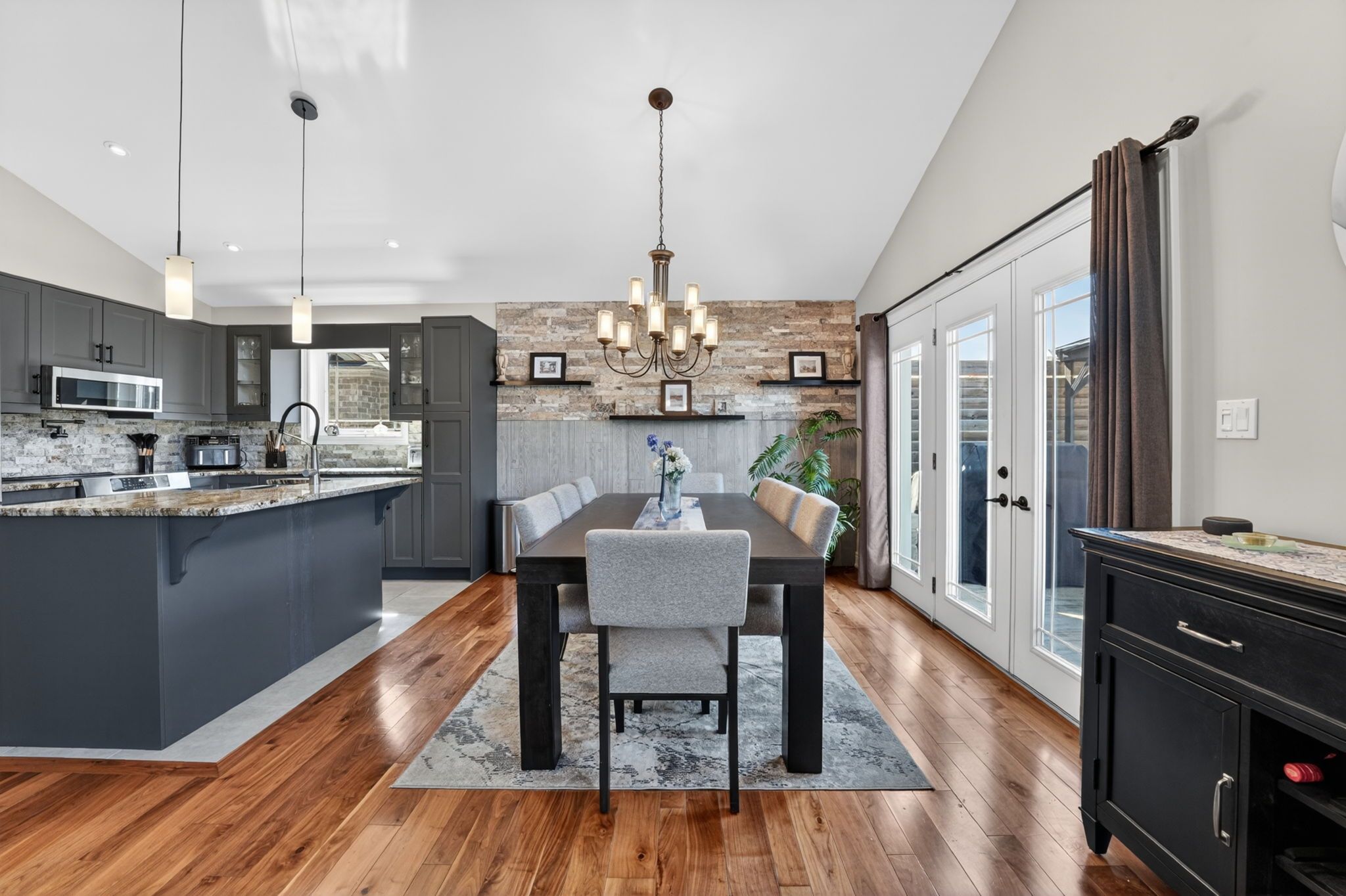 • Open concept kitchen with granite counters and eating island.