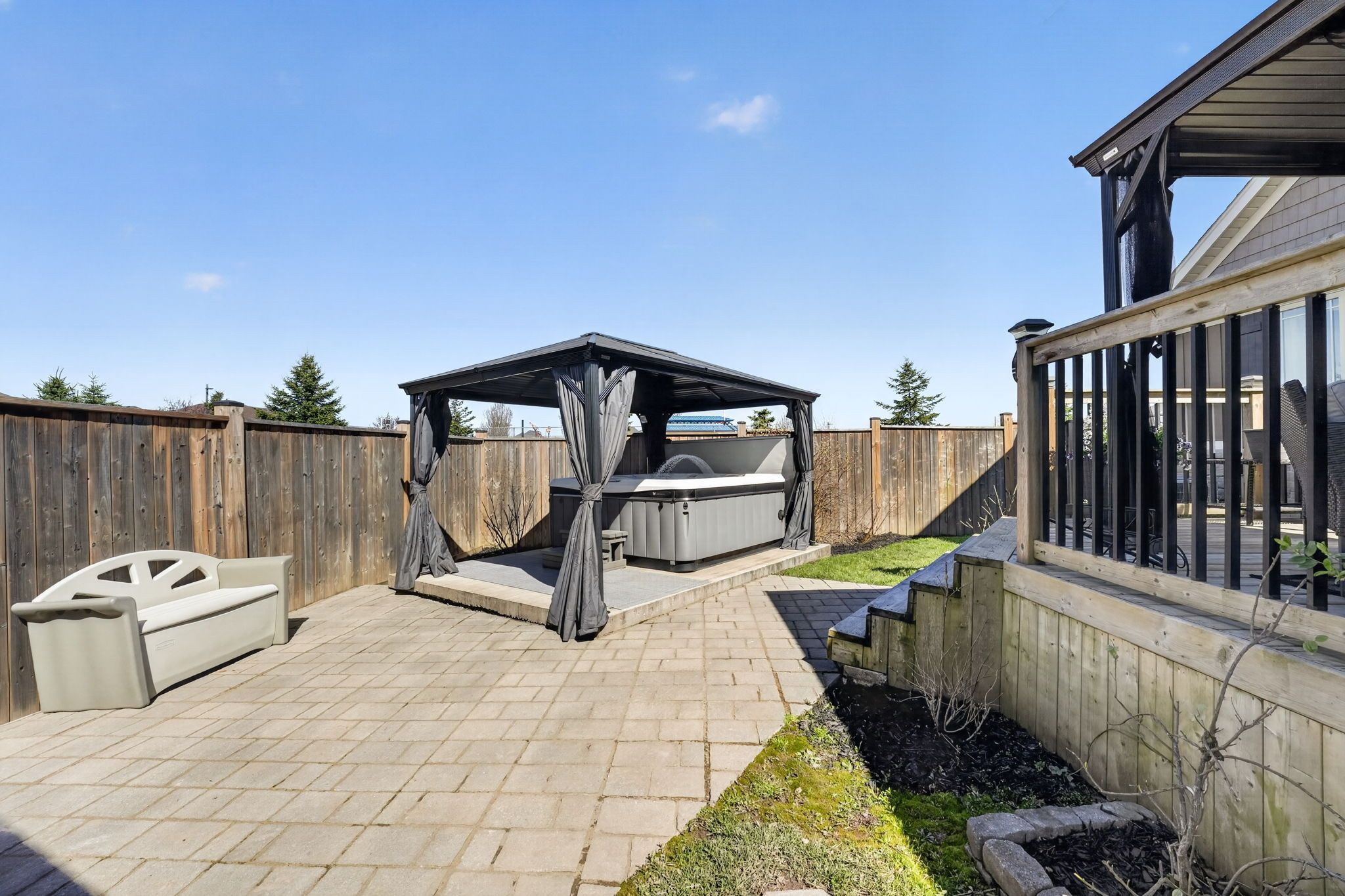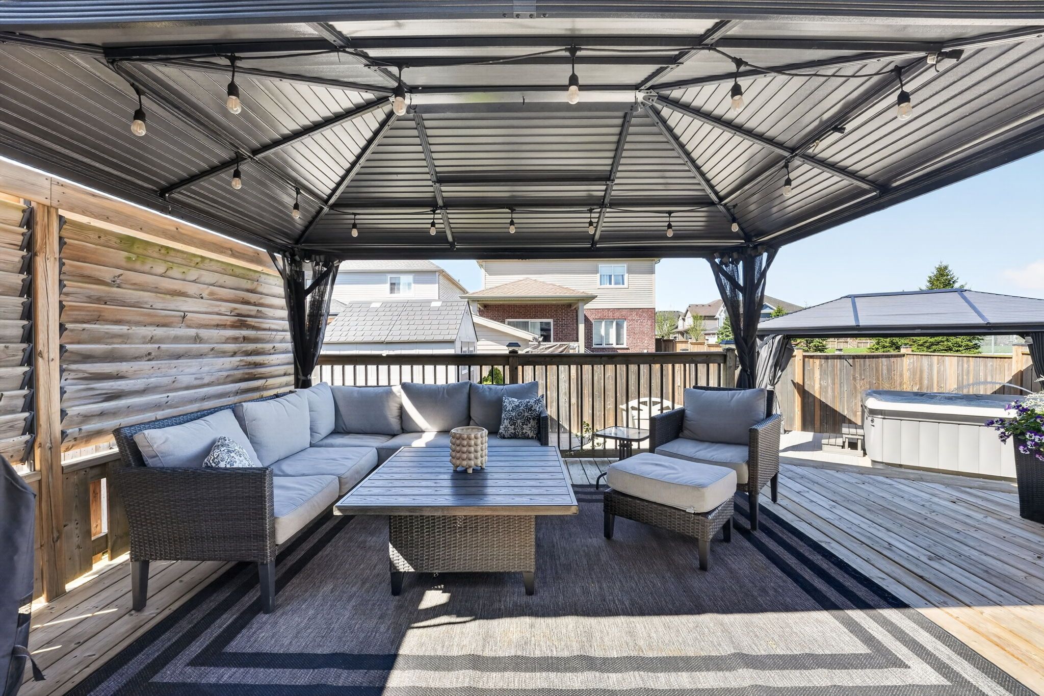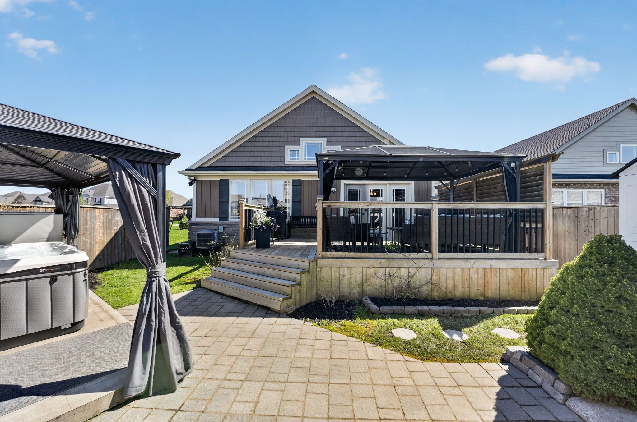 • Large deck with gazebo and hot tub for outdoor relaxation.