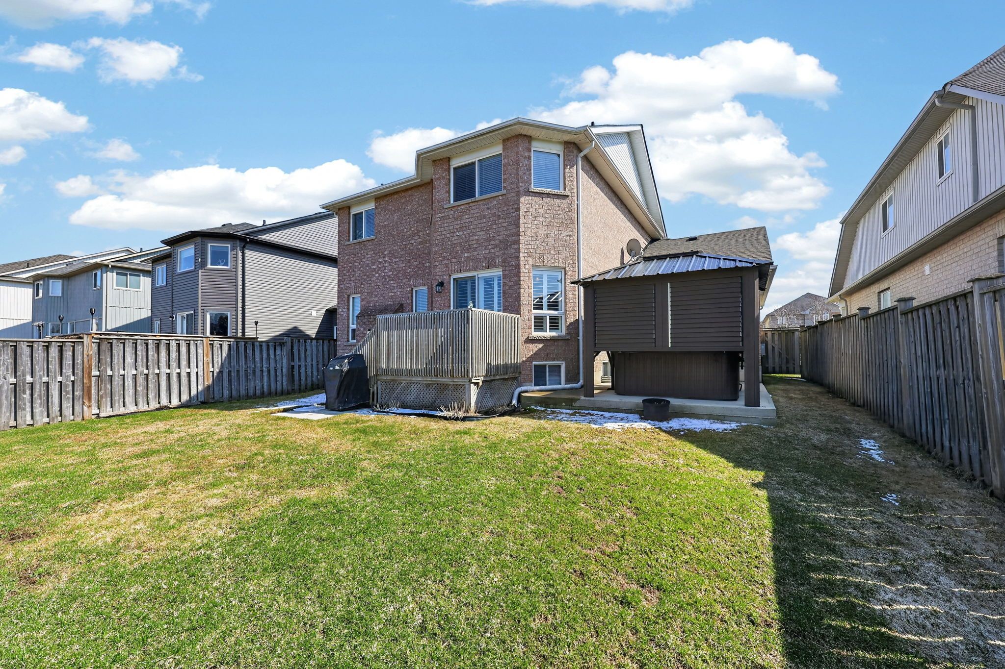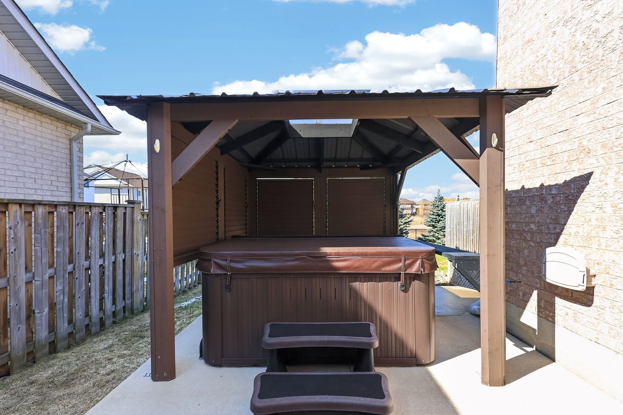 • Tranquil backyard with a private hot tub under a gazebo.