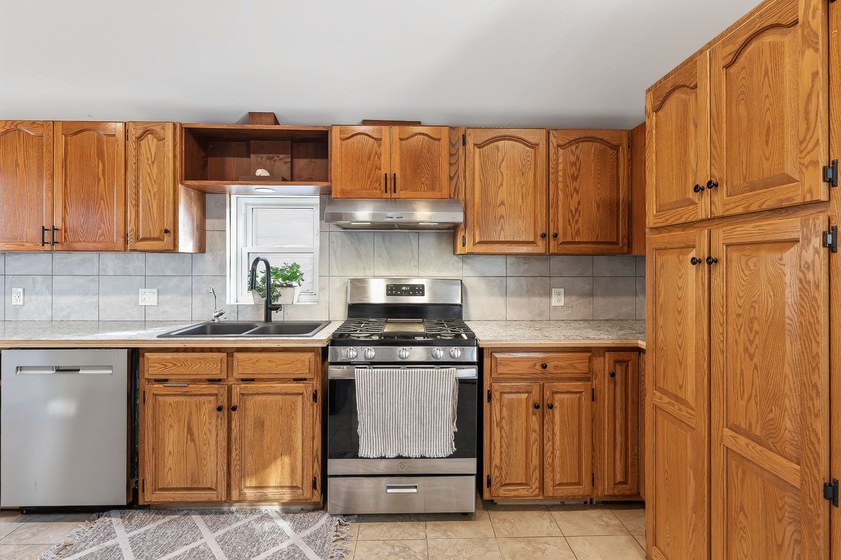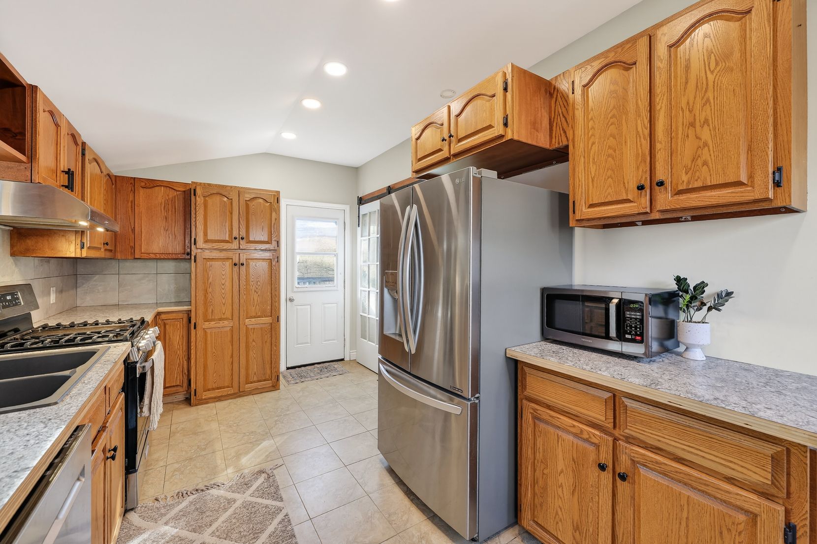 • Large kitchen with stainless steel appliances and gas stove.
