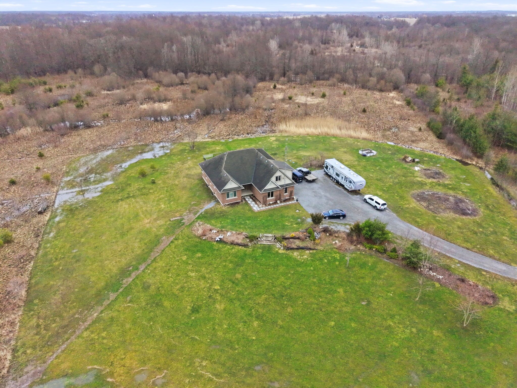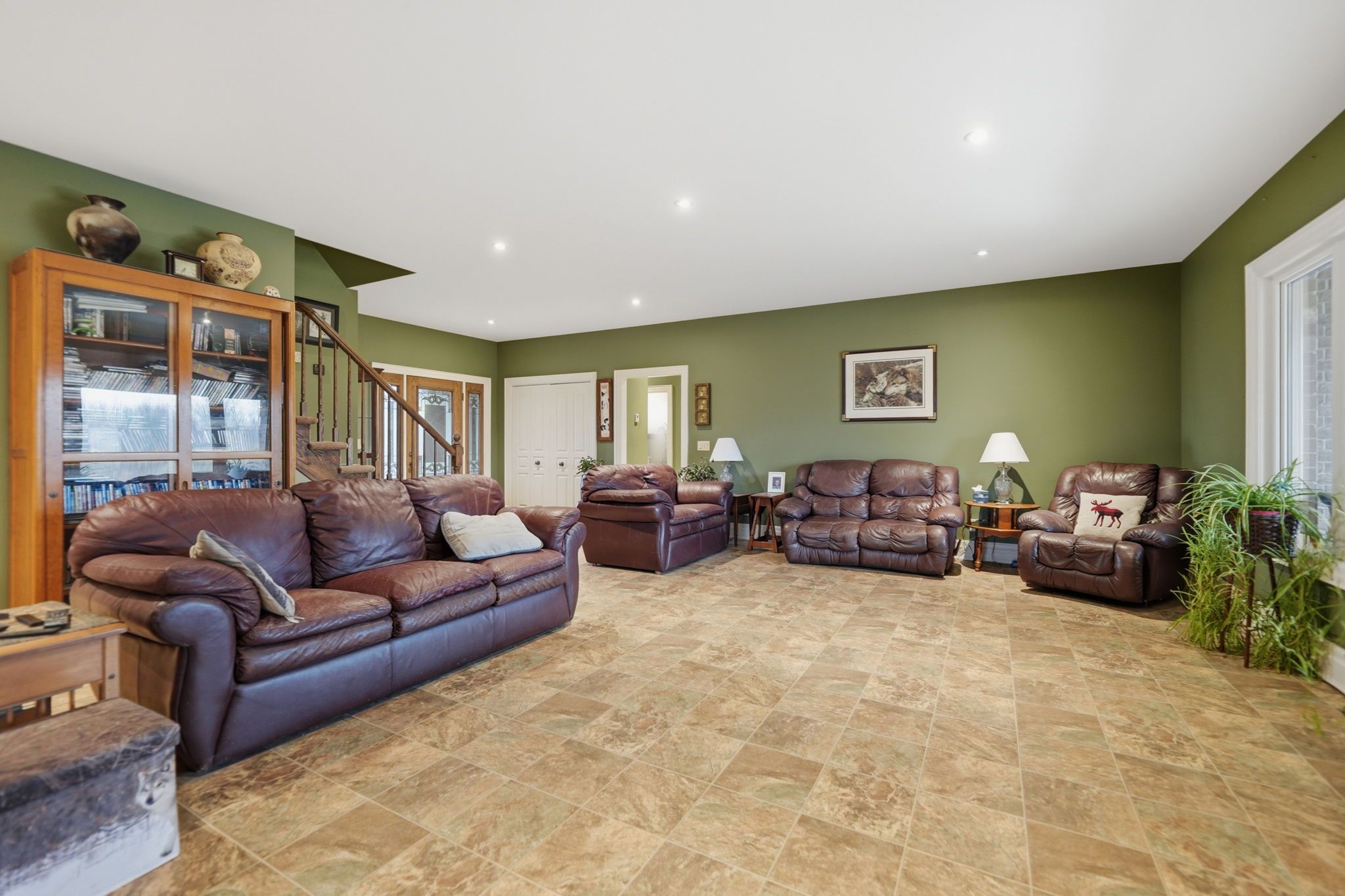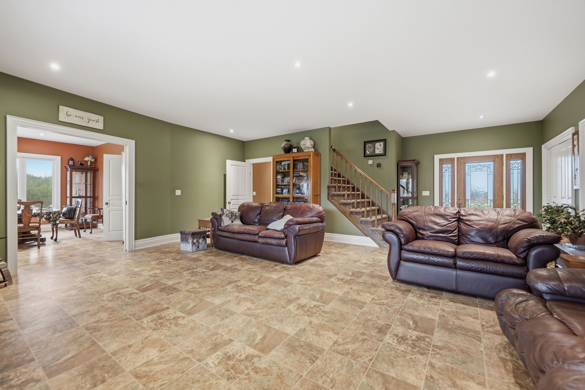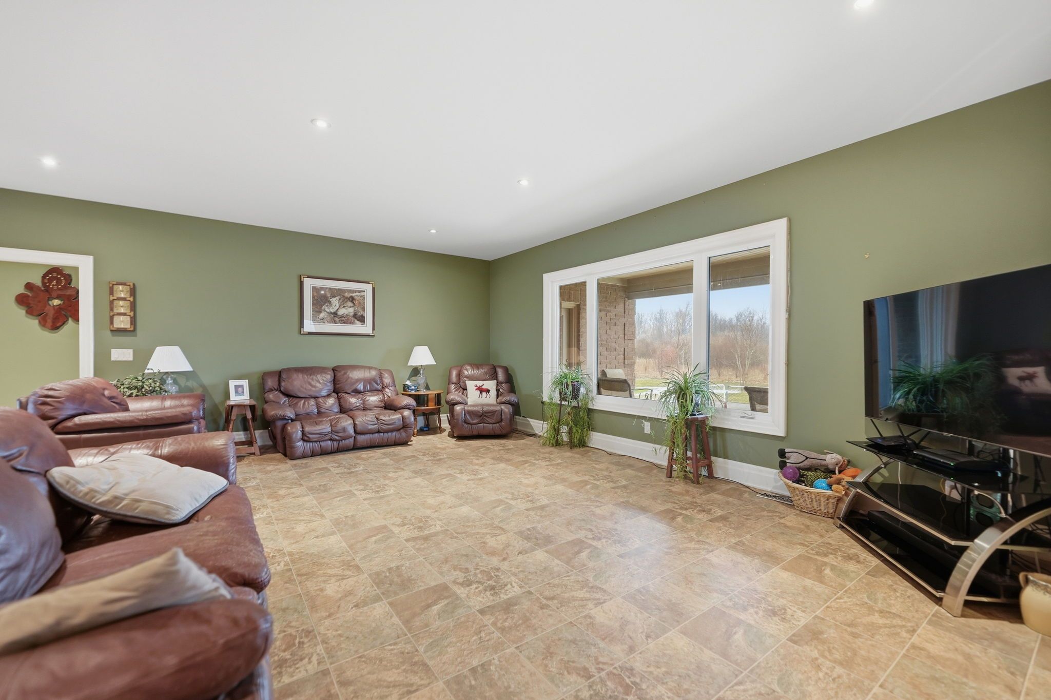 Set on over 50 acres of picturesque countryside, this expansive custom built home offers the perfect blend of space, comfort, and privacy. With 2,476 sq ft above grade and an additional 2,289 sq ft of fully finished living space below, there's room for the whole family and more. The main level features a spacious primary bedroom retreat complete with a luxurious 4-piece ensuite, including heated floors and a heated jacuzzi tub-perfect for unwinding after a long day. A second bedroom on the main floor provides added flexibility for guests, family, or a home office. The bright and inviting living room showcases serene views of the forested backyard, creating a peaceful, nature-filled backdrop. The large kitchen is designed for both everyday living and entertaining, offering granite countertops, abundant natural light, a built-in 5-burner gas cooktop with range hood, and a convenient wall oven and microwave combo. A reverse osmosis system at the kitchen sink adds an extra touch of quality. The fully finished basement expands your living space with three generously sized bedrooms, a spacious recreation room, a versatile bonus room ideal for a home office, gym, or hobby space, and a 4-piece bathroom. Additional features include a rare 2-car garage with single doors and a scenic pond on the property, enhancing the natural beauty and charm of this incredible rural setting. A truly unique opportunity to own a substantial home on a breathtaking parcel of land-ideal for those seeking space, privacy, and a connection to nature.