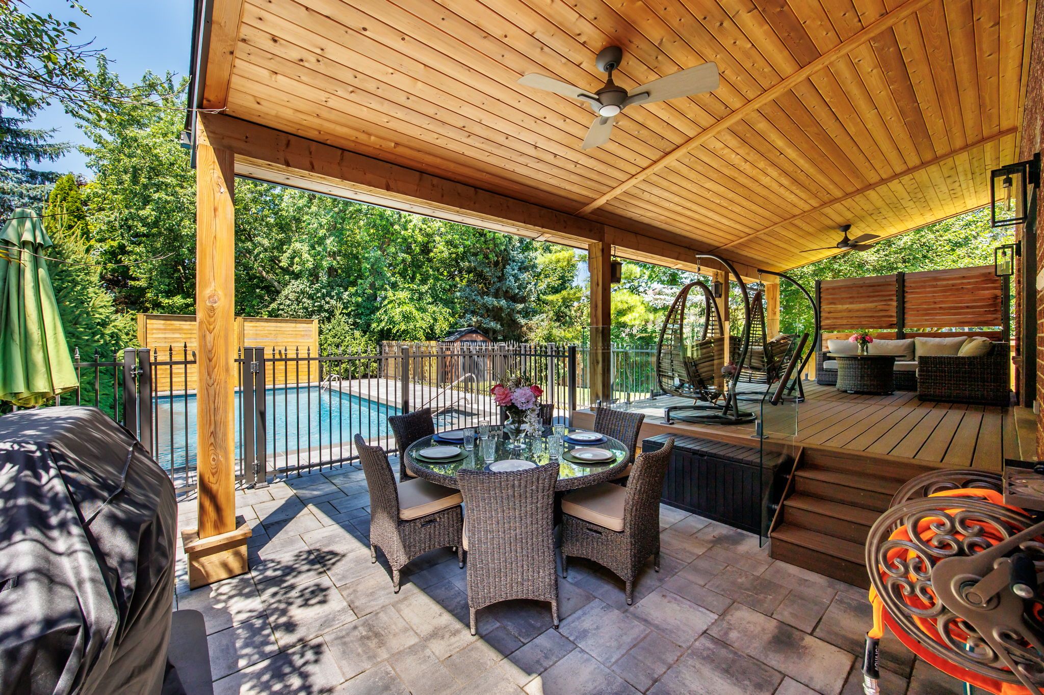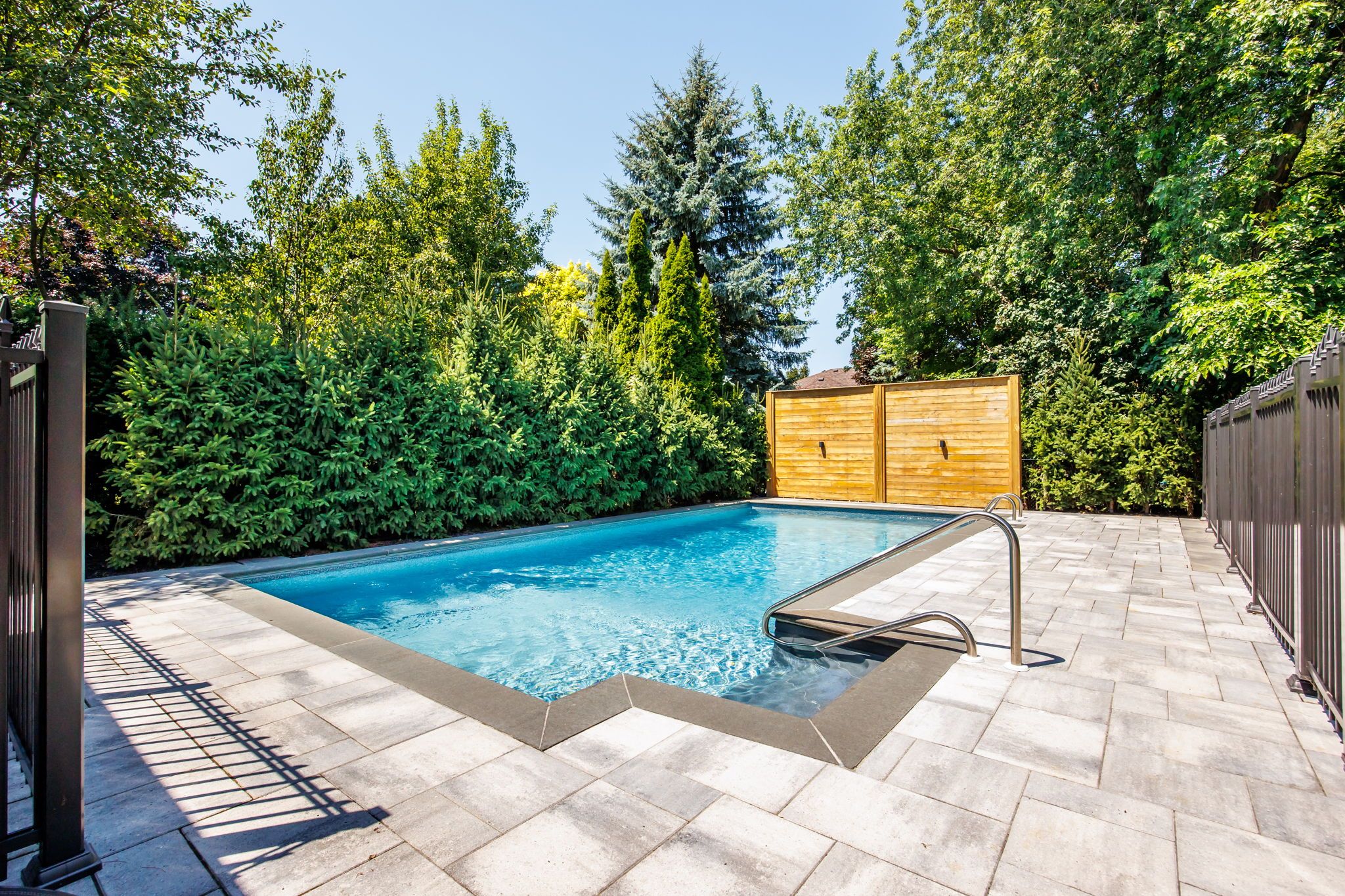 • Private backyard with a heated saltwater pool and landscaped surroundings.