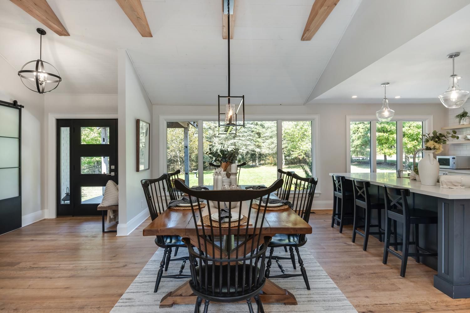 • Massive windows allowing natural light and connecting indoor and outdoor spaces.