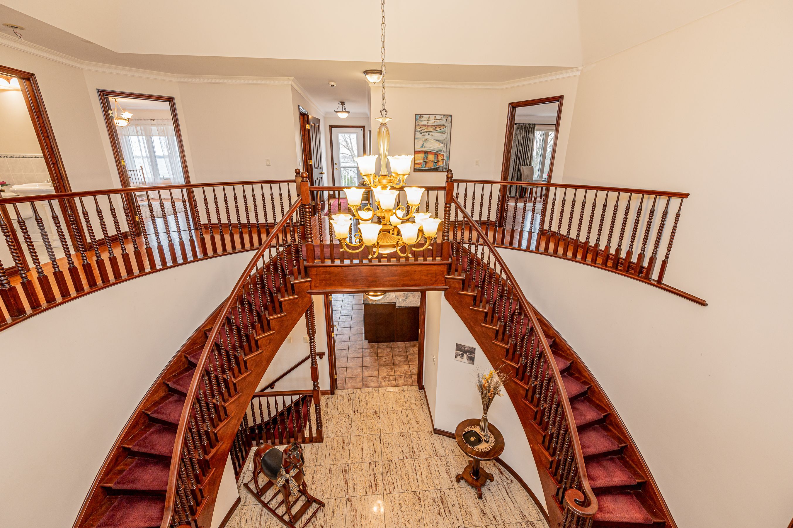 • Grand foyer with high ceilings and elegant double curved staircase.