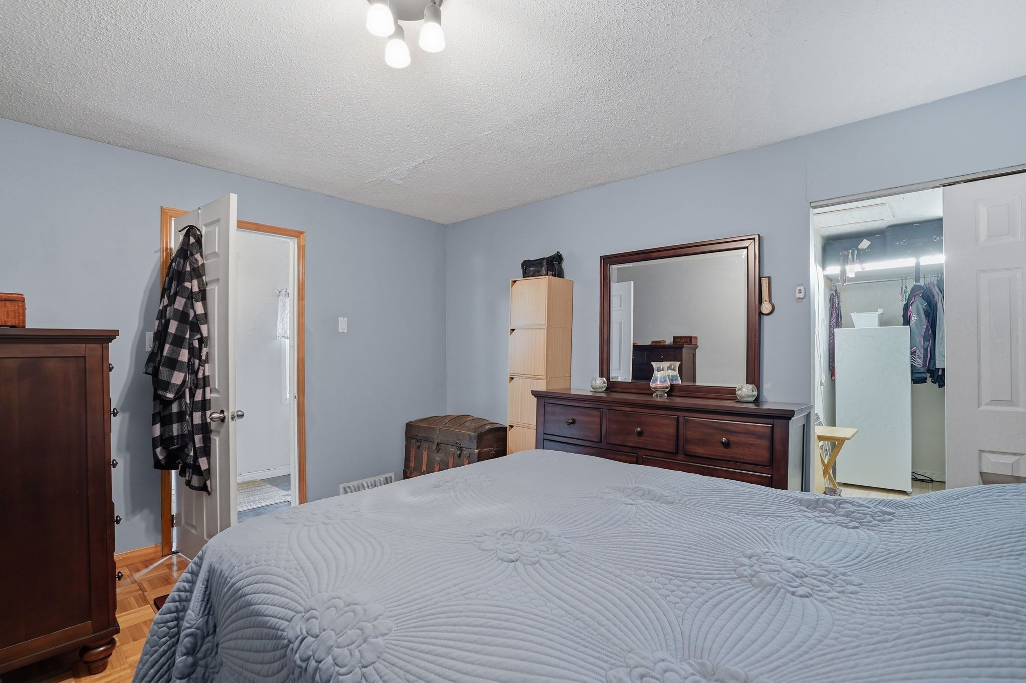 • Spacious primary bedroom with walk-in closet for added storage.