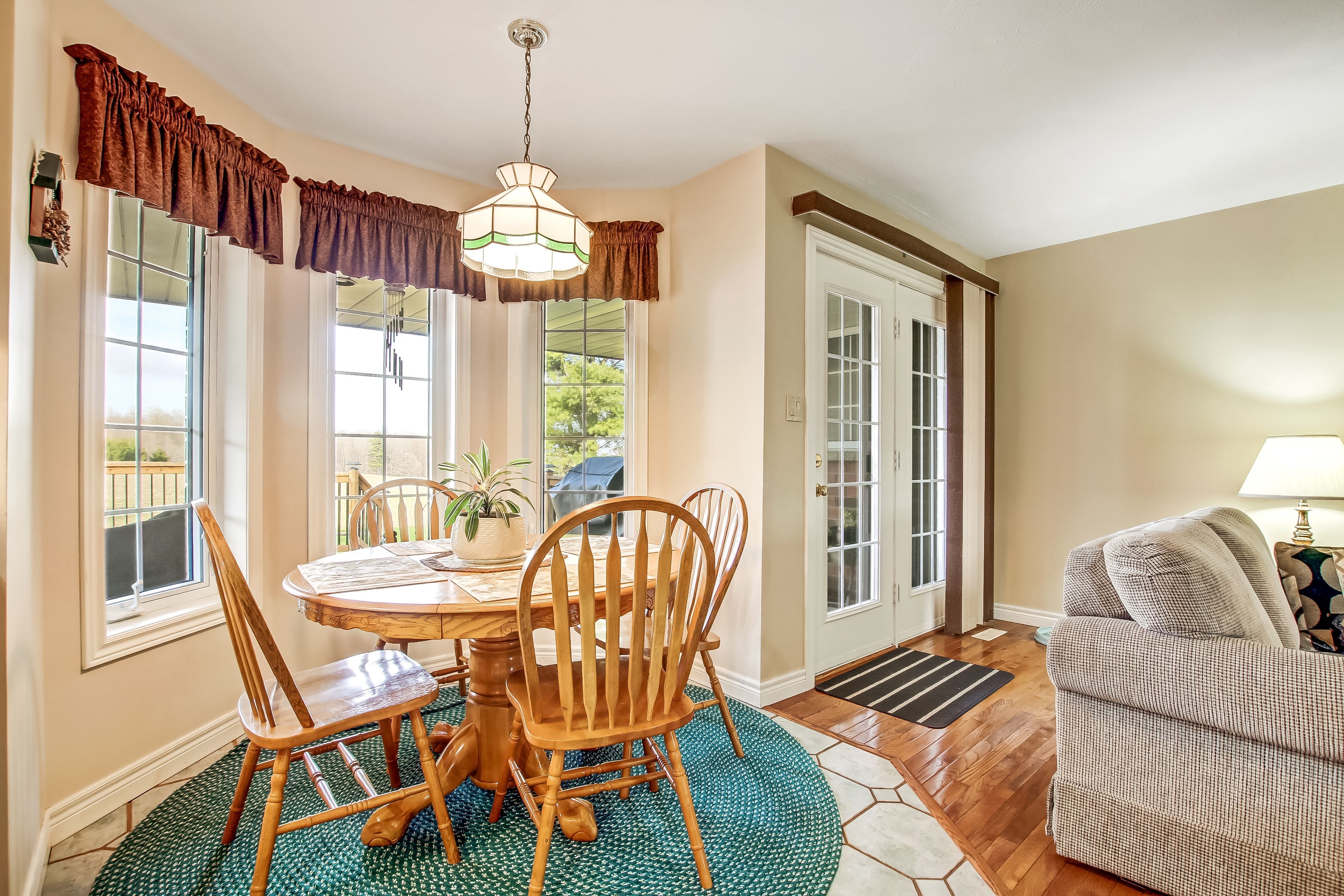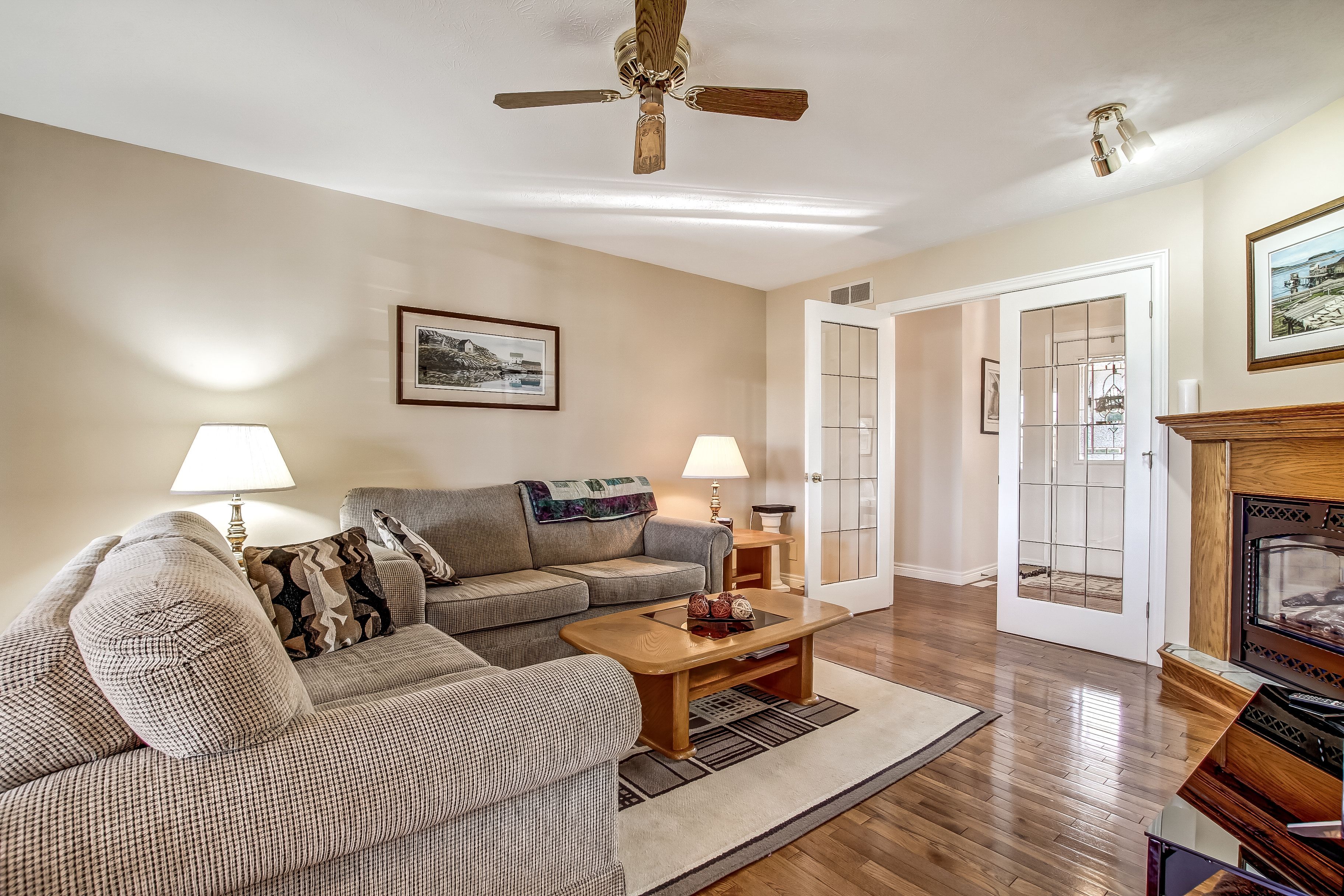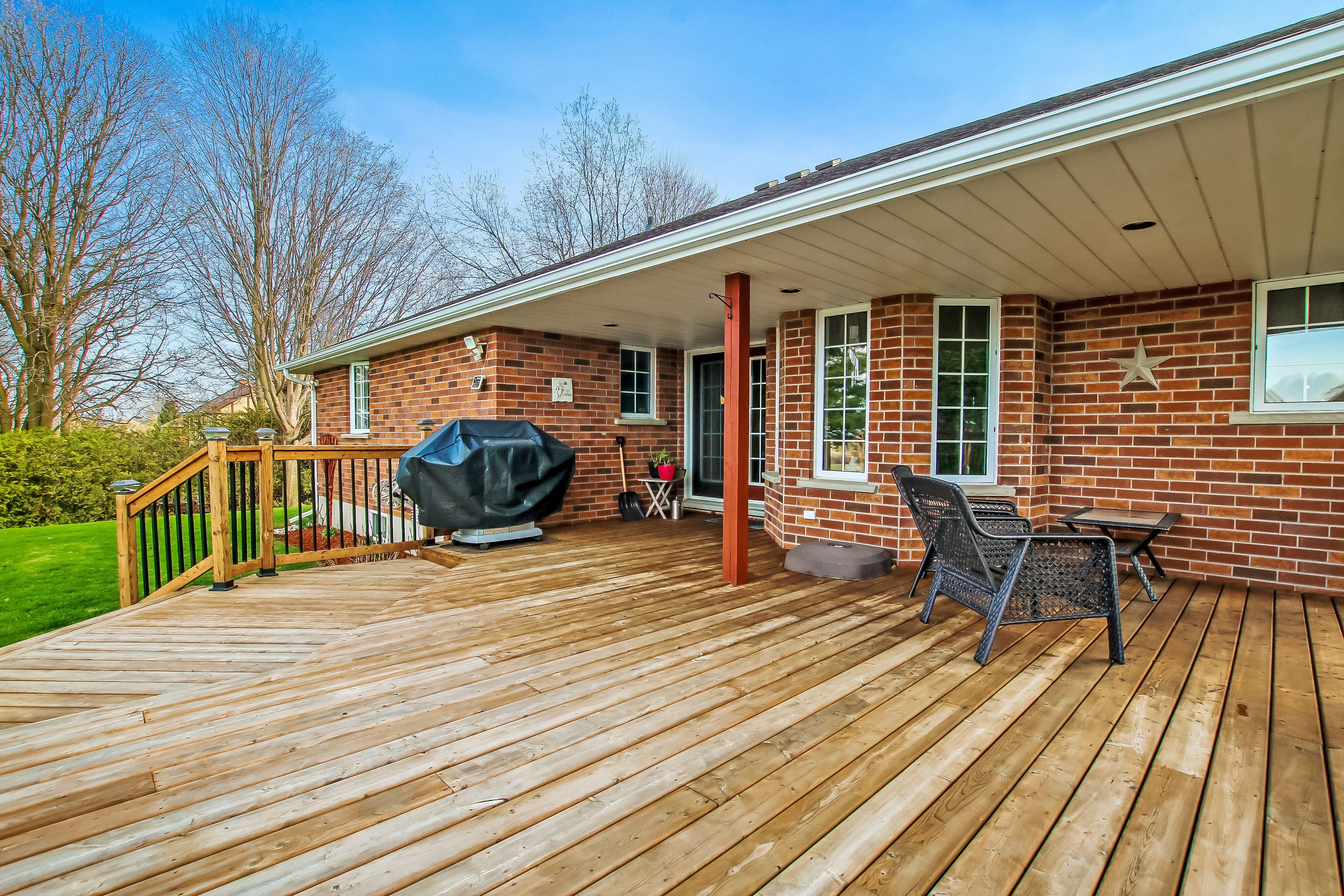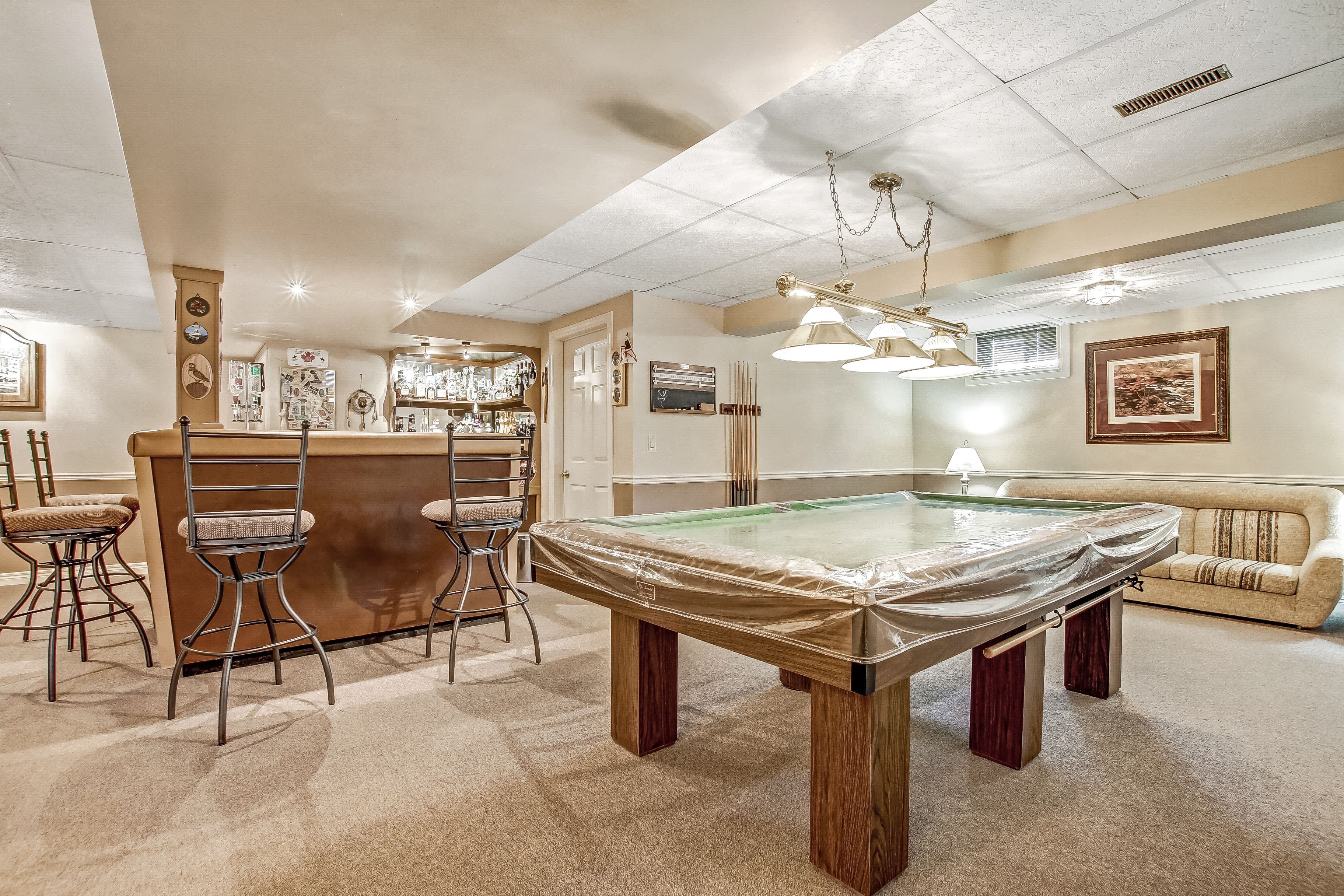 This unique custom built home is ready for a new family. Hardwood floors in the main living area and ceramic in the kitchen. Beautiful maple cabinetry. 3 spacious bedrooms and a main floor family room with a gas fireplace. Beveled glass french doors for added privacy in the family room. Corion countertops in the kitchen and baths. 3 full baths with a beautiful new shower in the ensuite. Most of the lower level is finished. It features a built in bar with a wet sink. The pool table is optional. Two car garage with opener & remote. Wait until you see the yard! Patio doors to a large deck overlooking a farm field and a view that seems to run forever.