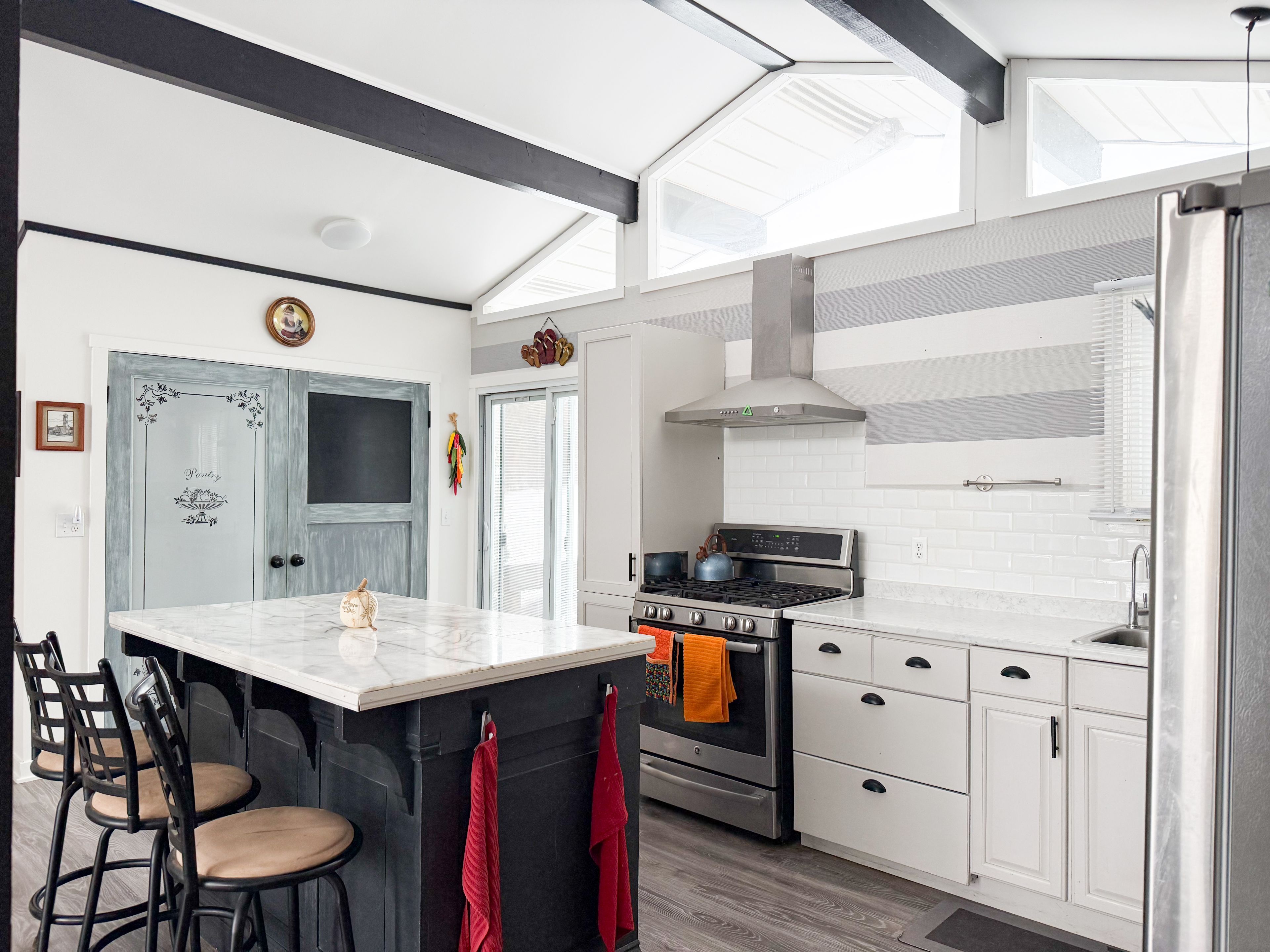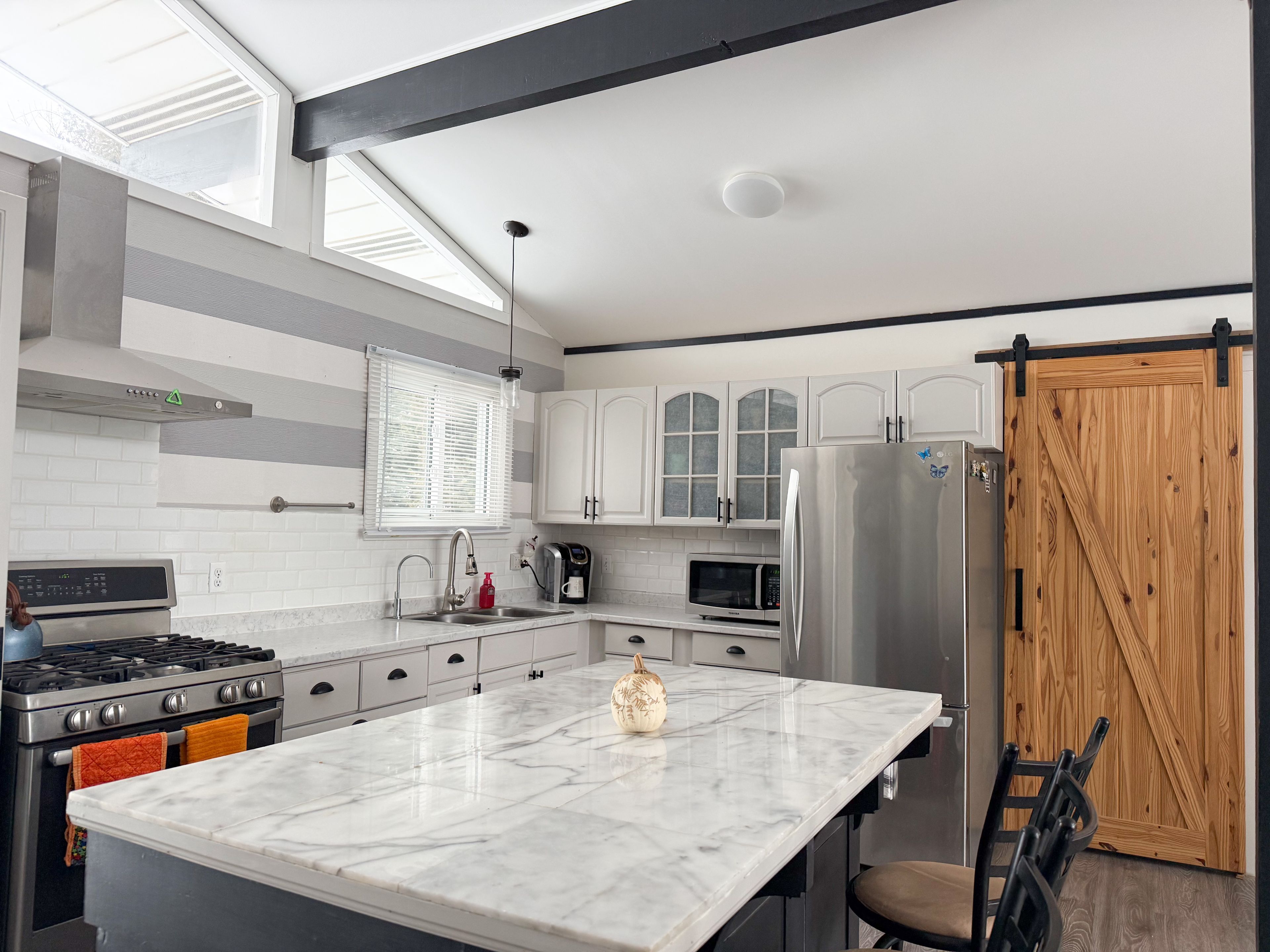 • Well-designed kitchen with stainless steel appliances and spacious island.