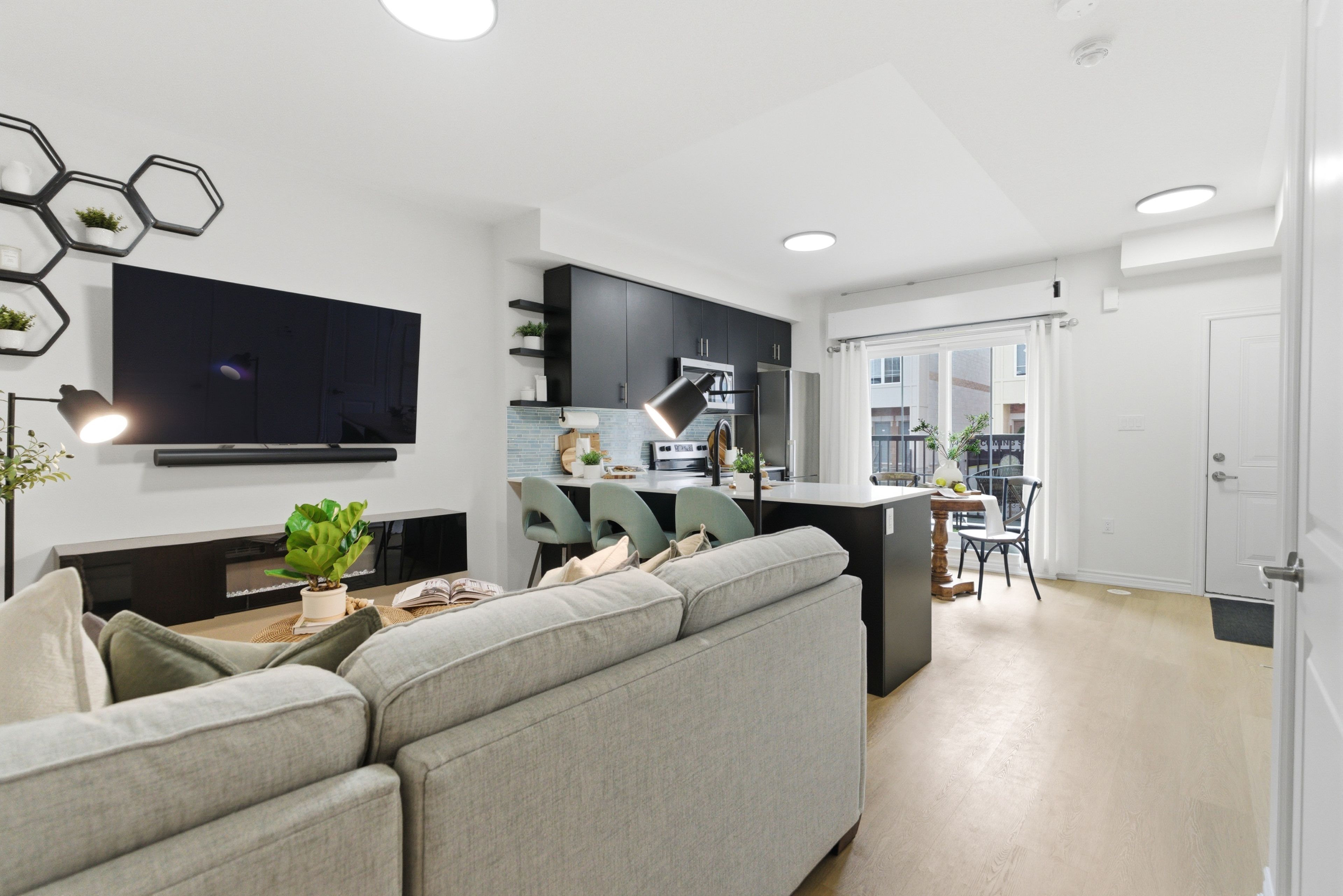 Just 4 years new, this beautiful two-level townhome offers a thoughtfully designed, open-concept main level that maximizes both space and flow. Vinyl flooring runs throughout the main floor, which also includes a convenient powder room and a large closet. The sleek, modern kitchen seamlessly connects to the living area, creating a bright and functional space ideal for both everyday living and entertaining. The living room is warm and inviting, and features an electric fireplace. The kitchen features a stylish backsplash, quartz countertops, stainless steel appliances, and a peninsula with additional seating that naturally bridges the kitchen and living room. A walk-out from the kitchen leads to a cozy private balcony, the perfect spot to enjoy your morning coffee. The lower level features two bedrooms with above-grade windows, a 4-piece bathroom, and convenient in-suite laundry. This home presents an excellent opportunity to own a modern townhome in a central location, just minutes to all amenities, transit, highway 401, and nearby running paths!