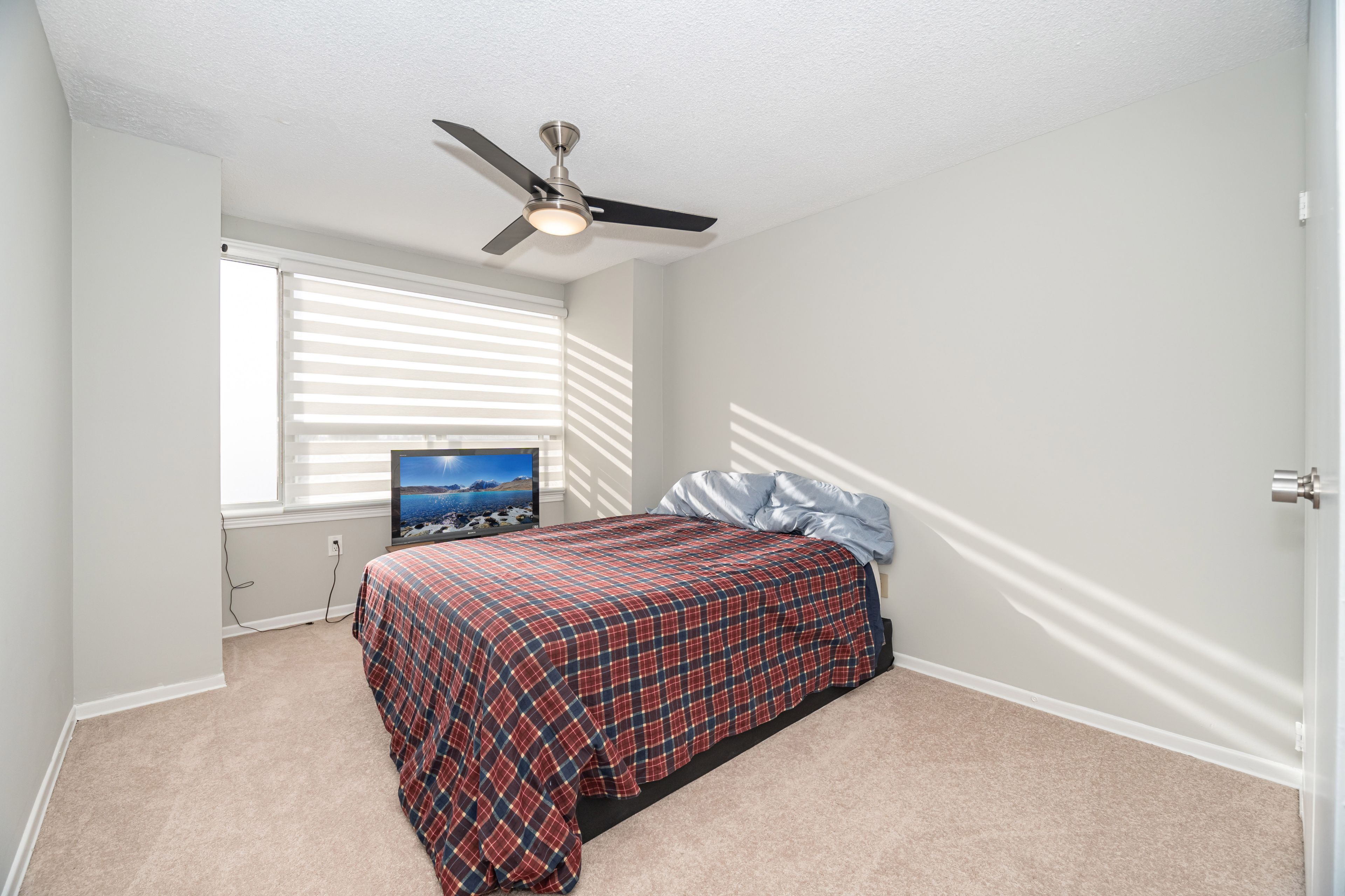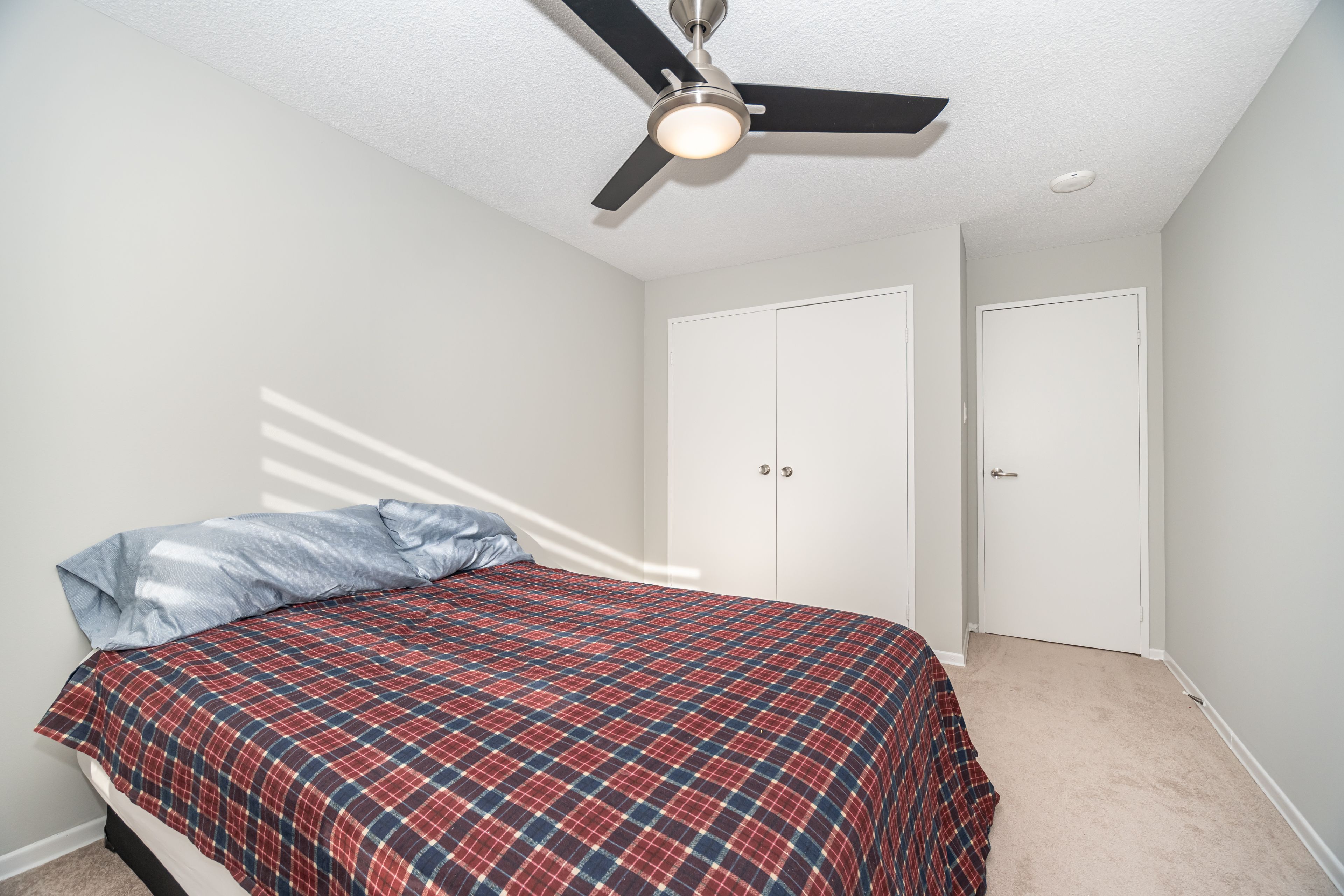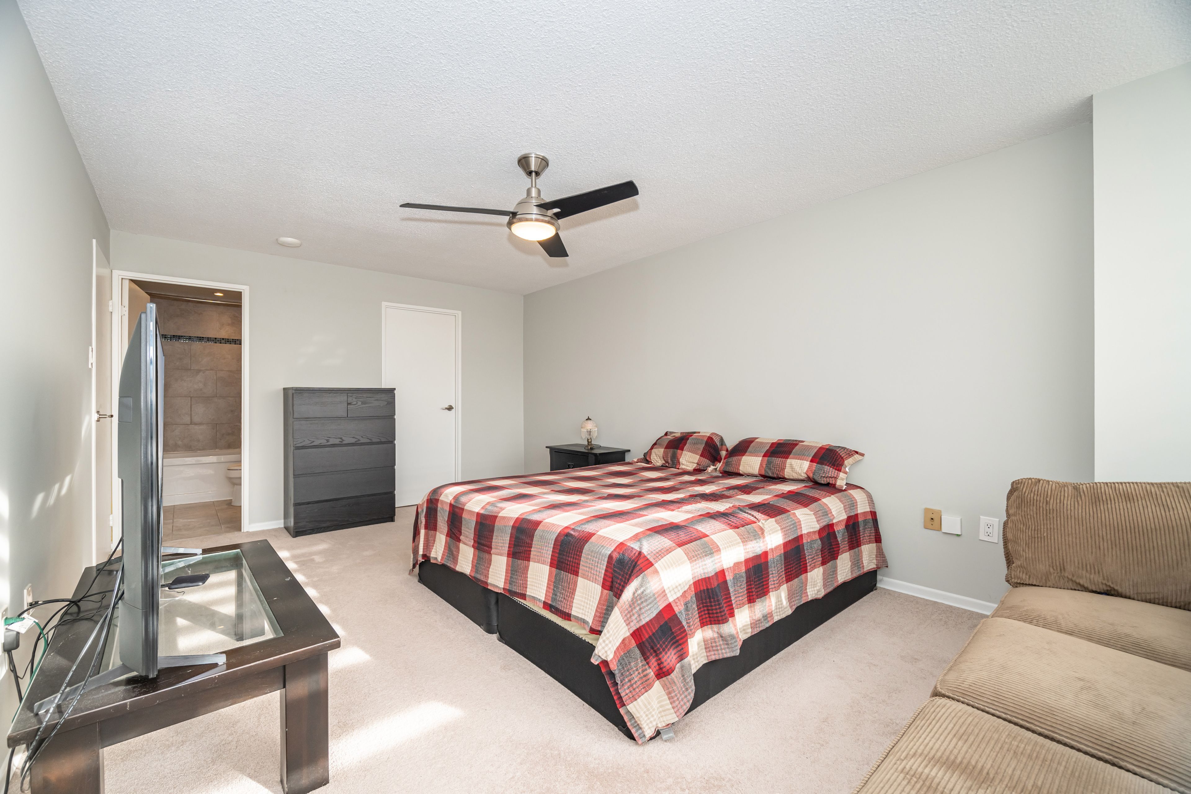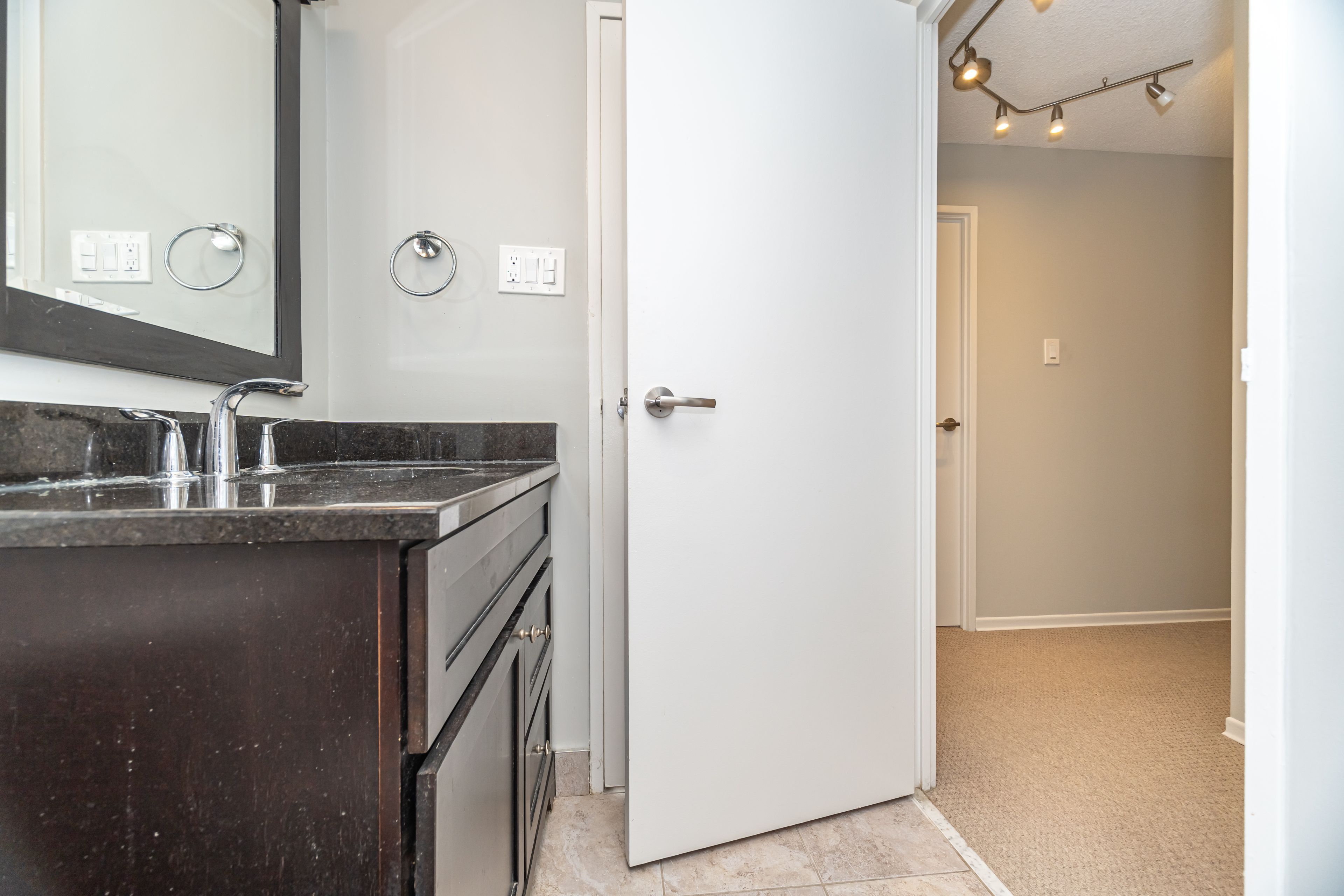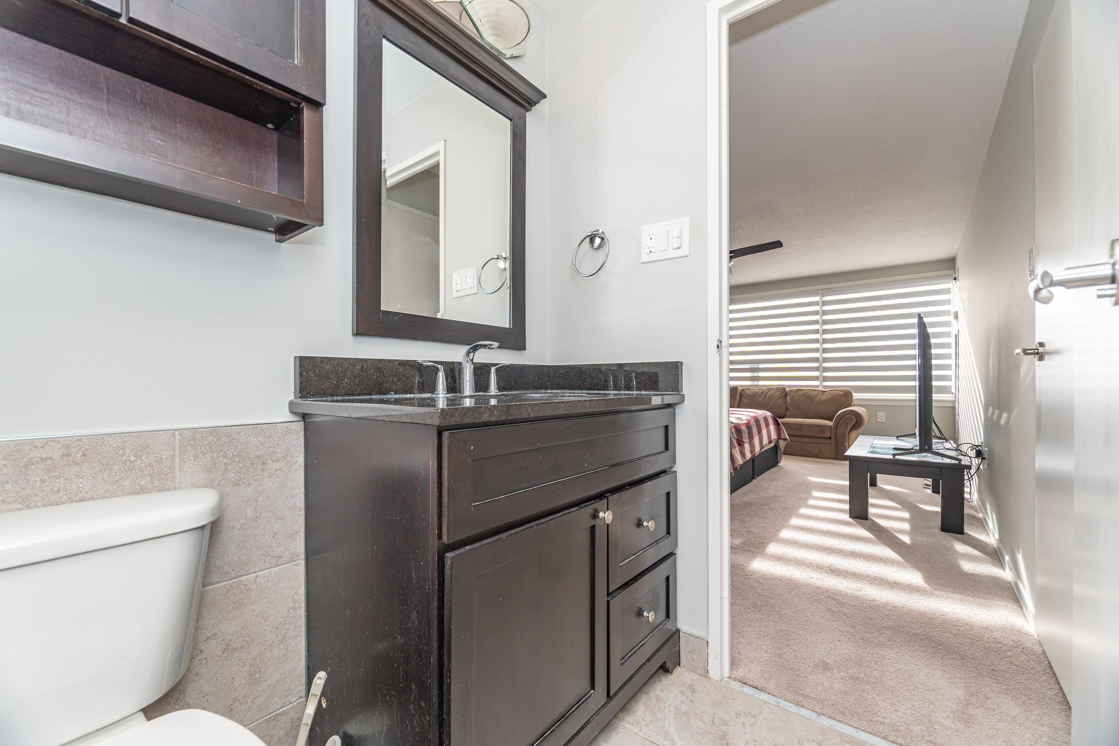 • Semi-ensuite bathroom includes granite counter and undermount sink.