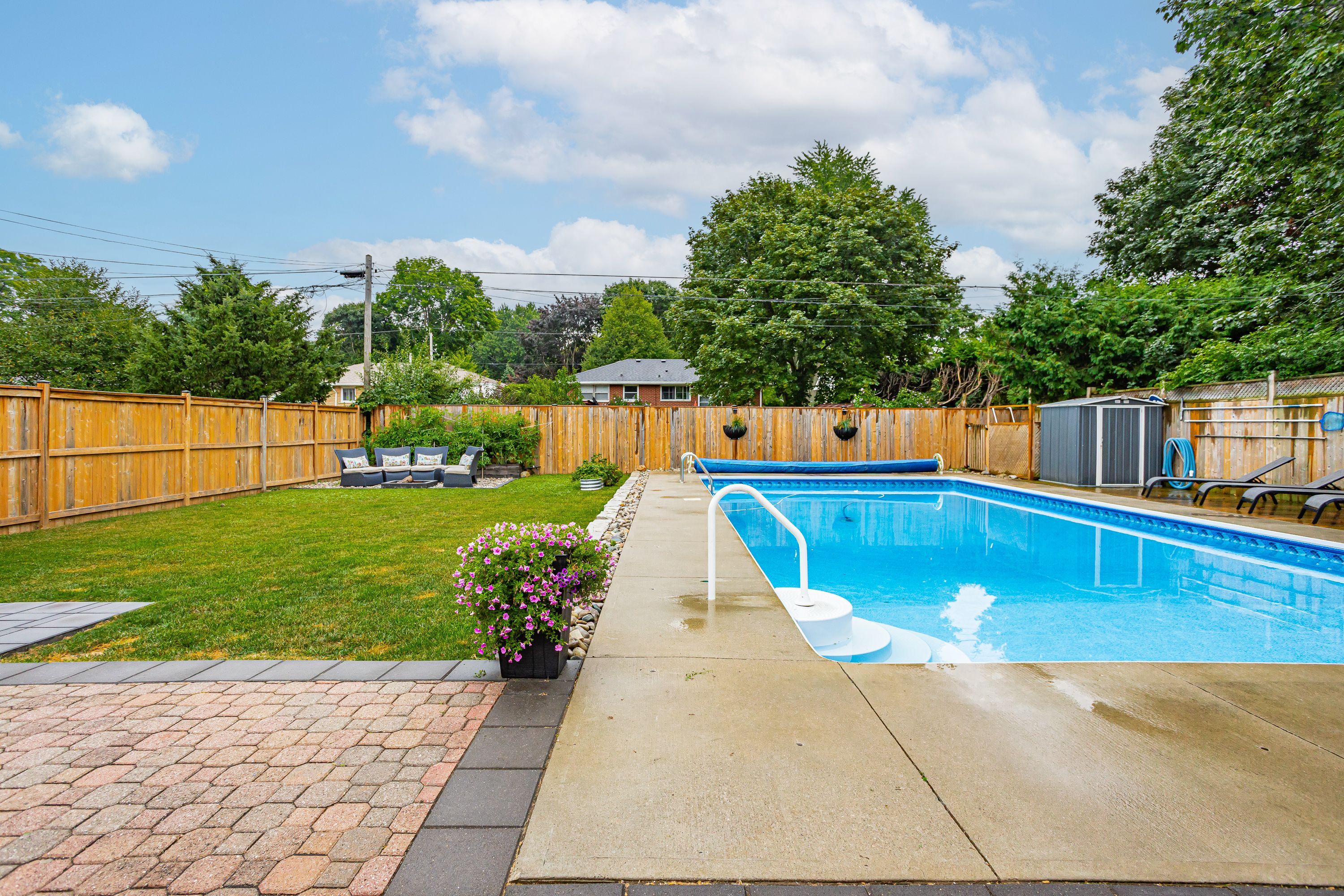 • Multiple seating areas and grassy space ideal for outdoor activities.