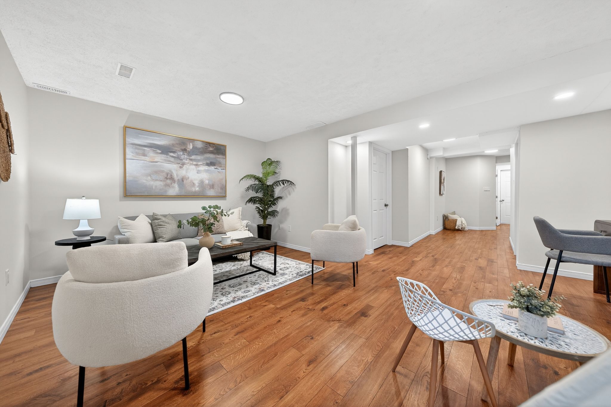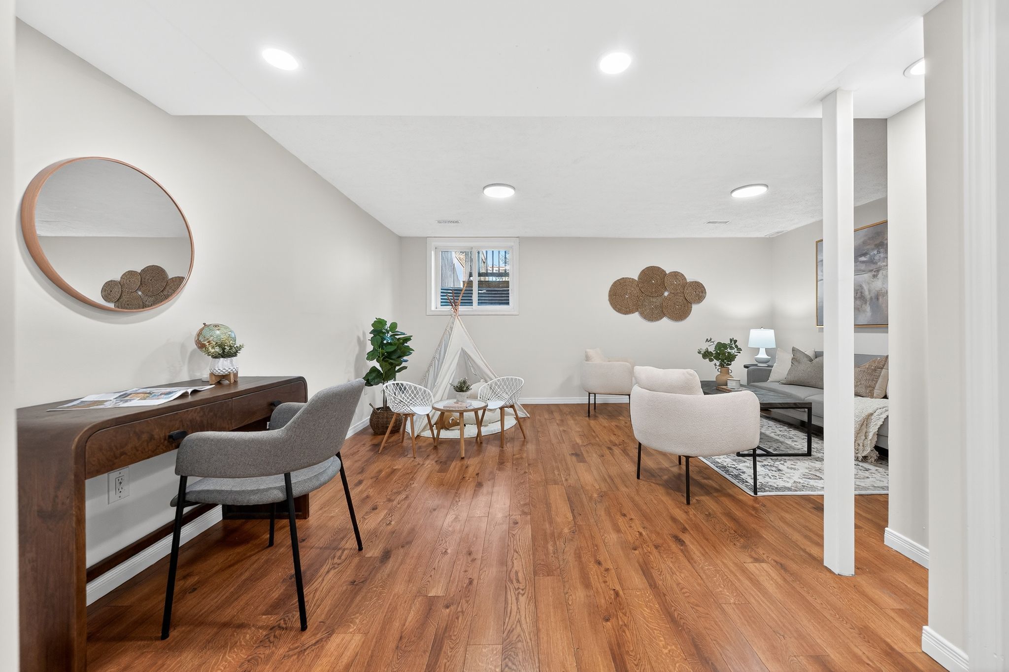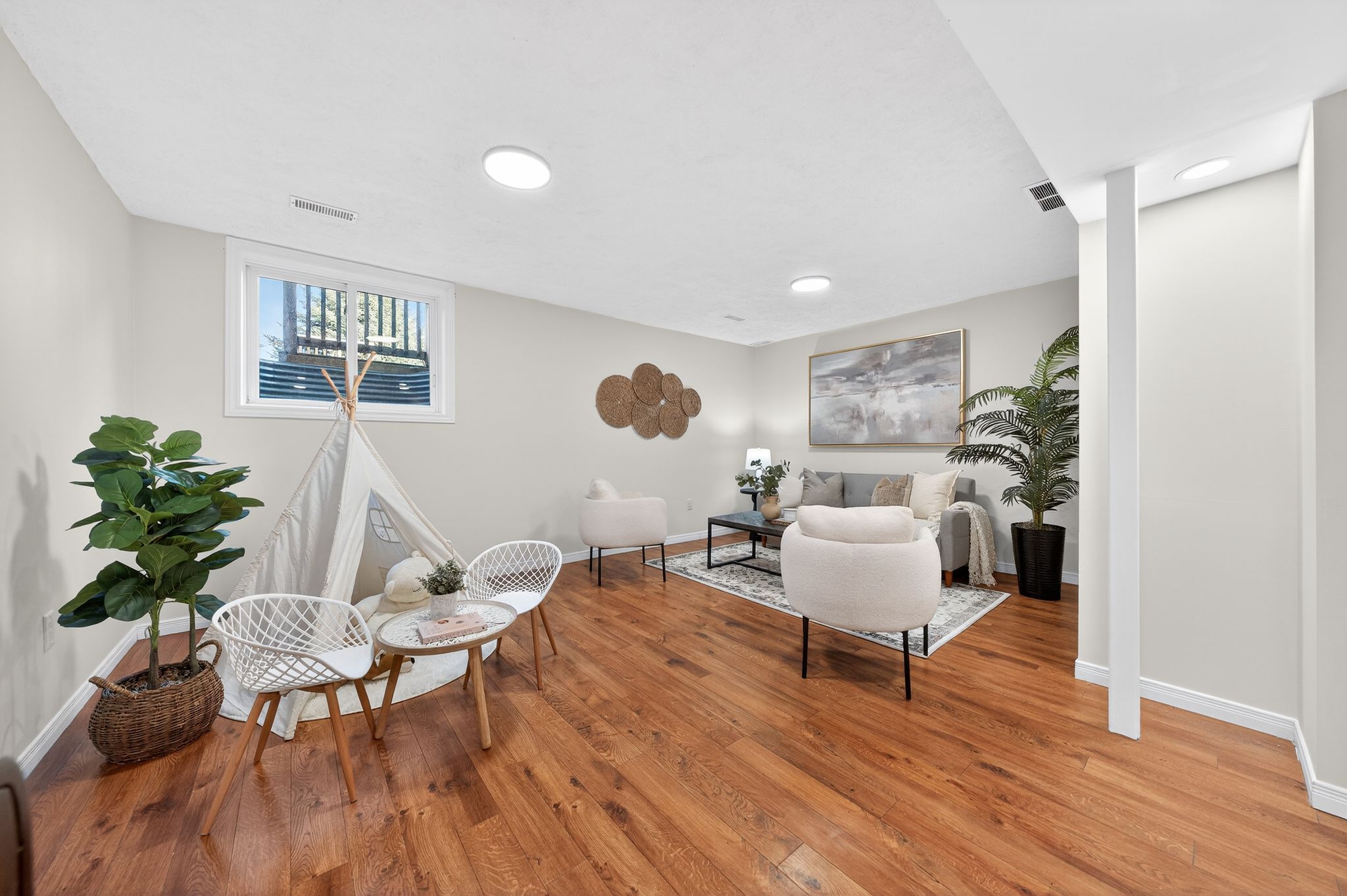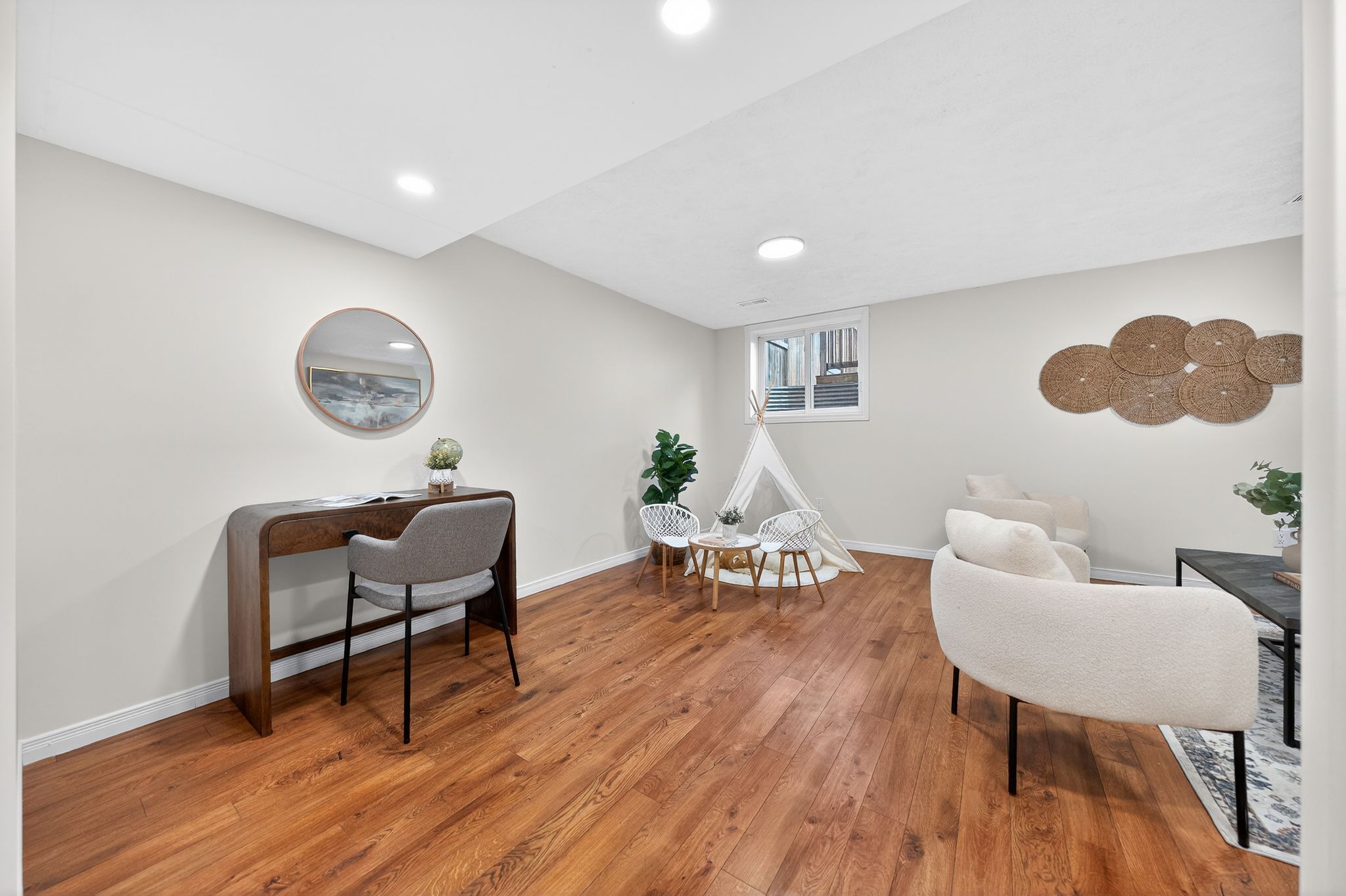 • Spacious finished basement with natural light, perfect for various uses.