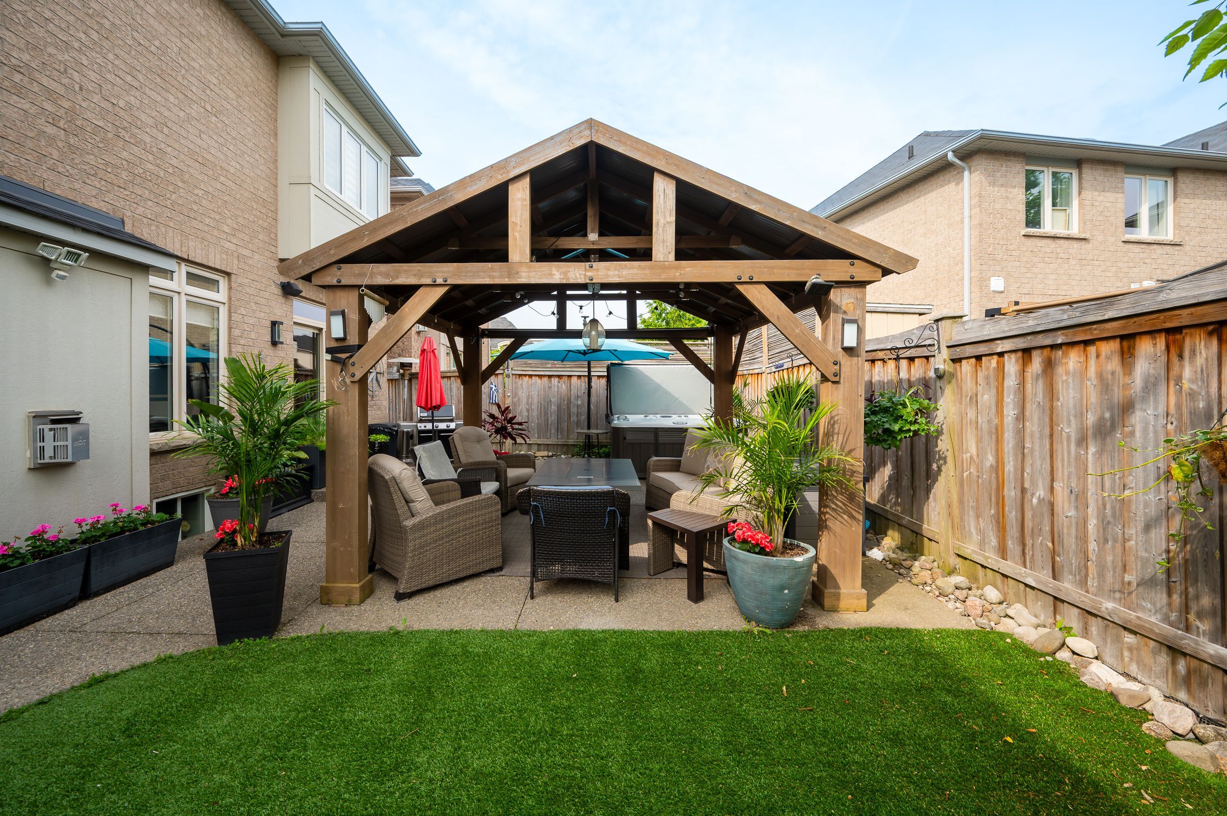 • Tranquil backyard with a large gazebo and hot tub for relaxation.