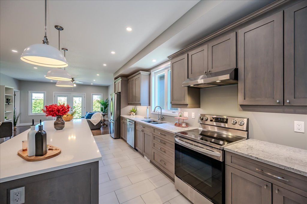 Custom-built home in a premium fergus setting! Situated on a mature, tree-lined lot just steps from the cataract trail, grand river, and the vibrant shops, cafés, and restaurants of historic downtown fergus, this exceptional property offers a rare blend of tranquility and convenience. Enjoy effortless commuting with quick access to kitchener-waterloo, guelph, and highway 401. Striking curb appeal features a timeless stone façade, durable vinyl siding, and a spacious concrete driveway with ample parking. Relax on the inviting front porch before entering a beautifully designed open-concept main floor showcasing rich hardwood and tile finishes. The chef-inspired kitchen is complete with quartz countertops, stainless steel appliances, abundant cabinetry, and a large island ideal for hosting. The dining area flows into a sun-filled great room with walkout to an expansive wood deck and private backyard retreat. The main floor primary suite offers a generous walk-in closet and a luxurious ensuite with glass shower, soaker tub, and double vanity. Upstairs, find two well-sized bedrooms, a versatile office nook, and a full 4-piece bath. The bright lower level with high ceilings, oversized windows, and bathroom rough-in provides excellent potential for future living space. An ideal home for families, downsizers, or those seeking main-floor living in a sought-after location.
