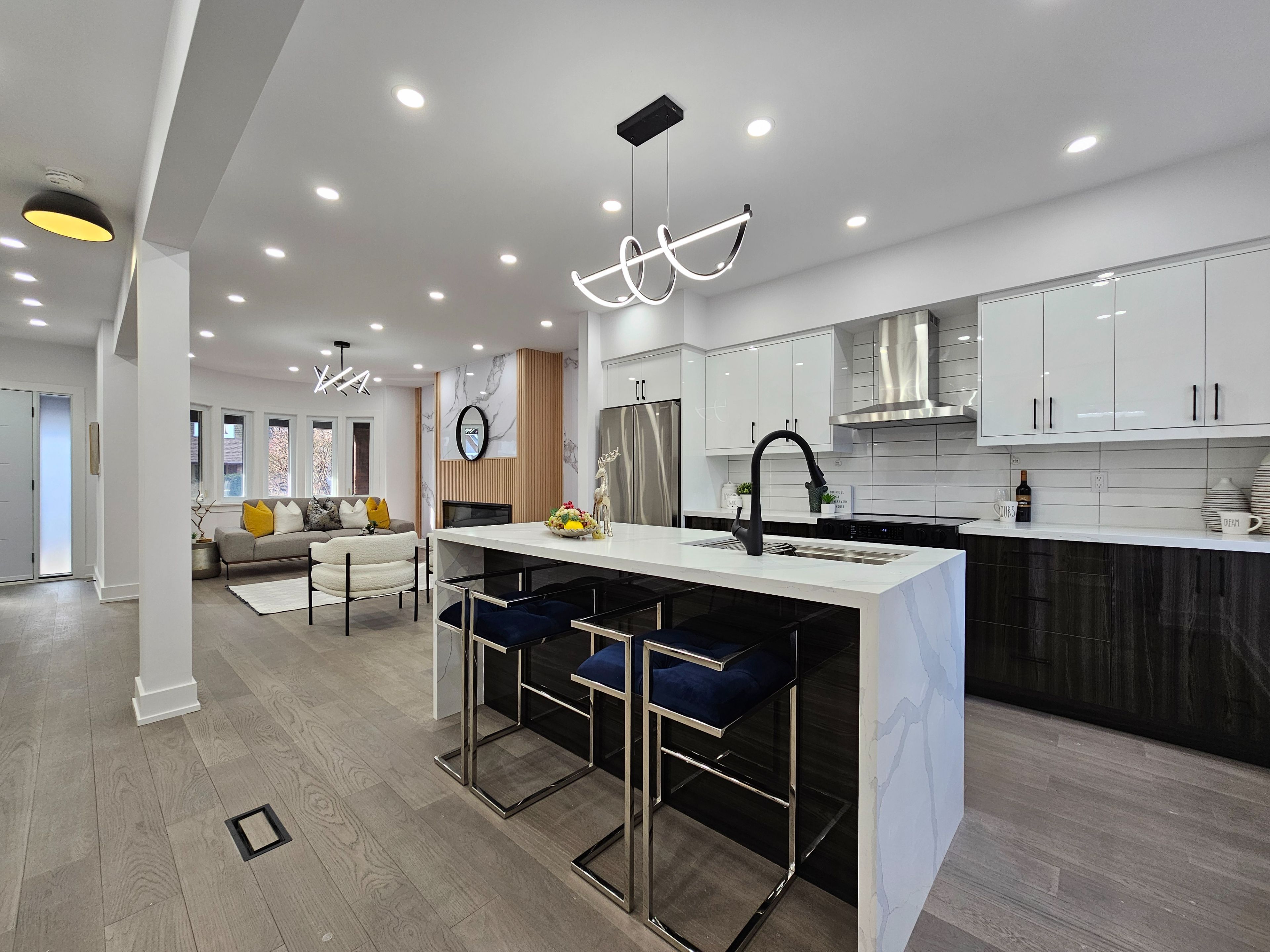 • Open-concept main floor with high ceilings and hardwood floors.