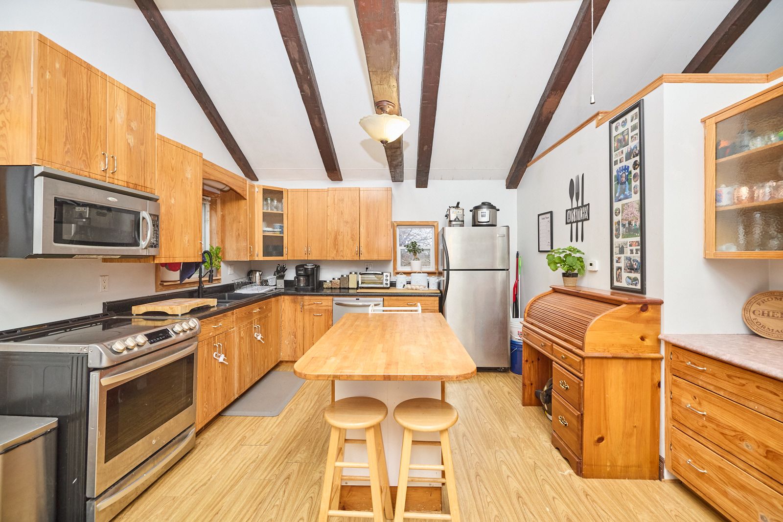• Sunken family room with cozy wood stove for relaxed gatherings.