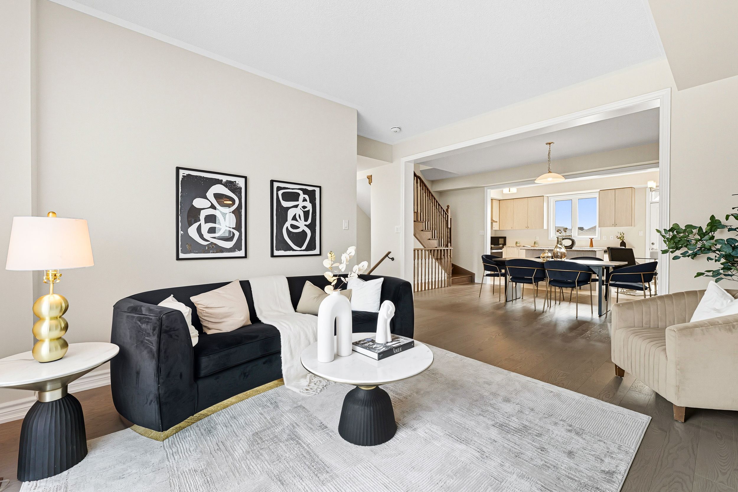 • Open-concept layout with 9' ceilings and hardwood flooring.
