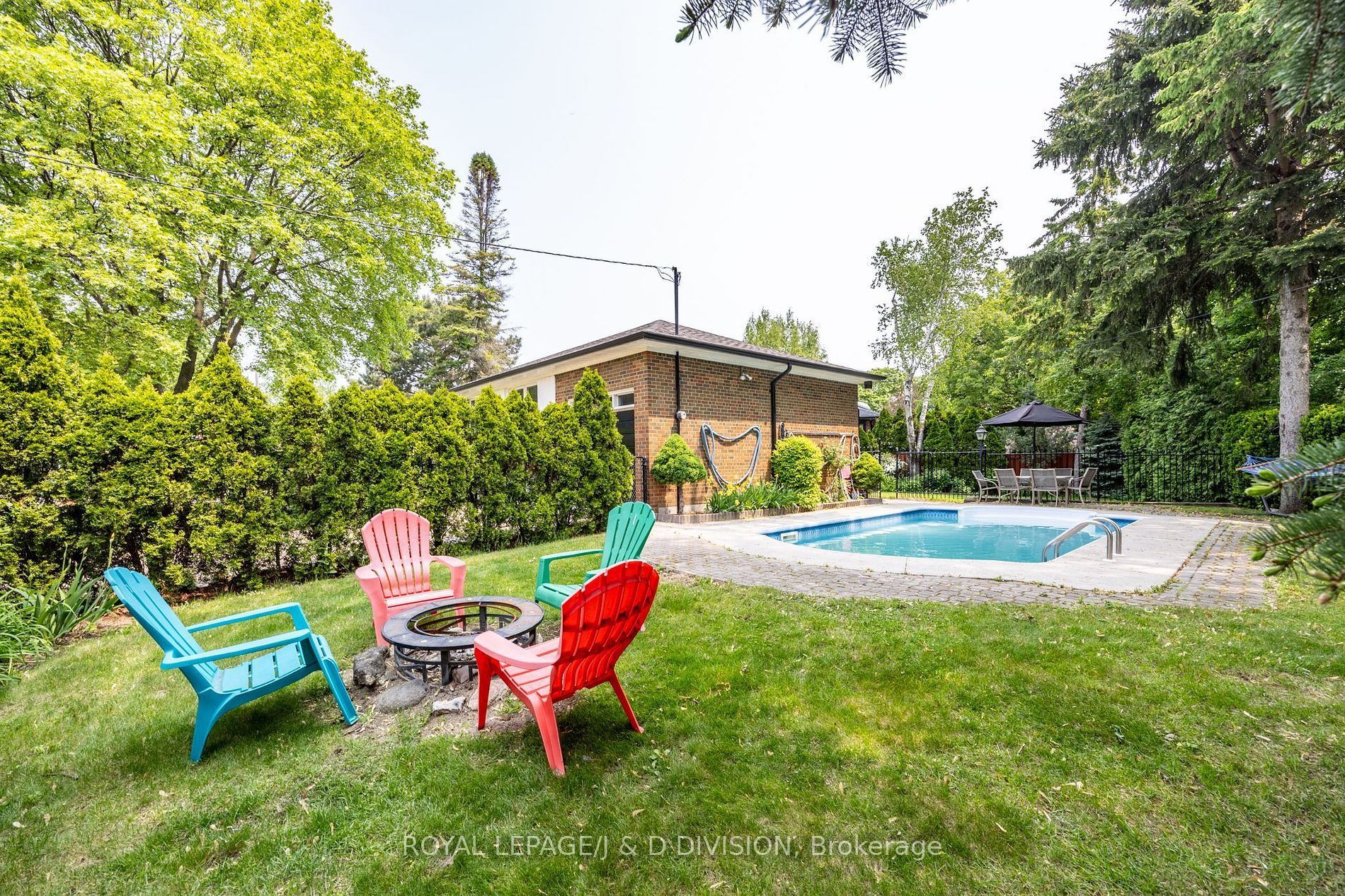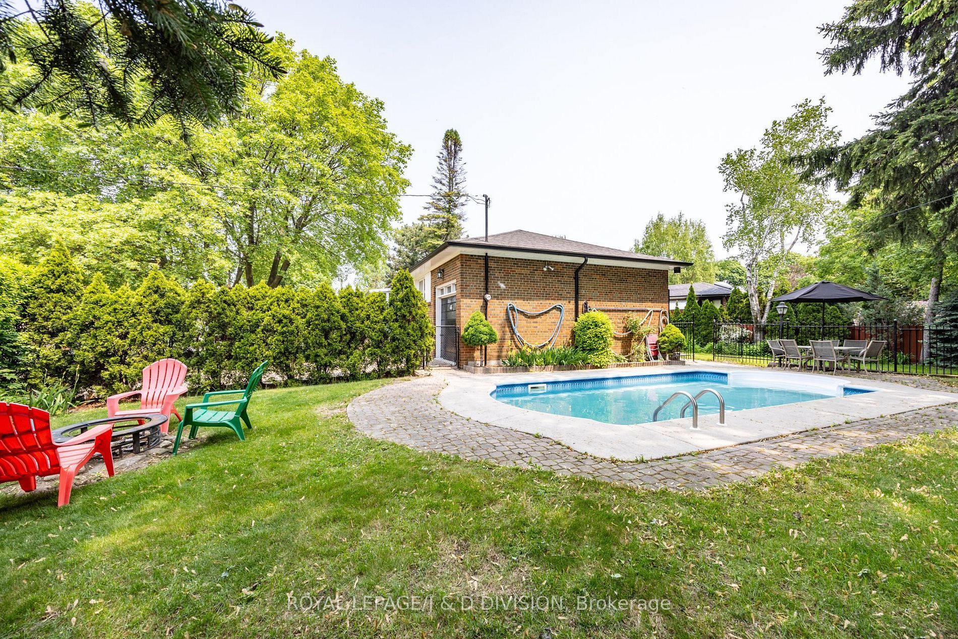 Charming ranch bungalow in a sought-after family-friendly neighbourhood. Nestled on a quiet, child-safe crescent on one of the area's most desirable streets, this beautifully updated bungalow offers the perfect blend of comfort, space, and privacy. Situated on an oversized lot, this exceptional home features a lush side garden with expansive green space and perennial plantings - an ideal space for children to play, as well as an interlocking patio perfect for outdoor entertaining. Enjoy your own private oasis with a fully fenced inground pool, with plenty of sunlight, fire pit, surrounded by mature cedars - offering privacy. The property also has a garage and a large interlocking driveway for several cars. The open-concept layout is perfect for family living, featuring an eat-in kitchen with granite countertops, three bedrooms and an updated bathroom. A large lower level with oversized above-grade windows, inviting family room with a gas fireplace, a recreation room with bar and electric fireplace, a separate home office or additional bedroom and a three piece bathroom. An ideal teen suite. An abundance of natural light throughout. This home has a flexible floor plan and could easily accommodate lower level living for in laws or children coming back home. Excellent ceiling height in the lower level and plenty of potential. Conveniently located close to the shops at don mills, top-rated schools, broadlands community centre, dvp/404/401, an express bus downtown and surrounded by scenic ravines, nature trails, and numerous parks. A wonderful opportunity to own a special home on an incredible private lot in an unbeatable location!