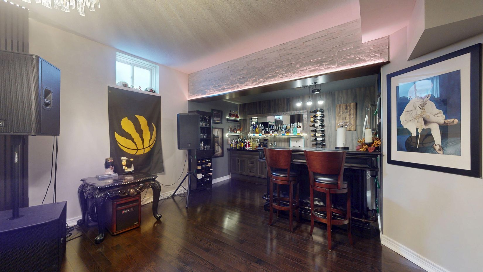 • Entertainment area includes a wet bar and karaoke setup.