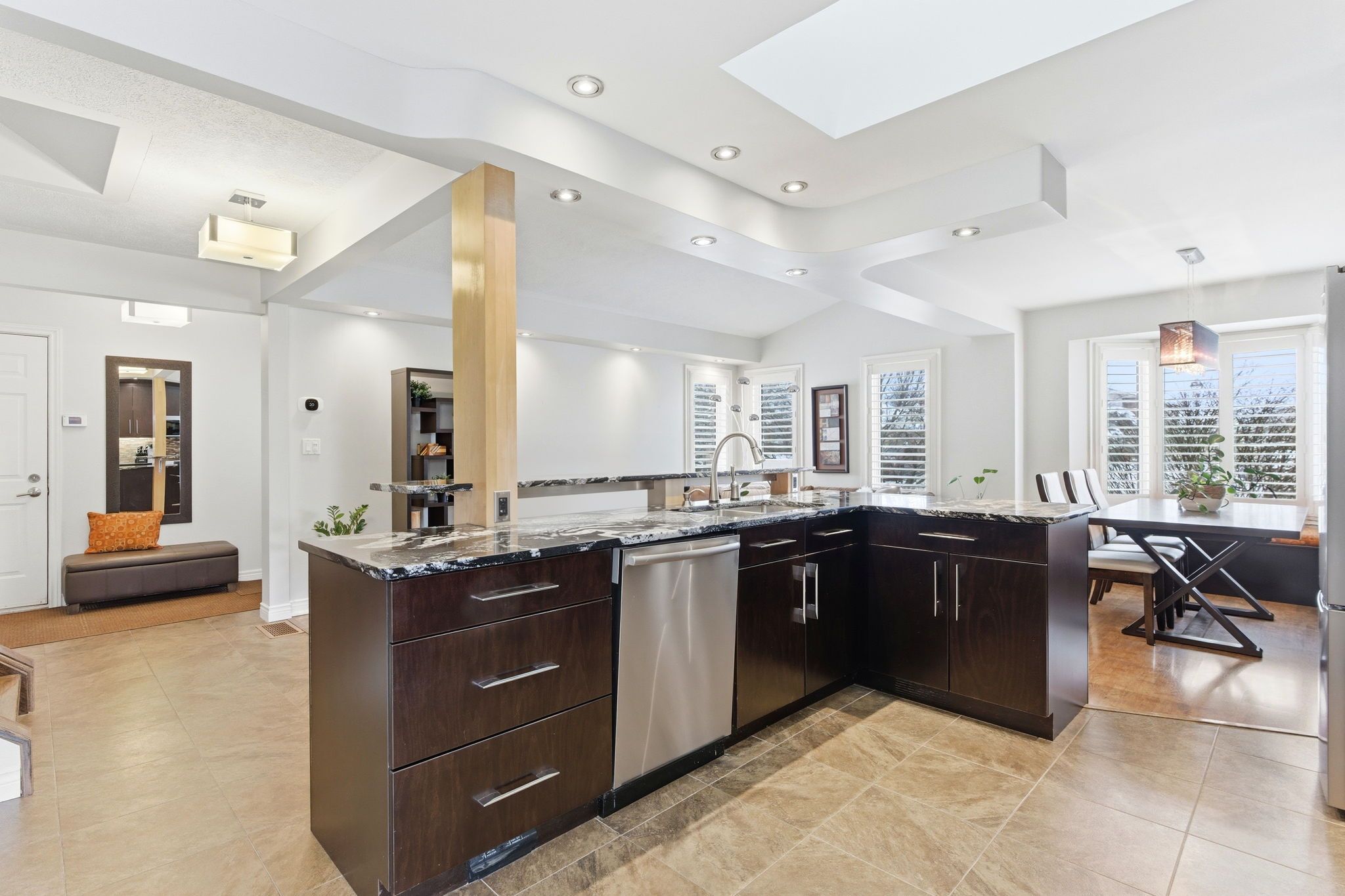 Welcome to this beautifully maintained 4-bedroom backsplit offering over 1,900 sq ft of above-grade living space, plus a fully finished basement - perfect for families seeking space, comfort, and efficiency. Built in 1994 and thoughtfully updated throughout, this home features a renovated maple kitchen with roll-out cabinetry, built-in workspace, and garden doors leading to a newer deck and stamped concrete patio - ideal for entertaining. Major upgrades include centennial windows, a bosch heat pump with ecobee thermostat (2023), tankless on-demand water heater, water softener, hepa filtration, humidifier, and attic insulation with air sealing for enhanced energy efficiency. The finished basement offers a cozy electric fireplace, vinyl flooring, and updated bathroom, including a 2-piece addition in 2024. Additional highlights include a newer roof, furnace, garage door, backyard fencing, washer/dryer, and stainless steel appliances. Fibre internet is available. Situated in a mature neighbourhood, steps from the t. J dolan, this move-in-ready home delivers comfort, efficiency, and value in one impressive package. A must-see!