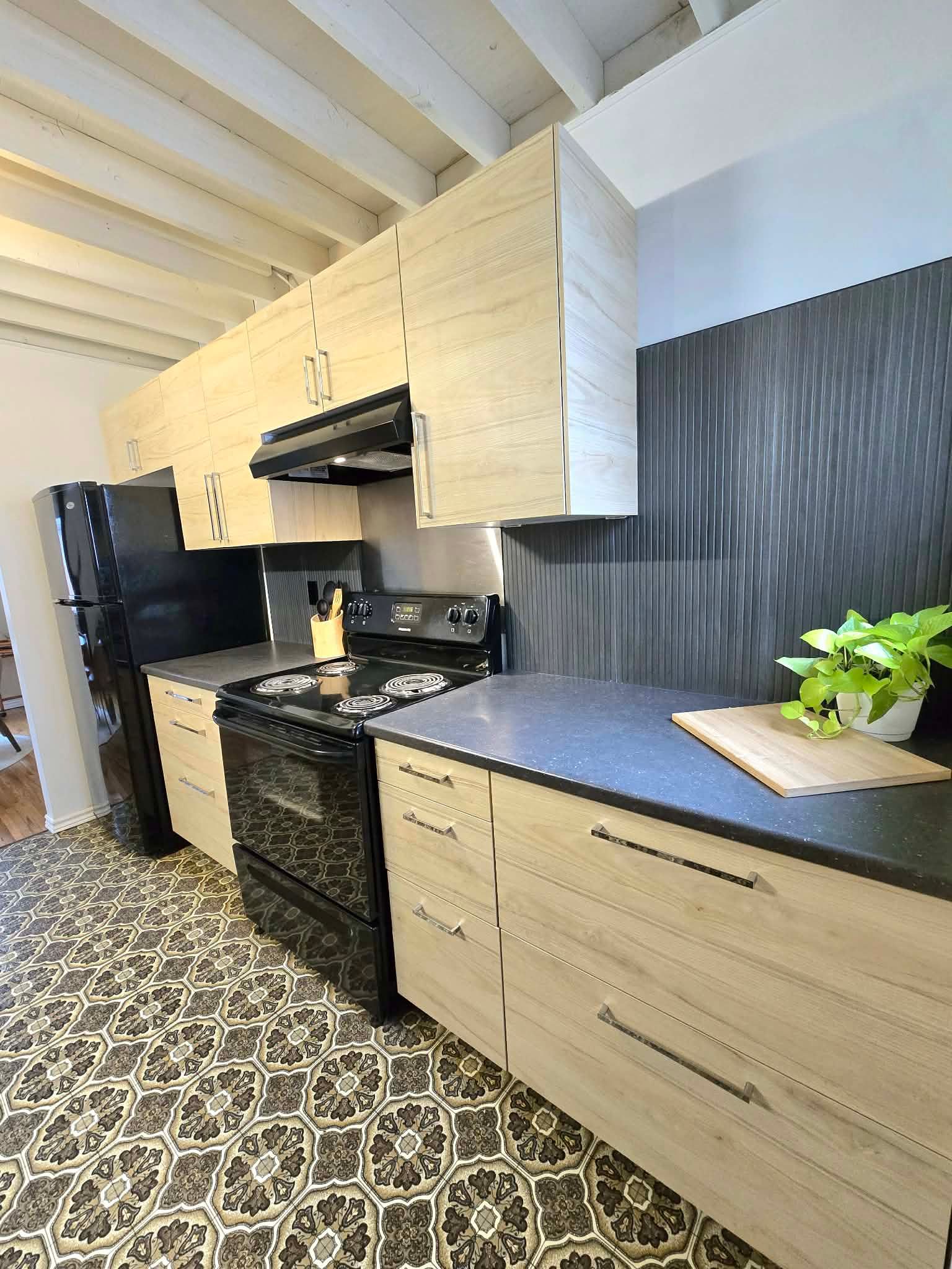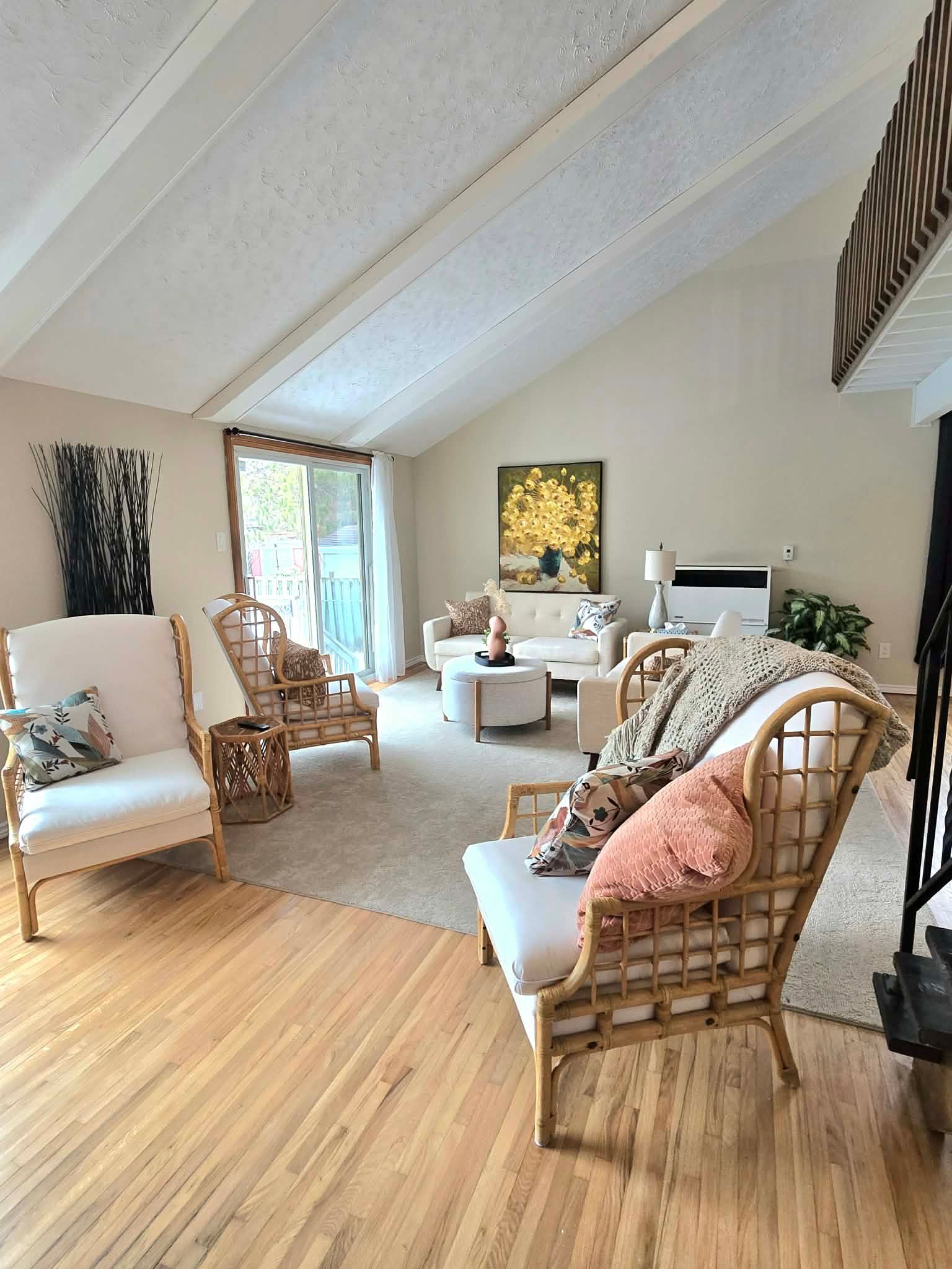 • Spacious open floor plan with original hardwood floors and cathedral ceilings.