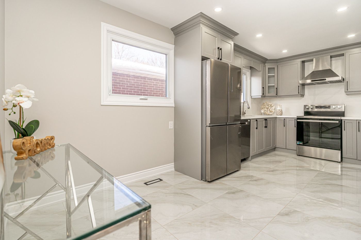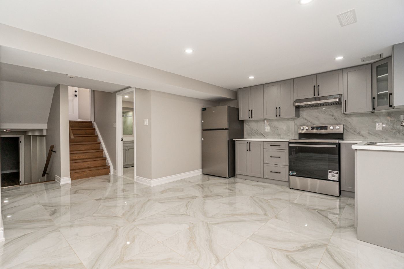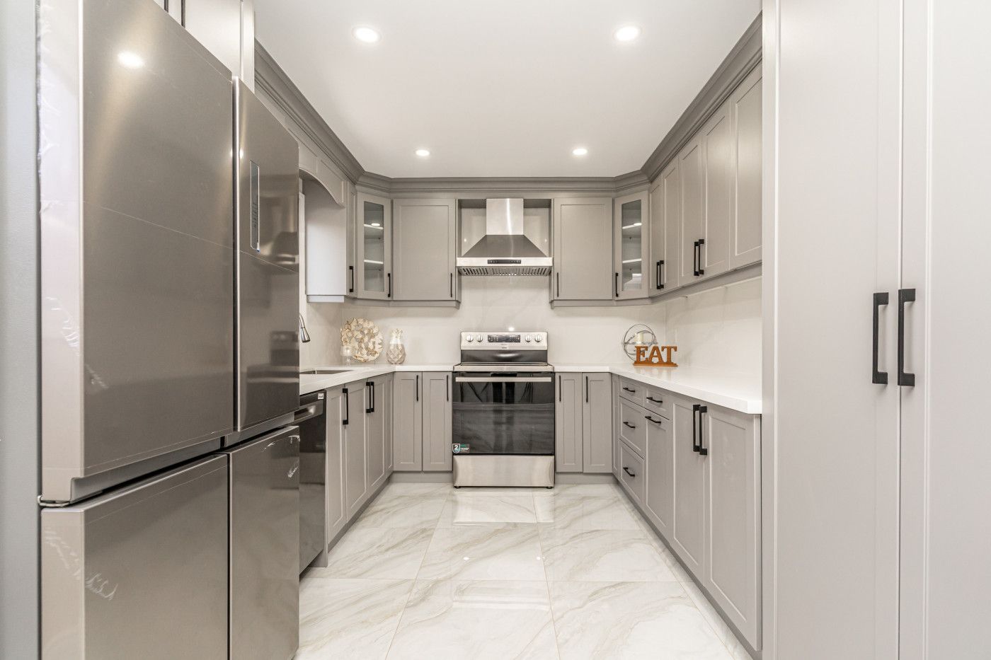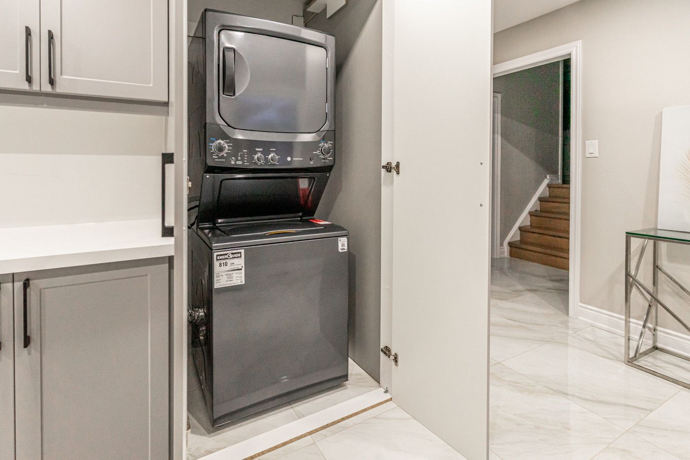• Custom kitchen featuring quartz countertops, pot lights, and a convenient laundry area.