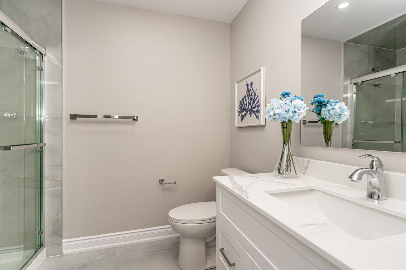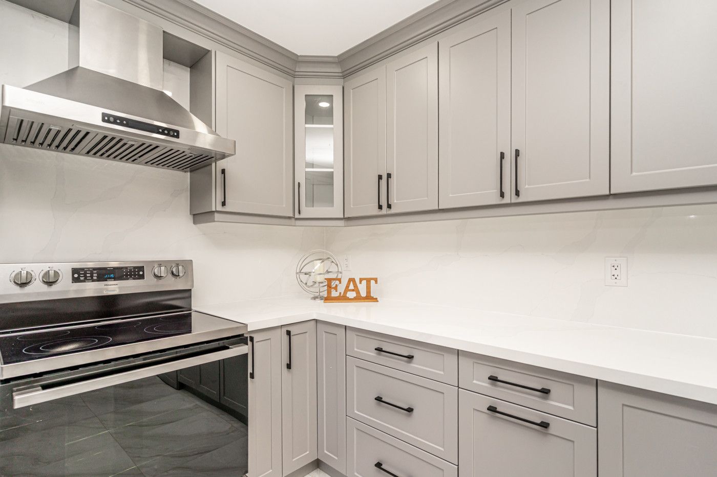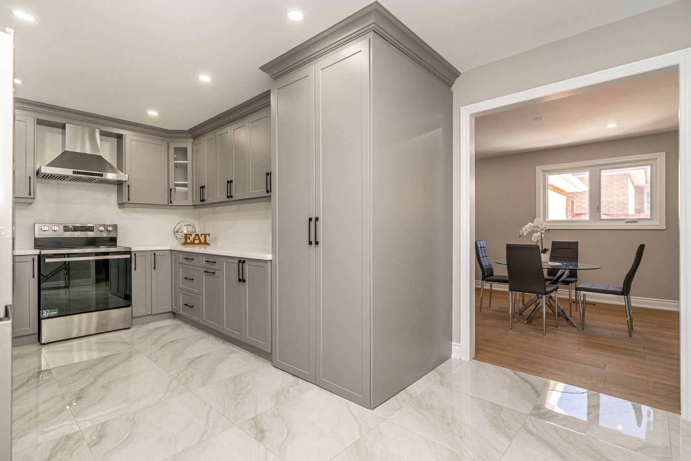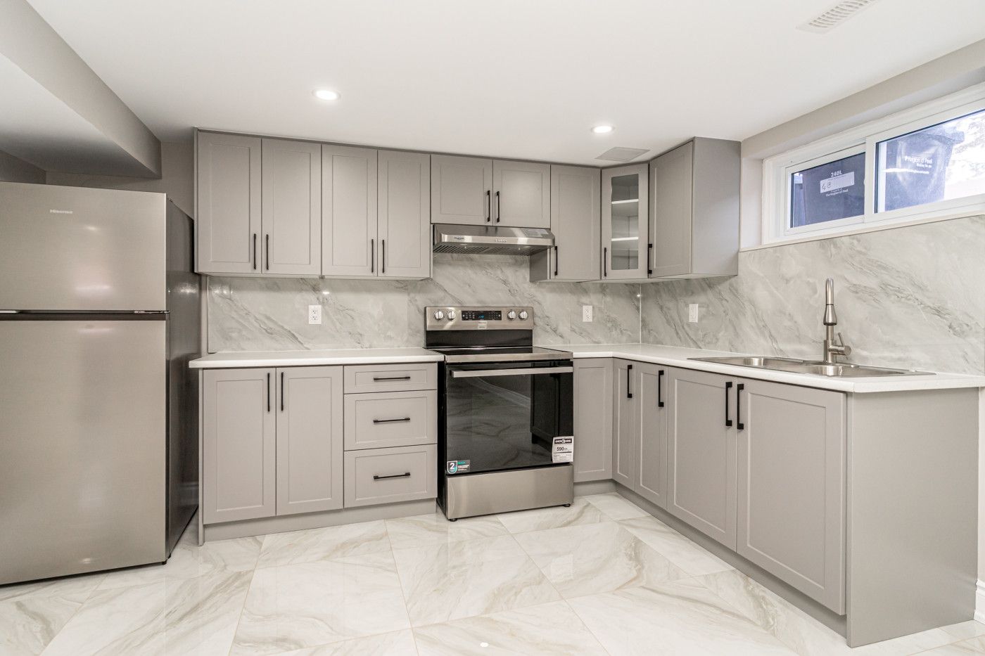• Custom kitchen featuring quartz countertops, pot lights, and a convenient laundry area.