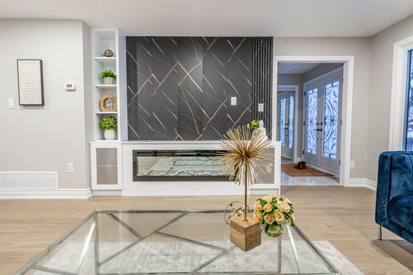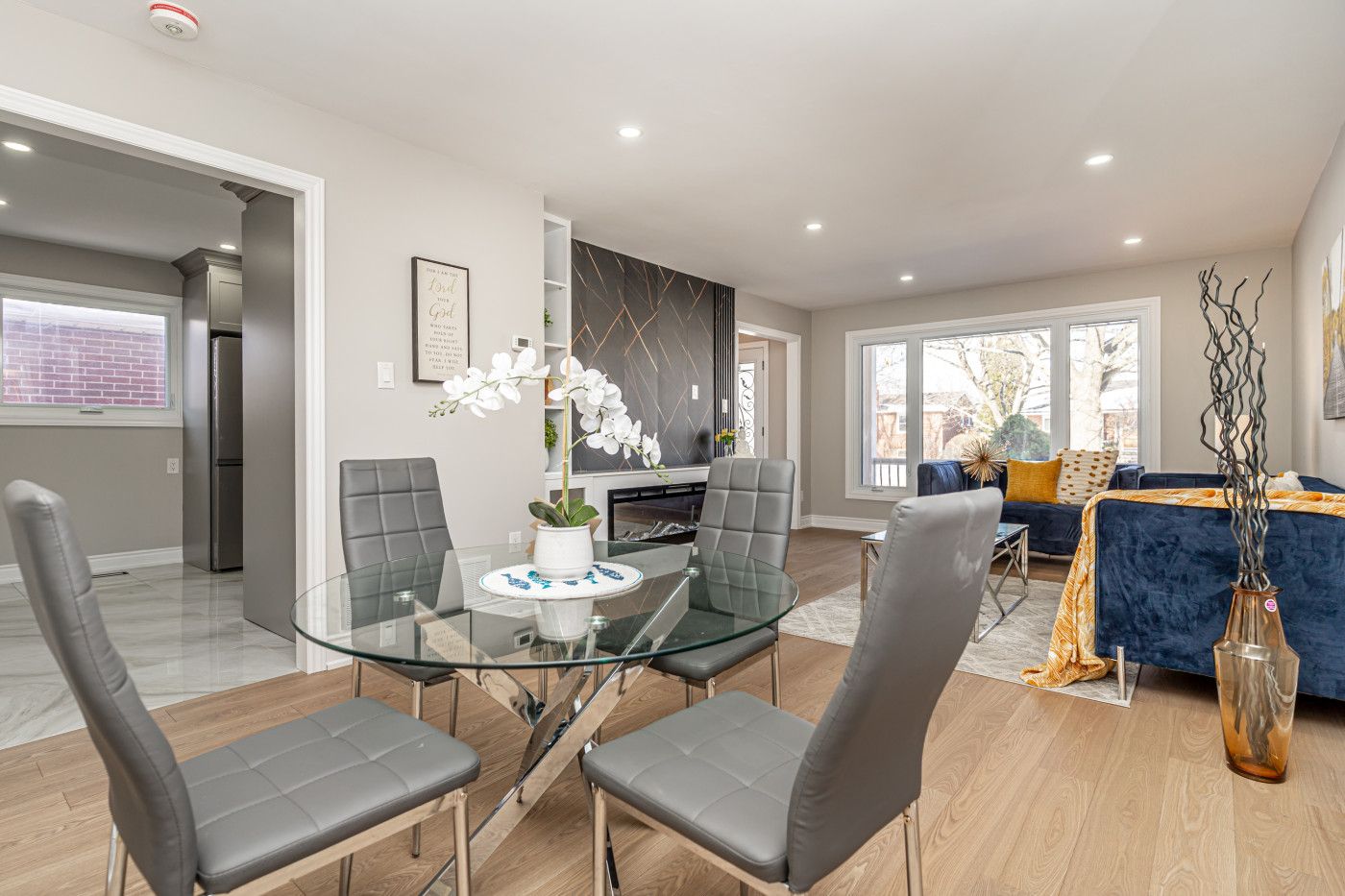 • Bright living/dining area with a modern fireplace and in-built wall unit.