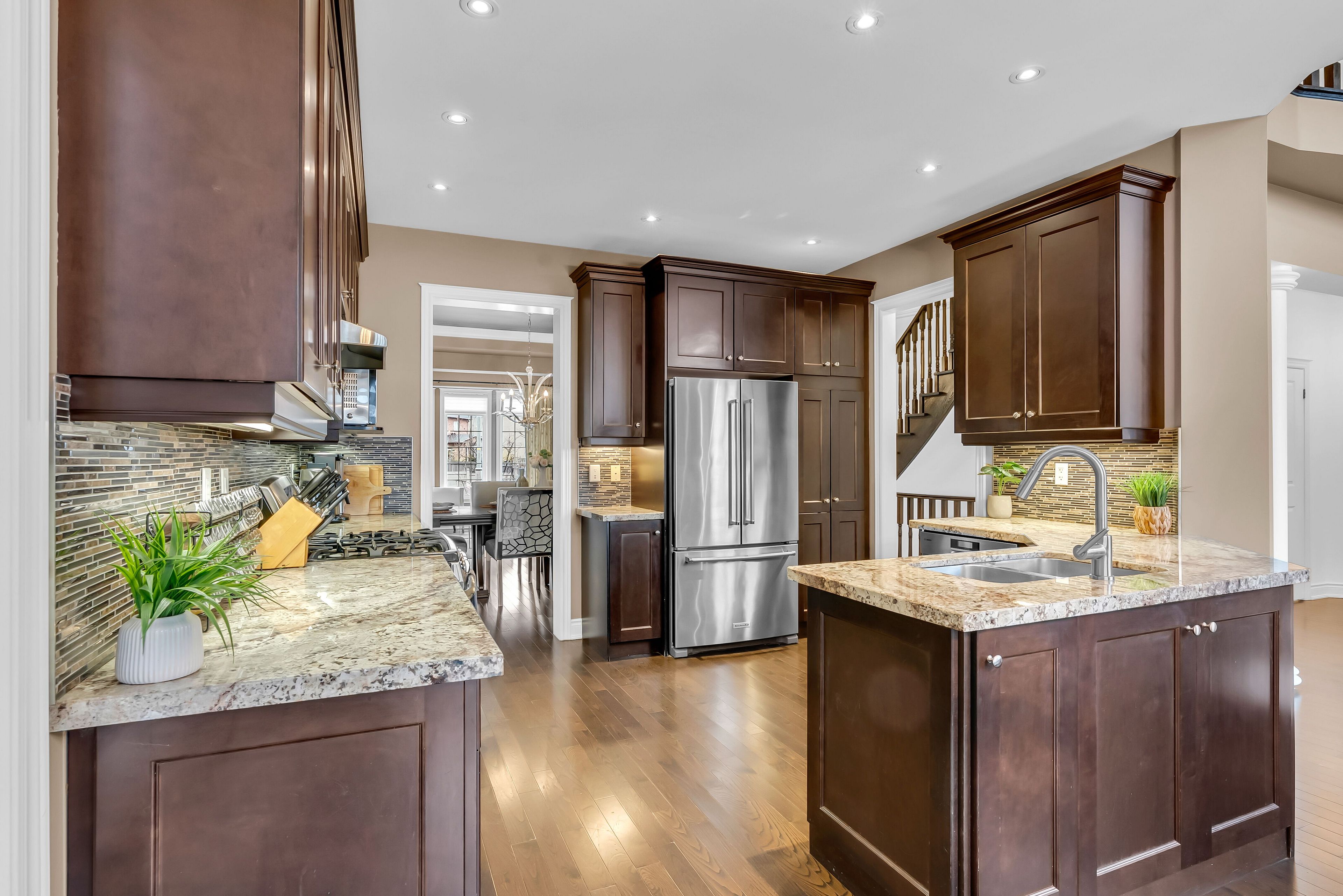 • Spacious kitchen featuring granite countertops and a gas stove.