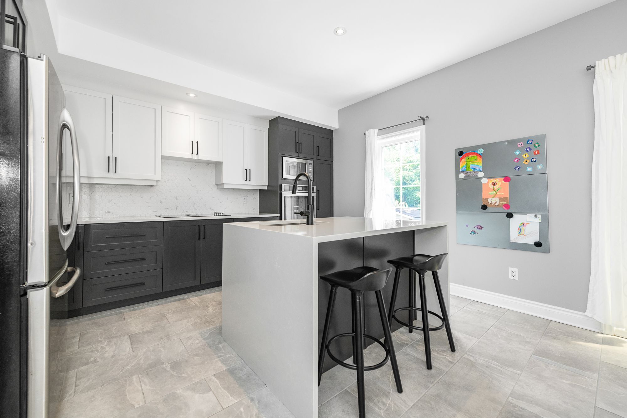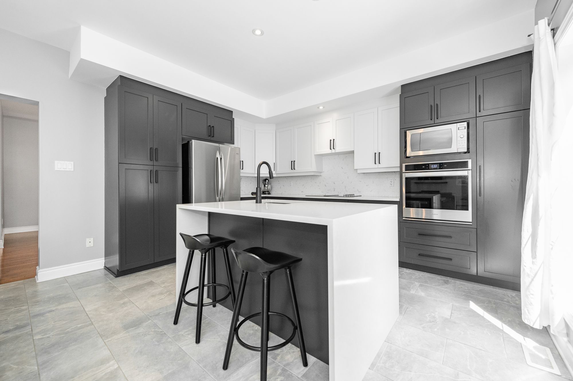 • Stylish kitchen with quartz countertops and stainless steel appliances.
