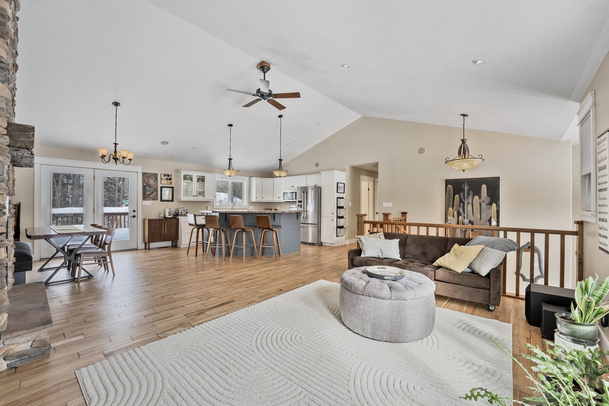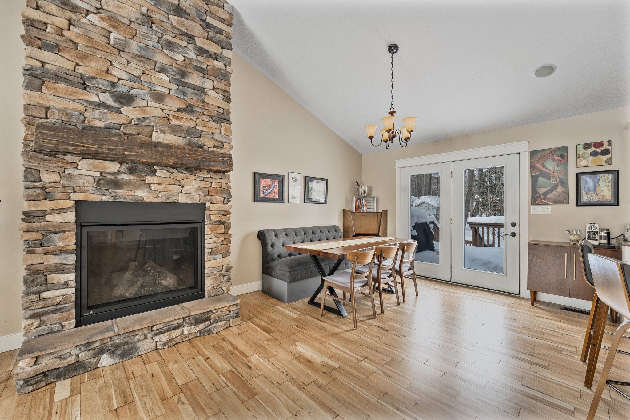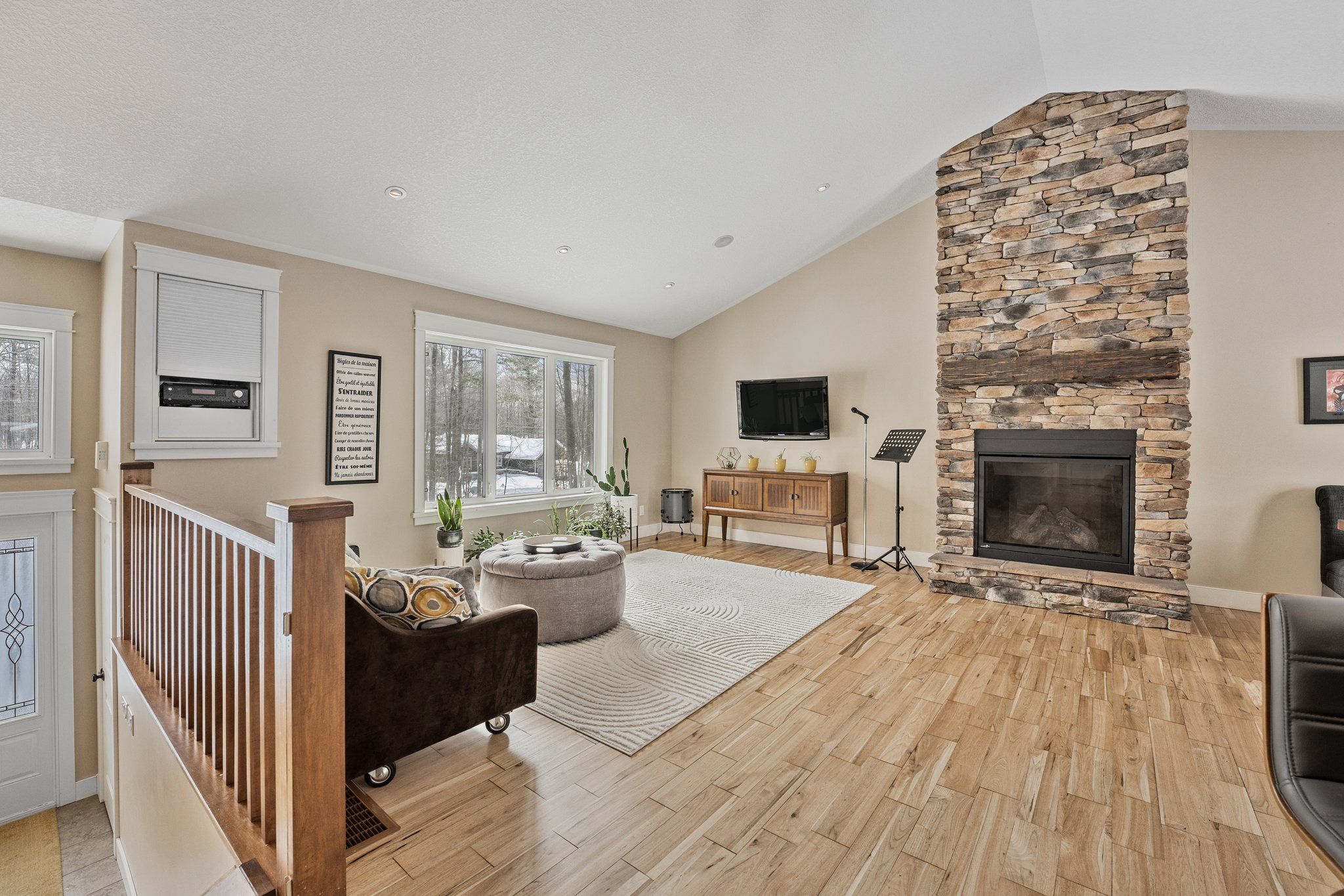 • Open-concept layout featuring a striking gas fireplace and vaulted ceilings.