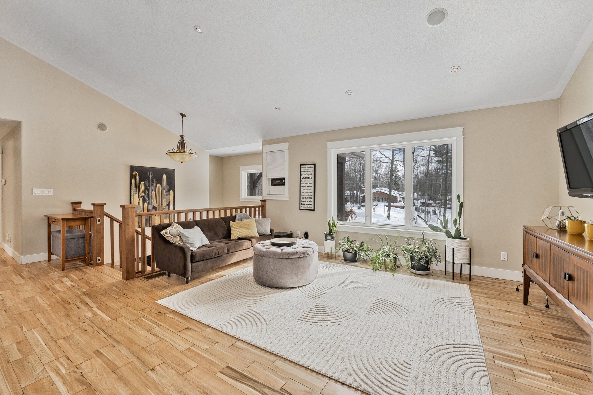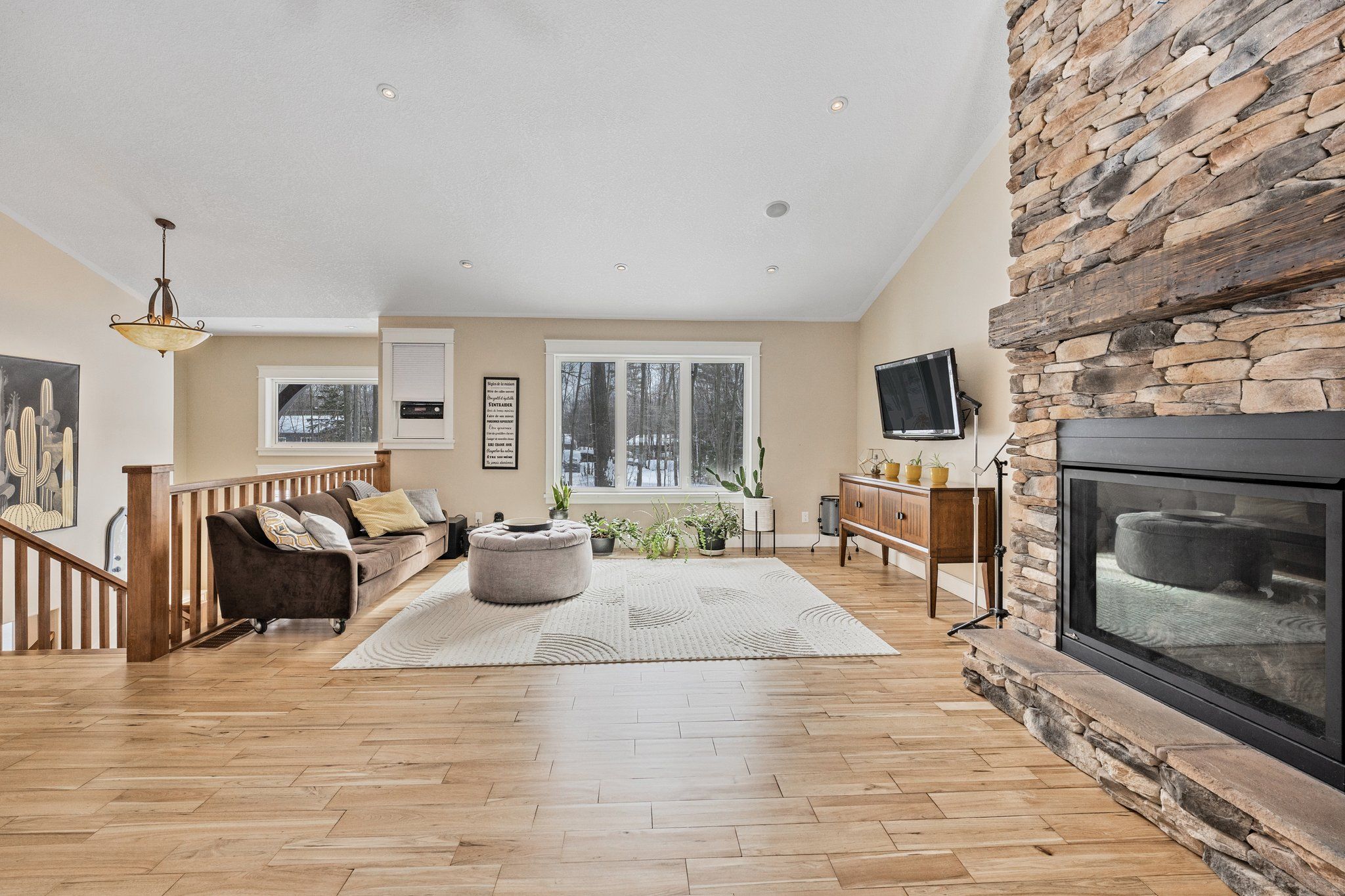 This stunning, custom-built raised bungalow boasts 4 spacious bedrooms & 2 bathrooms, offering over 2500 sq ft of thoughtfully designed living space. Set on a premium, beautifully landscaped estate lot in the scenic tiny township, this home is a true gem. From the moment you enter, the attention to detail is evident, with a seamless blend of modern decor & functionality throughout. The main level features an open-concept layout, where a striking floor-to-ceiling gas fireplace takes center stage in the expansive living area, complemented by sleek pot-lights & soaring vaulted ceilings. The cozy family room provides a perfect retreat, while the kitchen, complete with a large island, adds a touch of elegance. A bright & airy breakfast nook leads out to an enormous deck, perfect for outdoor dining or relaxing, with views of the private, treed backyard, offering peace & tranquility. The primary bedroom is a private sanctuary, featuring a walk-in closet & semi-ensuite privileges. Two additional well-sized bedrooms & a stylish 4-pc bathroom with a separate shower & luxurious soaker tub provide ample space for family and guests. Hardwood floors flow seamlessly throughout the main level, enhancing the homes elegant feel. On the lower level, you'll find a massive rec room ideal for entertaining, along with a 4th bedroom, a convenient laundry room, & a 3-pc bathroom. The mudroom, with its separate entrance leading to the garage, adds both functionality & convenience. The garage itself is fully equipped with a storage loft, two man doors, two garage door openers, & hot and cold water. Additional features include central vac, central air conditioning, a sprinkler system, & built-in felton speakers on the main level. A natural gas line is ready for your bbq, & soffit lighting adds a charming touch to the exterior. All of this is ideally located just moments from the beaches & breathtaking shores of georgian bay, offering the perfect blend of privacy, luxury, & nature.
