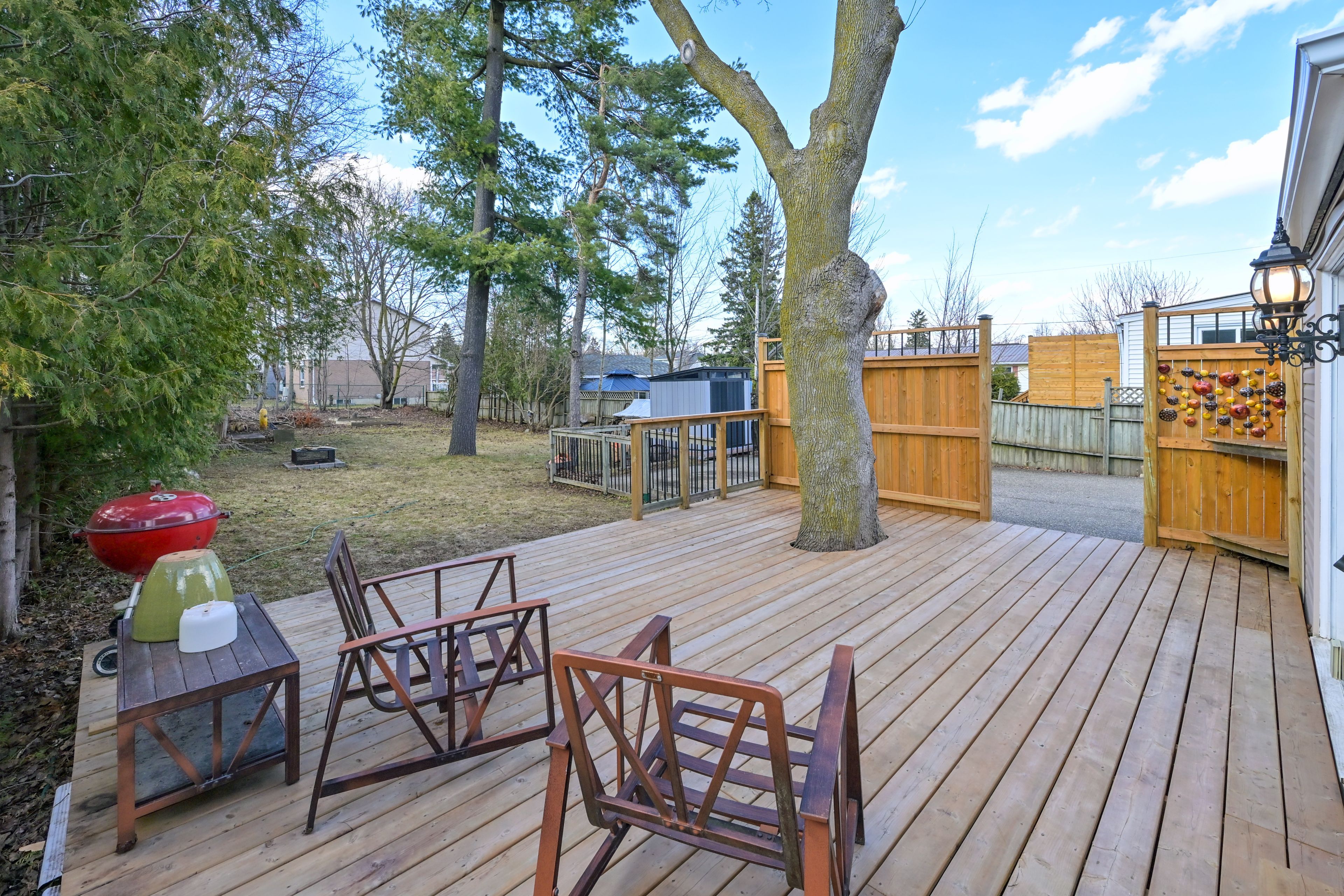 • Lovely deck surrounded by mature trees, perfect for relaxing gatherings.