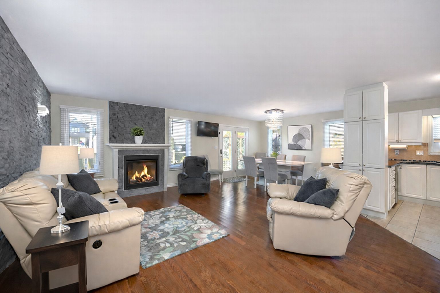 • Bright open-concept main floor with hardwood floors and gas fireplace.