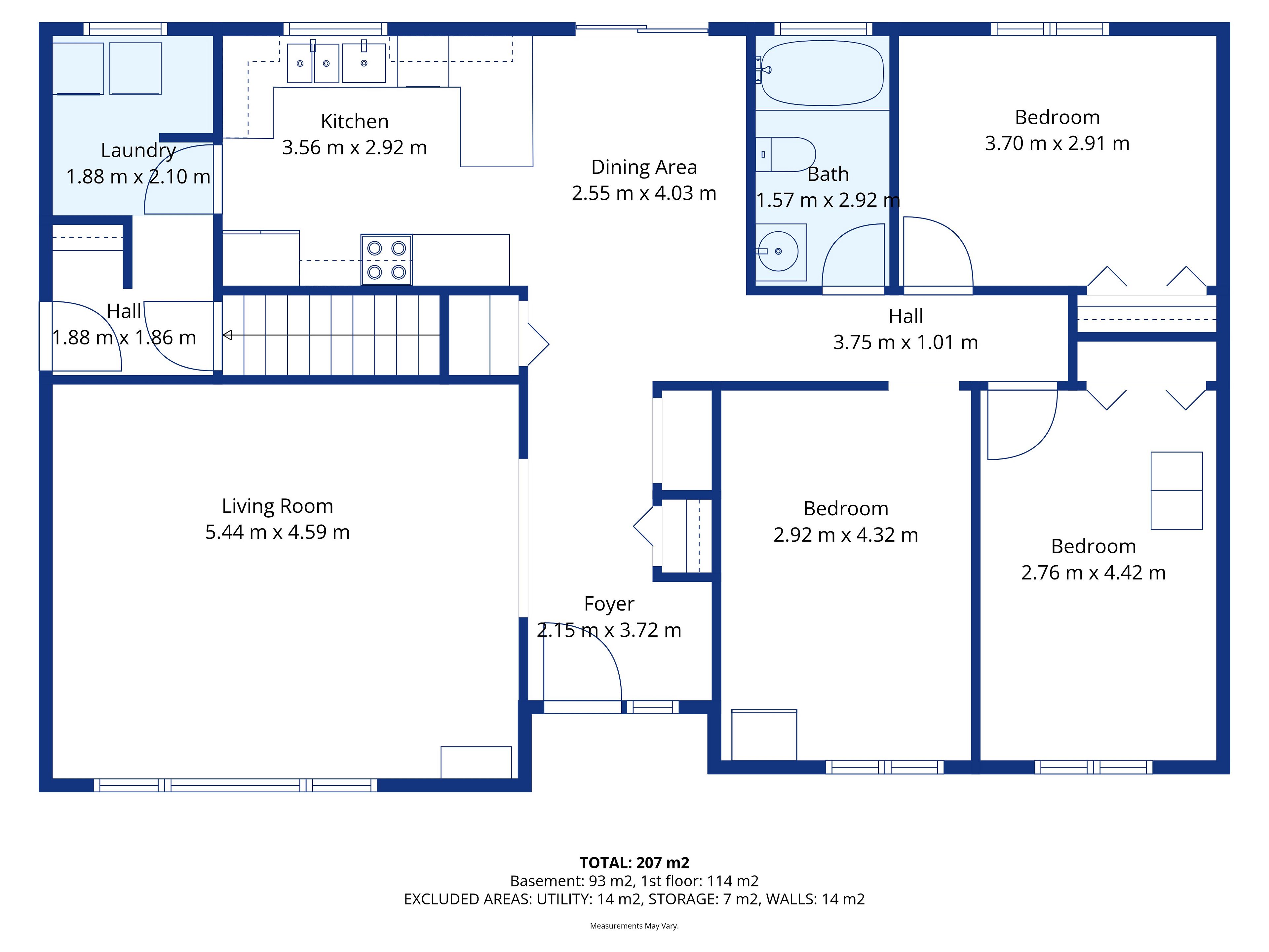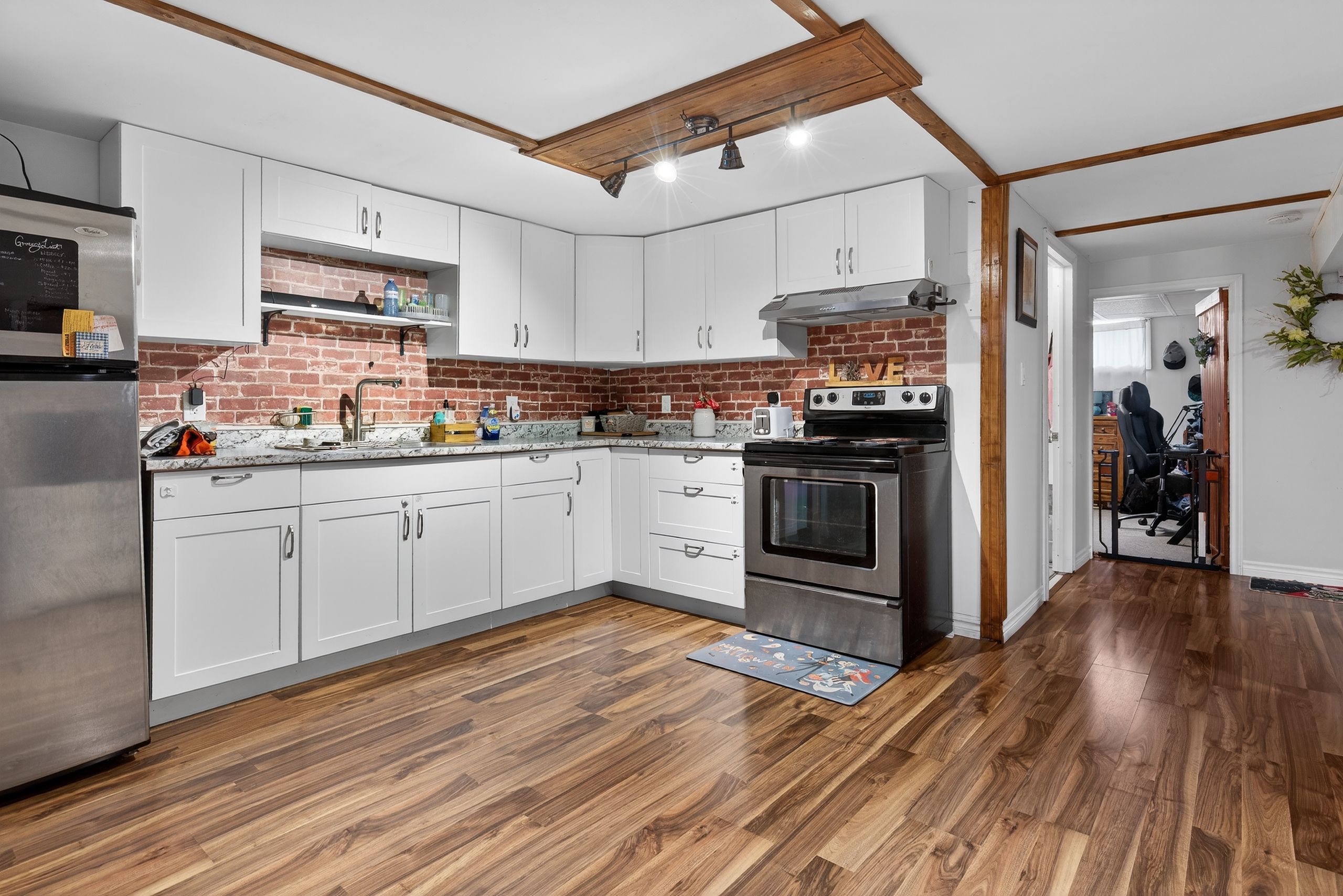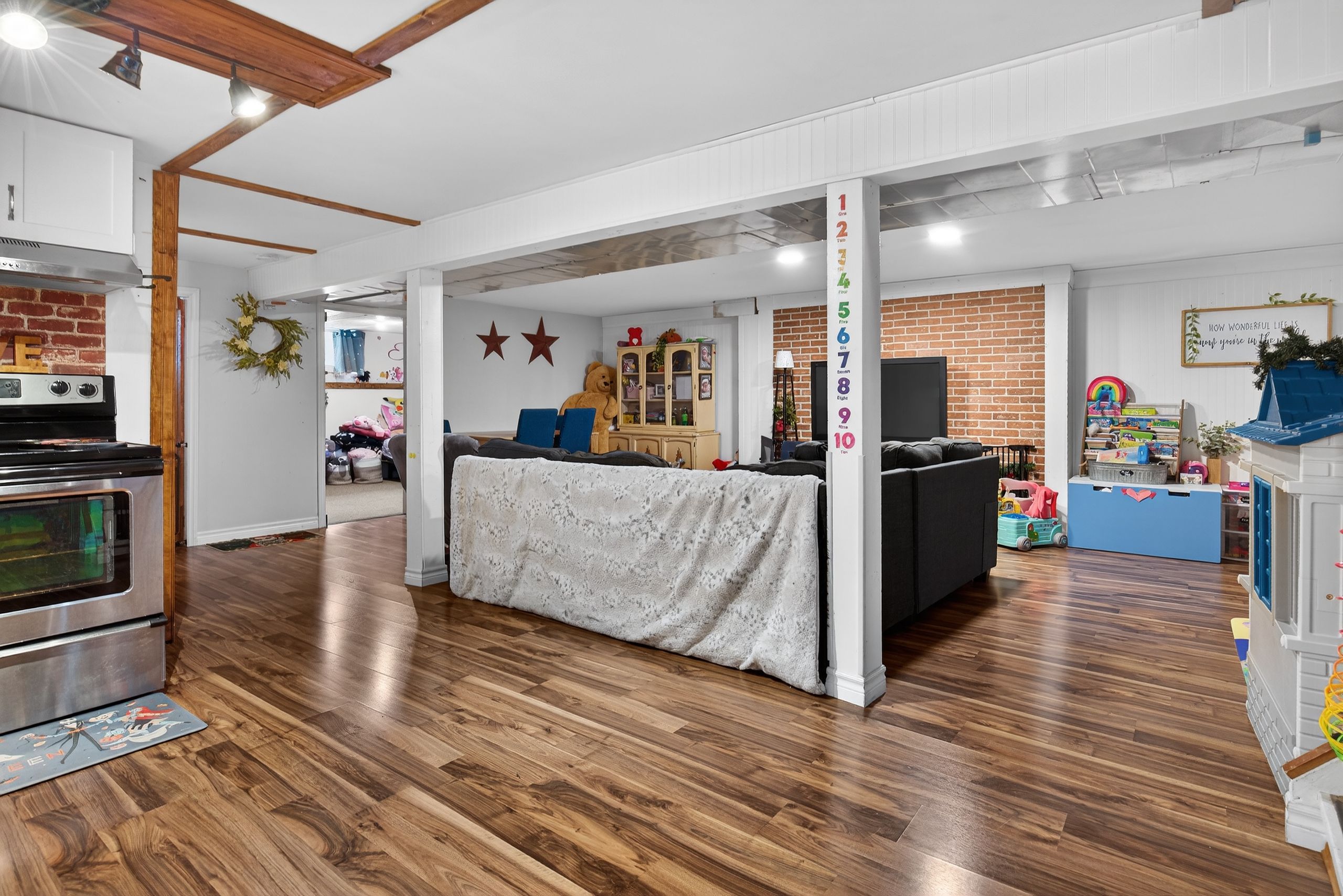 • Functional main floor layout with kitchen, living area, and laundry.