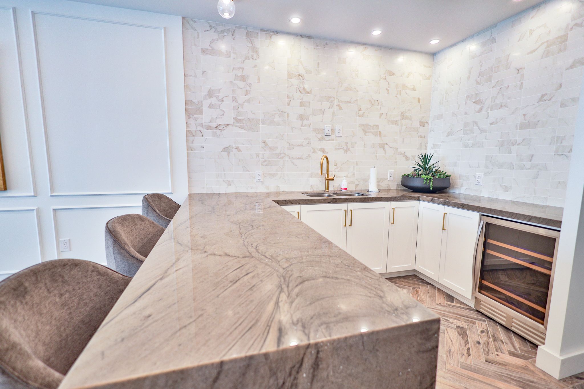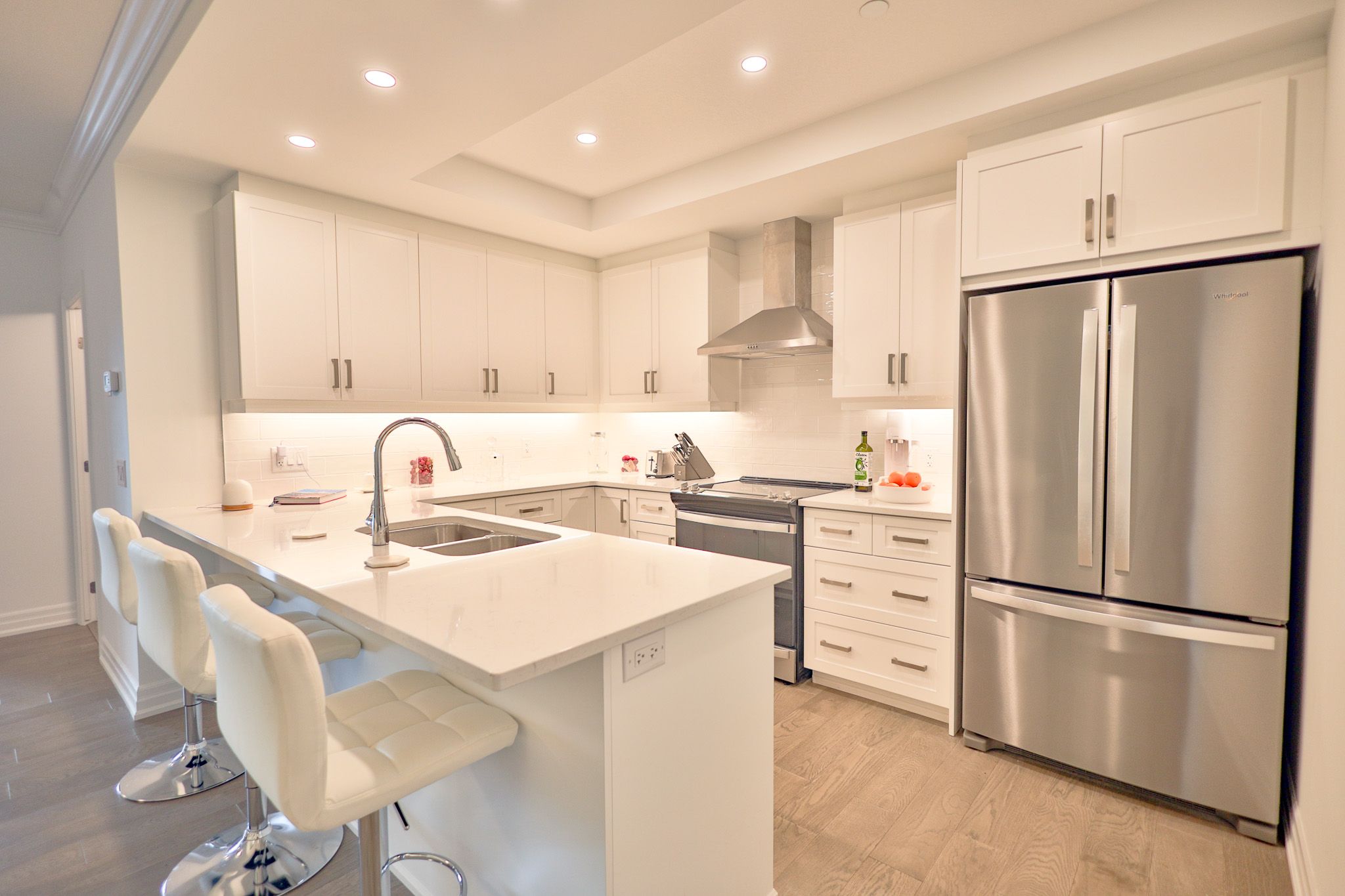 • Upgraded kitchen with quartz peninsula and stainless steel appliances.