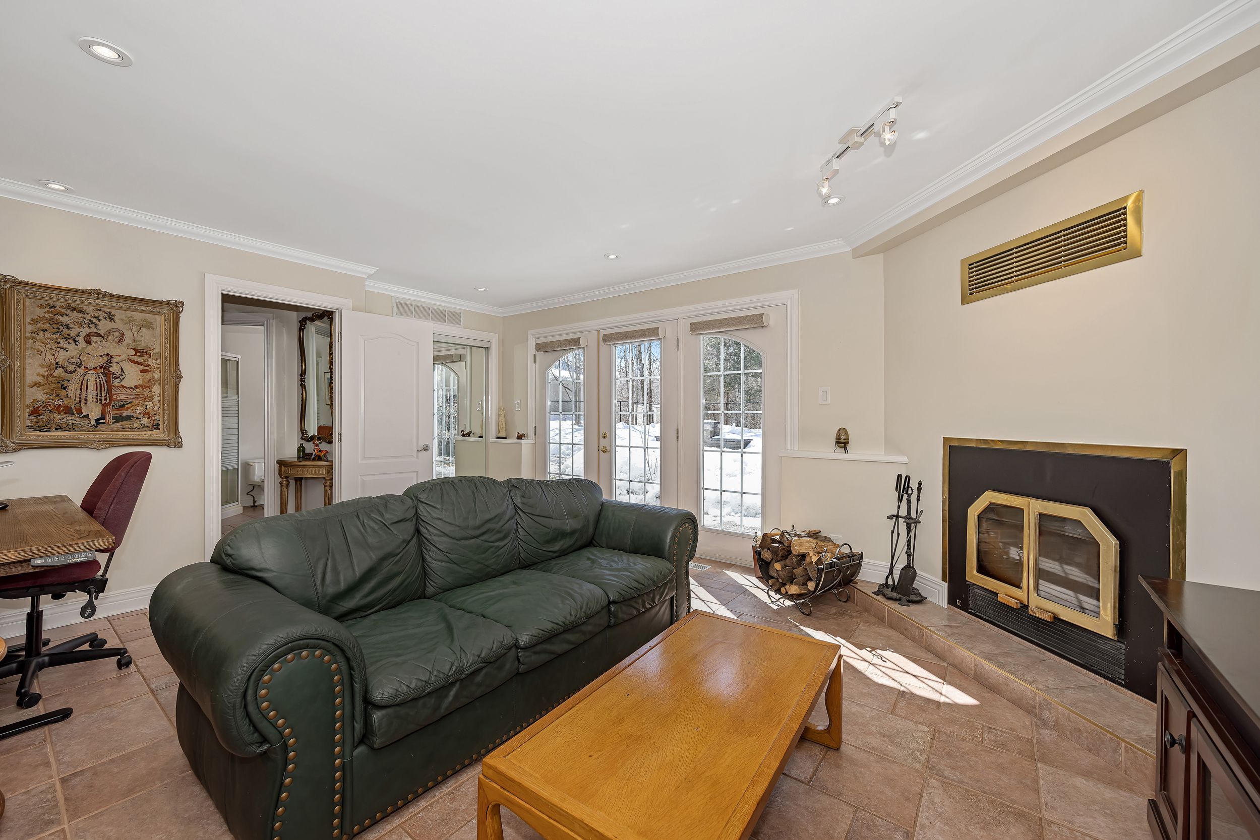• Inviting family room with wood-burning fireplace and backyard access.