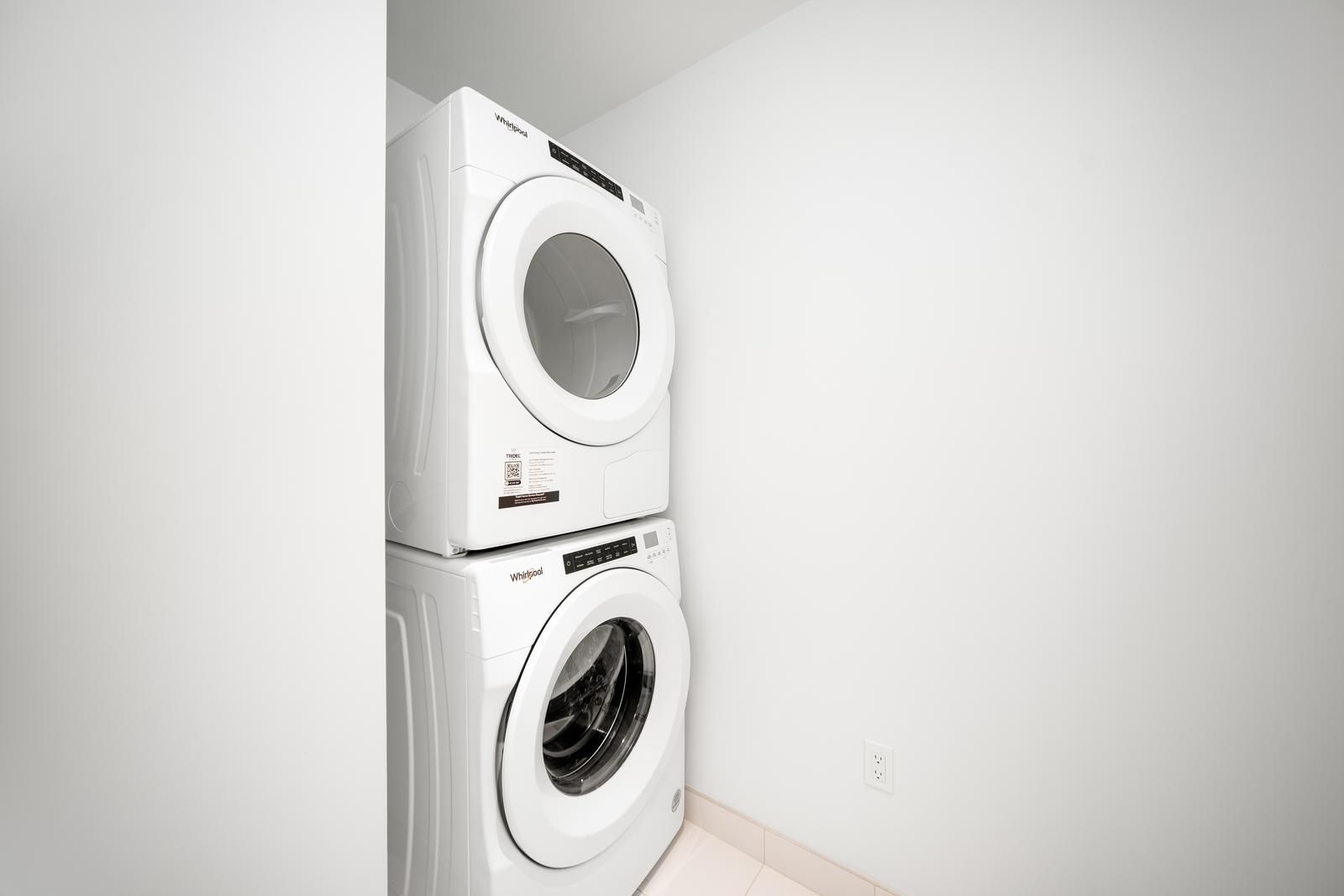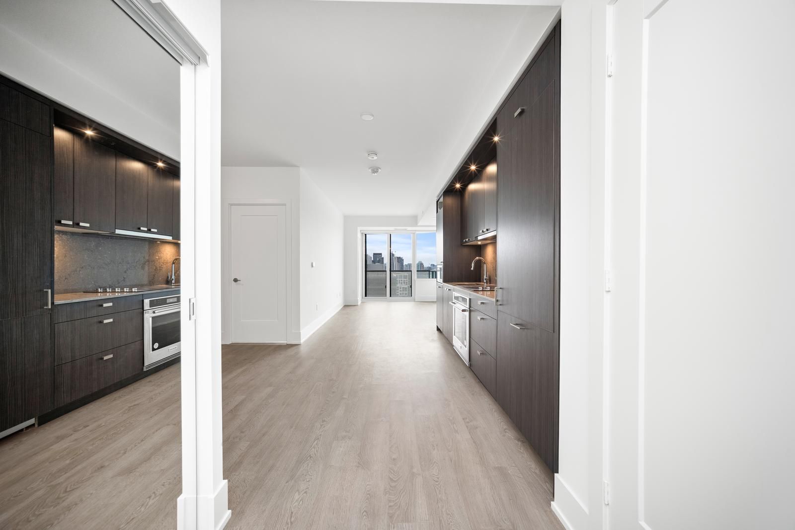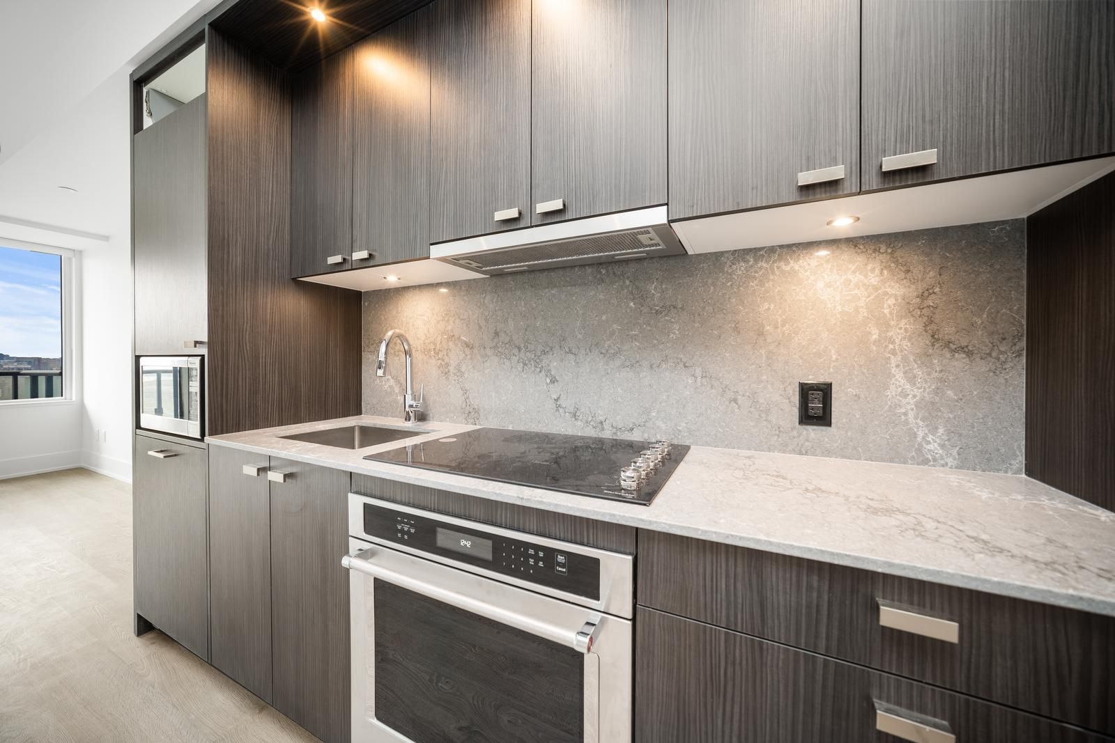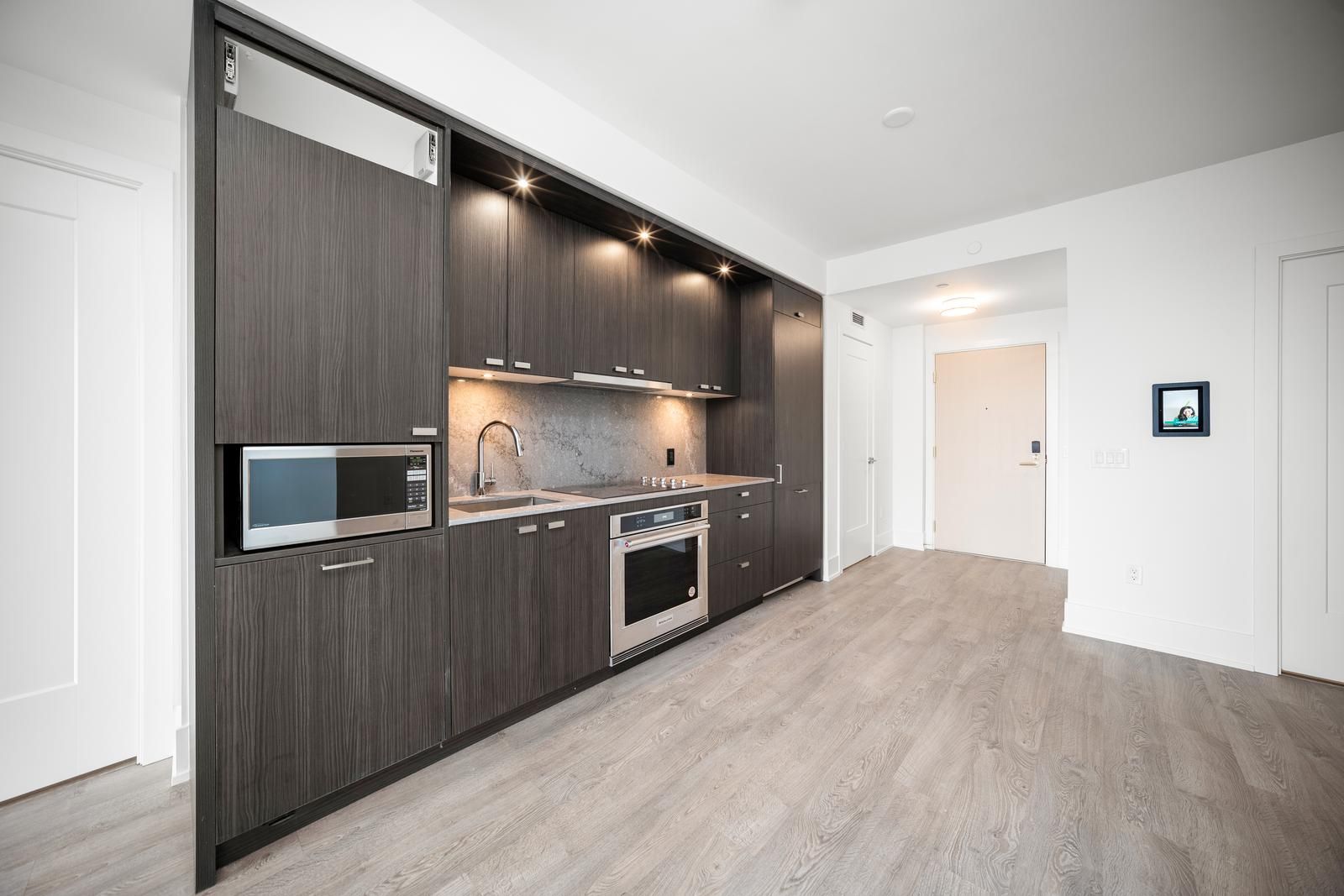 This luxury 2 bedroom and 2 bathroom + den condo suite at offers 965 sq. Ft. And 9 foot ceilings. Located on the 18th floor. West facing views with a balcony. This suite comes fully equipped with energy efficient 5-star stainless steel appliances, integrated dishwasher, kitchen island, contemporary soft close cabinetry, in suite laundry, standing glass shower, and floor to ceiling windows with coverings included. Parking is also included in this suite.