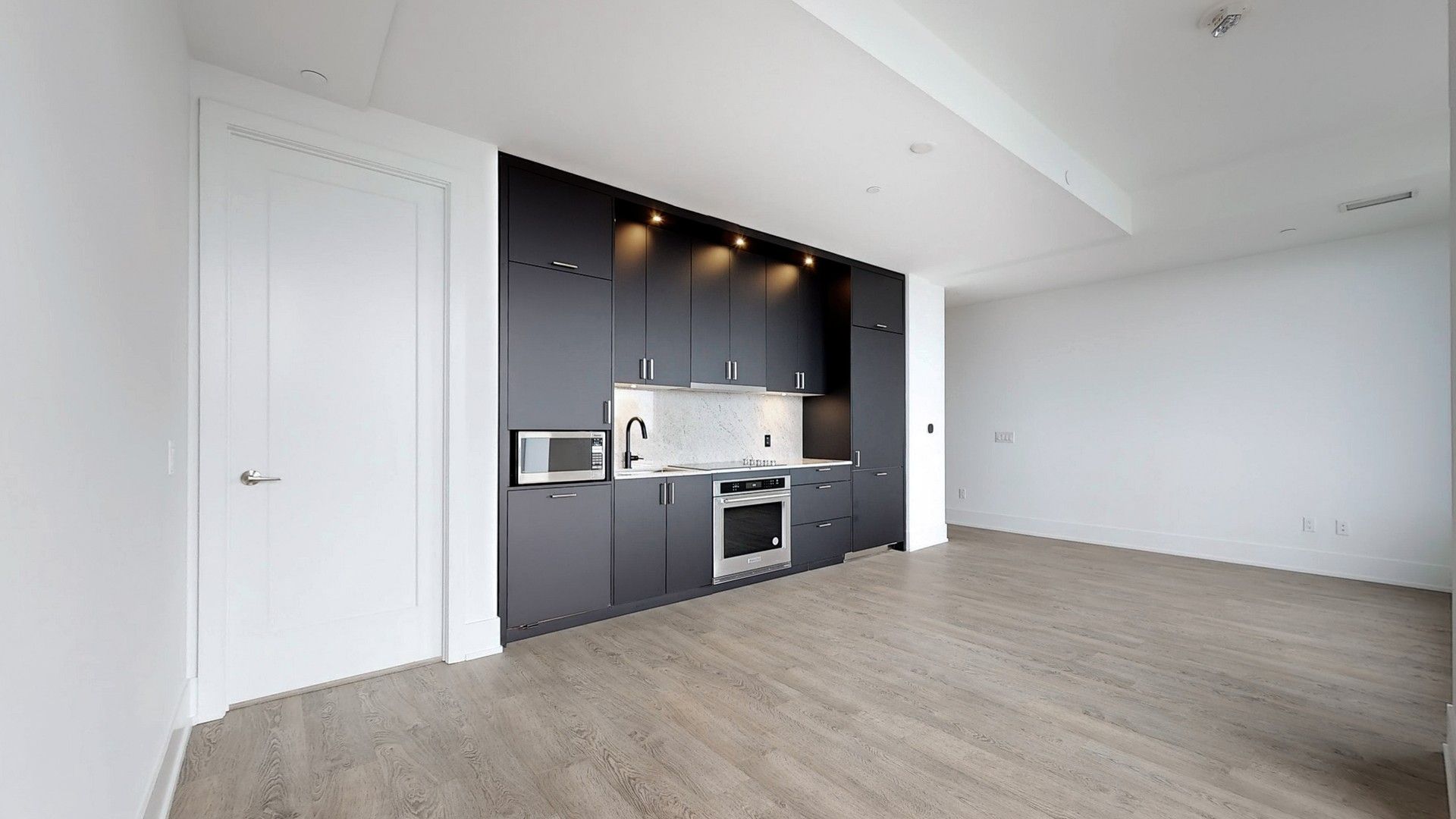 • Modern open-concept kitchen with integrated appliances and high ceilings.