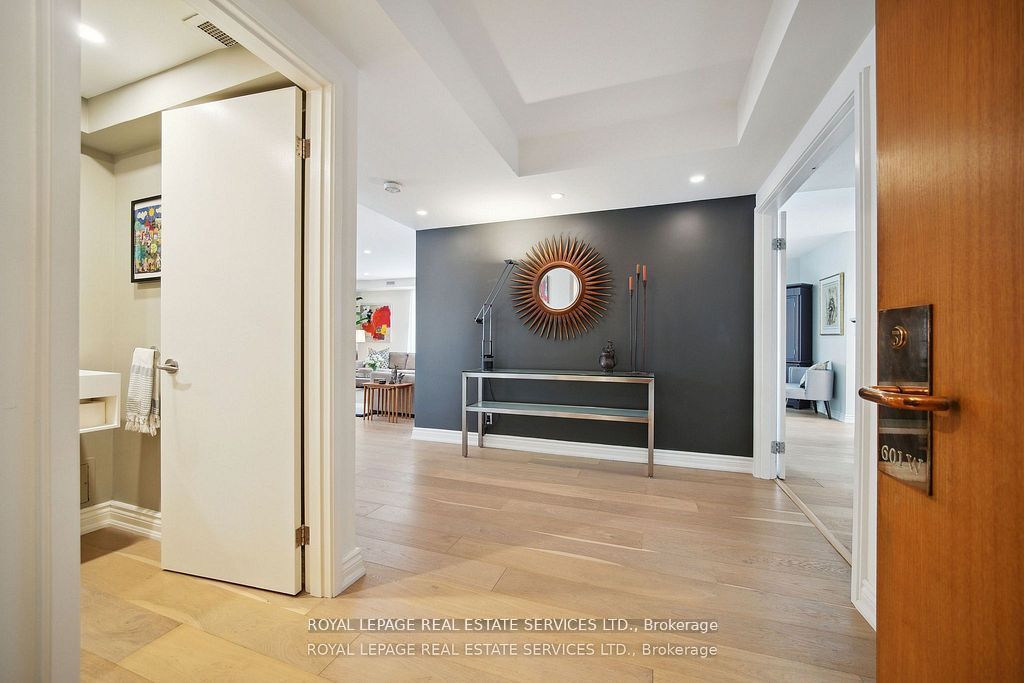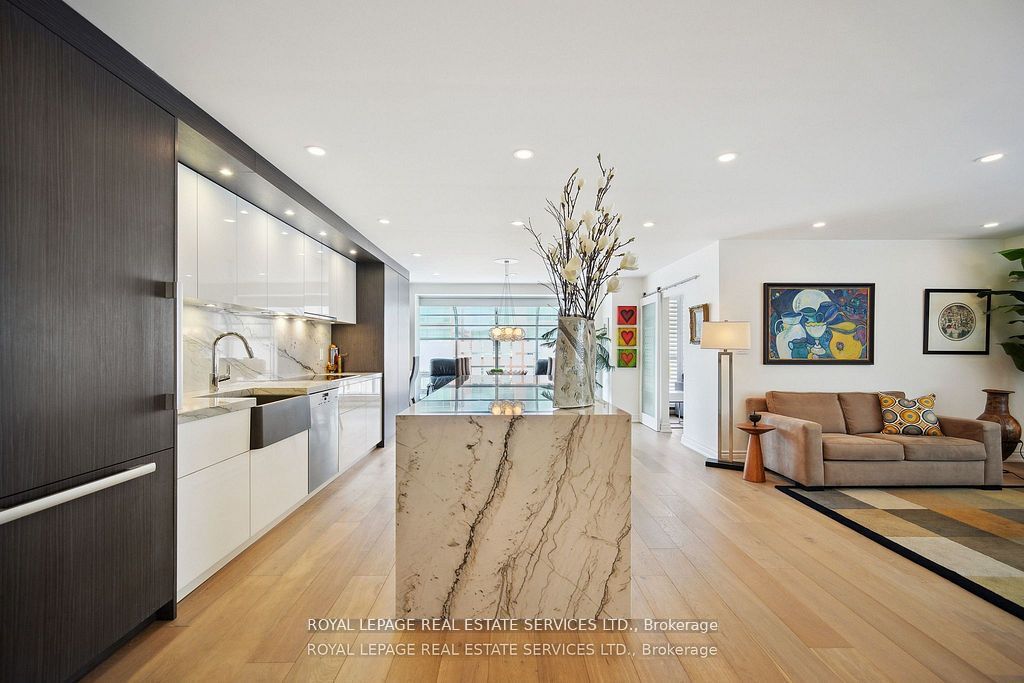 Welcome to suite 601w at the iconic king's landing-a masterpiece by celebrated canadian architect arthur erickson, best known for roy thomson hall. Nestled along toronto's vibrant waterfront, this rare, quiet corner unit has been meticulously renovated, offering a unique blend of architectural prestige and modern luxury. Step through a spacious, elegant foyer into a thoughtfully redesigned home perfect for elevated everyday living and entertaining. The heart of the suite features a gourmet chef's kitchen with a striking 10-ft waterfall island, premium miele appliances, and custom wine storage-flowing seamlessly into a large open-concept living and dining area. An expansive living room offers the perfect setting to host guests, while the bright solarium provides a private retreat to read, relax, or enjoy a glass of wine. The luxurious primary suite boasts a vast walk-in closet and spa-like ensuite with jetted soaker tub, dual vanities, and private water closet. A full-sized laundry room with built-in storage adds comfort and convenience. Ideally located on the same level as the building's exceptional amenities: indoor salt water pool & whirlpool, sauna, rooftop terrace with bbqs, outdoor pickleball court, state-of-the-art gym, party room, and golf swing practice range. Includes 1 parking space and 1 locker. With 24-hour white-glove concierge service, premier finishes, and a landmark location, suite 601w is a rare opportunity to live in one of toronto's most architecturally significant residences.