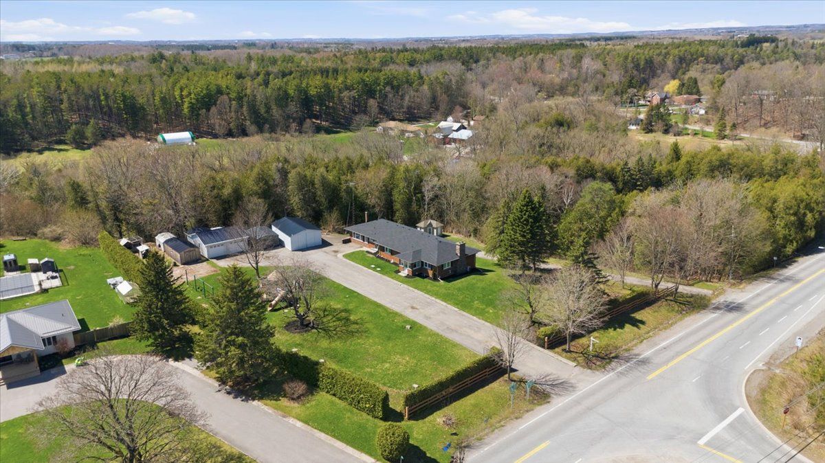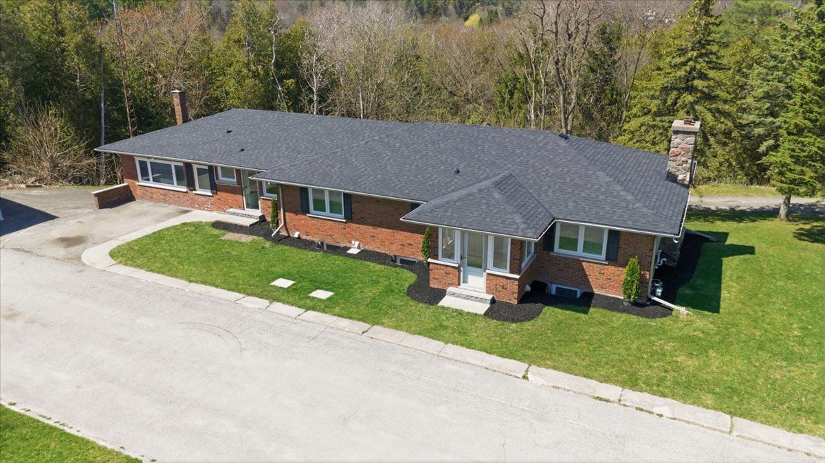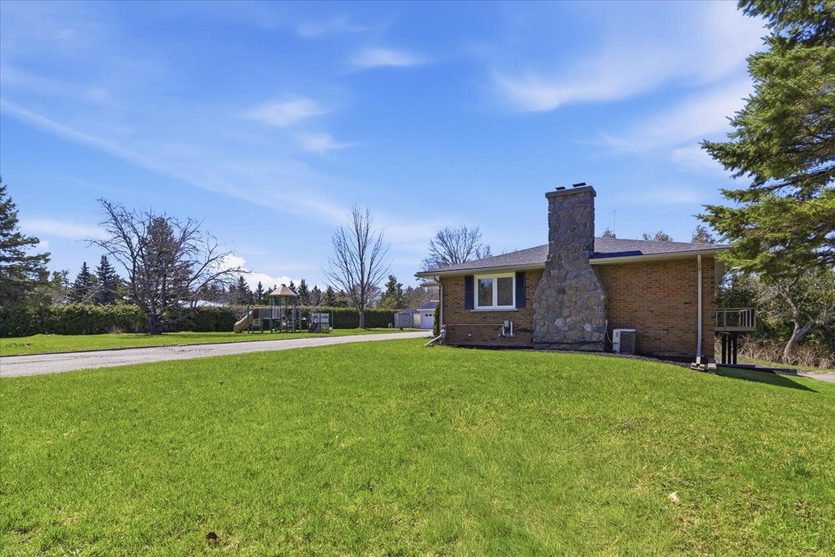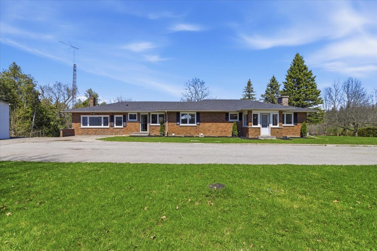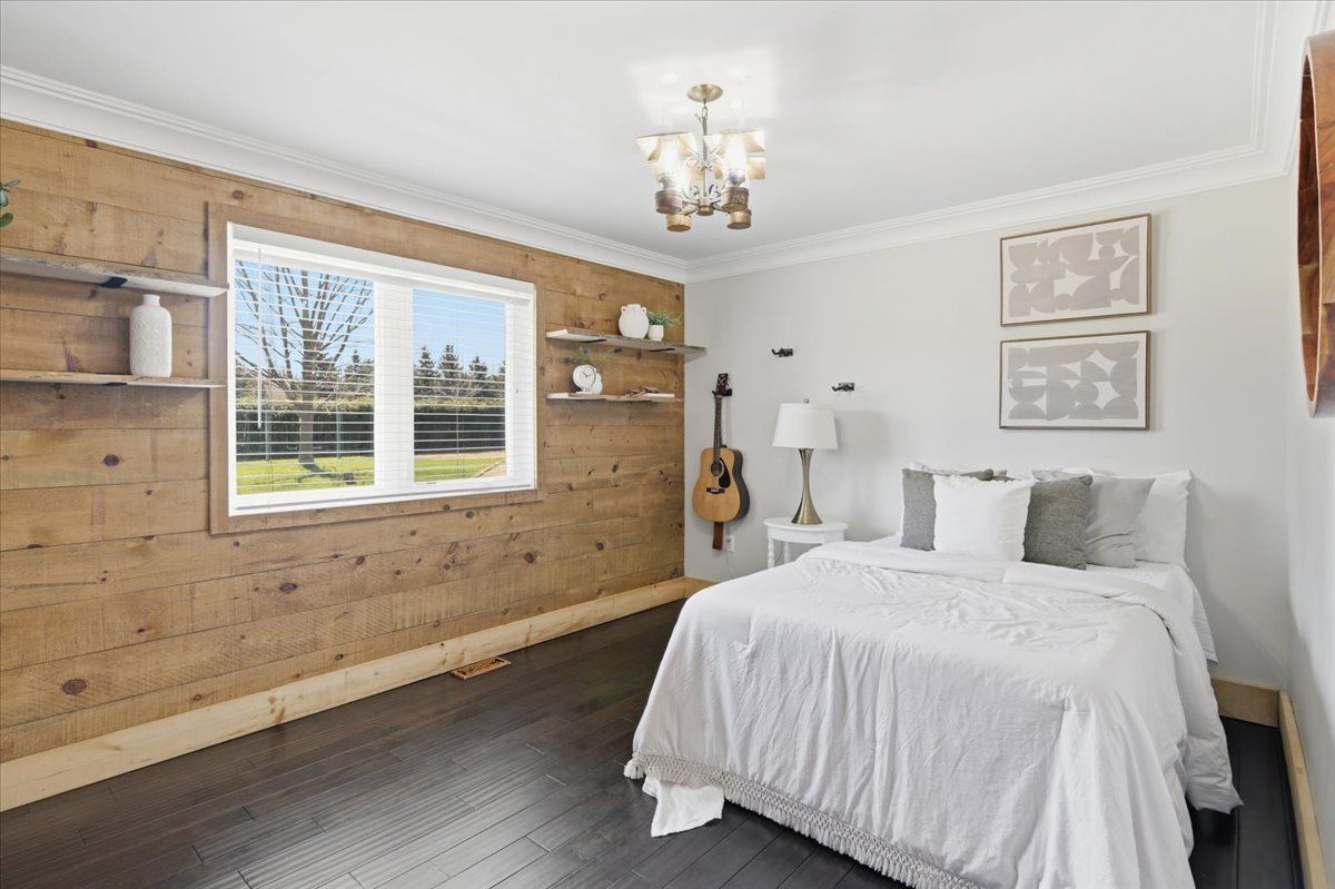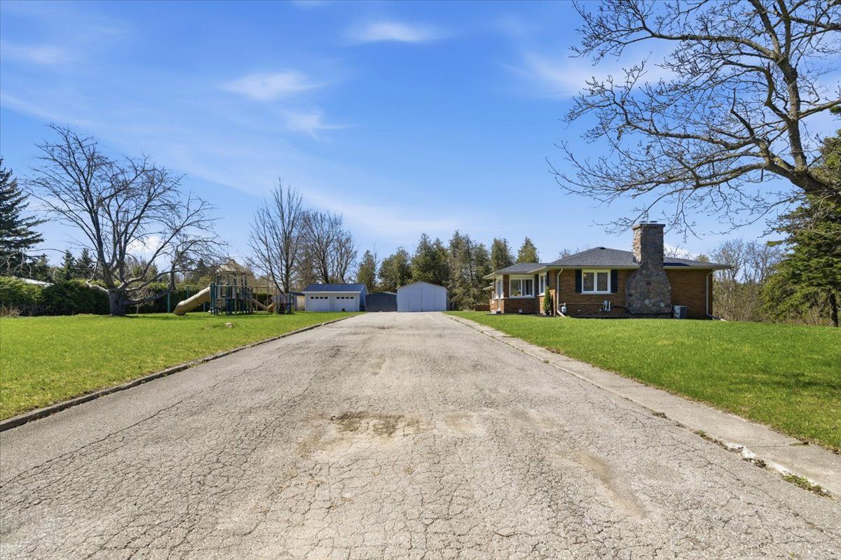 Experience the perfect blend of sophisticated design and quiet country living in this stunning brick bungalow, where superb attention to detail is evident in every corner. From the moment you step into the large, sun-drenched foyer the home's seamless floor plan and high-end finishes take center stage. The heart of the main level is a chef-inspired kitchen featuring sleek quartz countertops, backsplash, a convenient pot filler and rustic wood beams that add warmth to the space. Outfitted with a copper sink, a center island with integrated storage and a separate cooktop and oven, this culinary space flows effortlessly into a dining room adorned with elegant wainscoting. The refined aesthetic continues throughout the main floor with rich hardwood flooring and classic crown moldings. In the living room, massive windows flood the space with natural light, highlighting a striking wood and tile feature wall with a mantle over the fireplace. The private quarters include four generous bedrooms and a lavish main bathroom boasting dual sinks, a glass shower, and a soaking tub, complemented by a dedicated laundry room and an additional 3-piece bath. Far exceeding the expectations of a typical basement, the lower level reveals itself as a high-end, secondary residence that mirrors the quality and scale of the main floor. This bright, expansive living space features a walk-out to the garage and is flooded with natural light through large above-grade windows. It boasts a second gourmet kitchen with quartz counters and a center island, open to the dining area and a family room finished with hardwood. With two additional bedrooms one featuring a private ensuite, two separate recreation areas and a full 4-piece bath with its own laundry facilities, this level offers true independent luxury. Situated right off the 115, on an expansive lot with two separate driveways, two garages, and sheds, this property provides unparalleled space and versatility for any lifestyle.