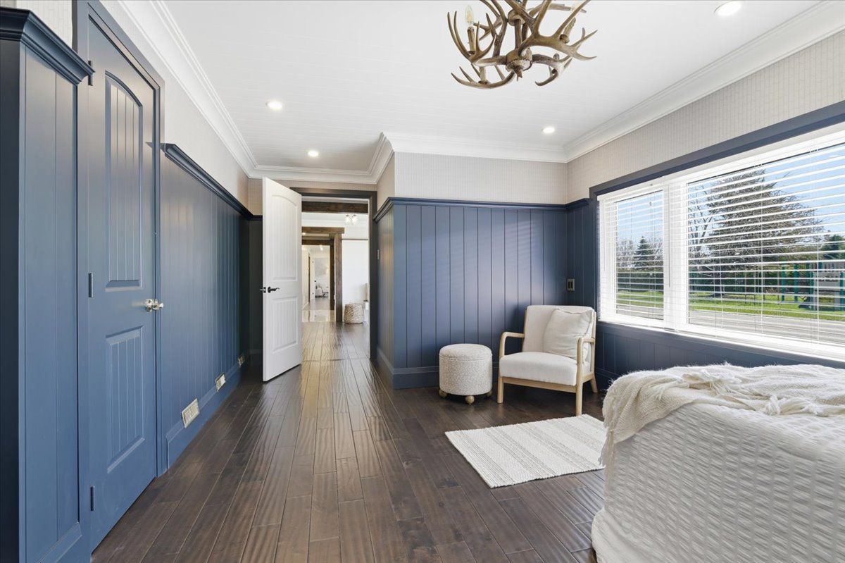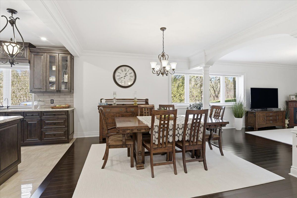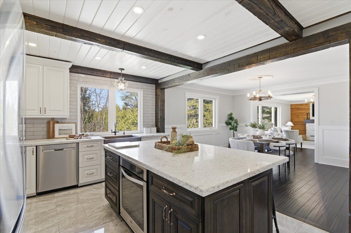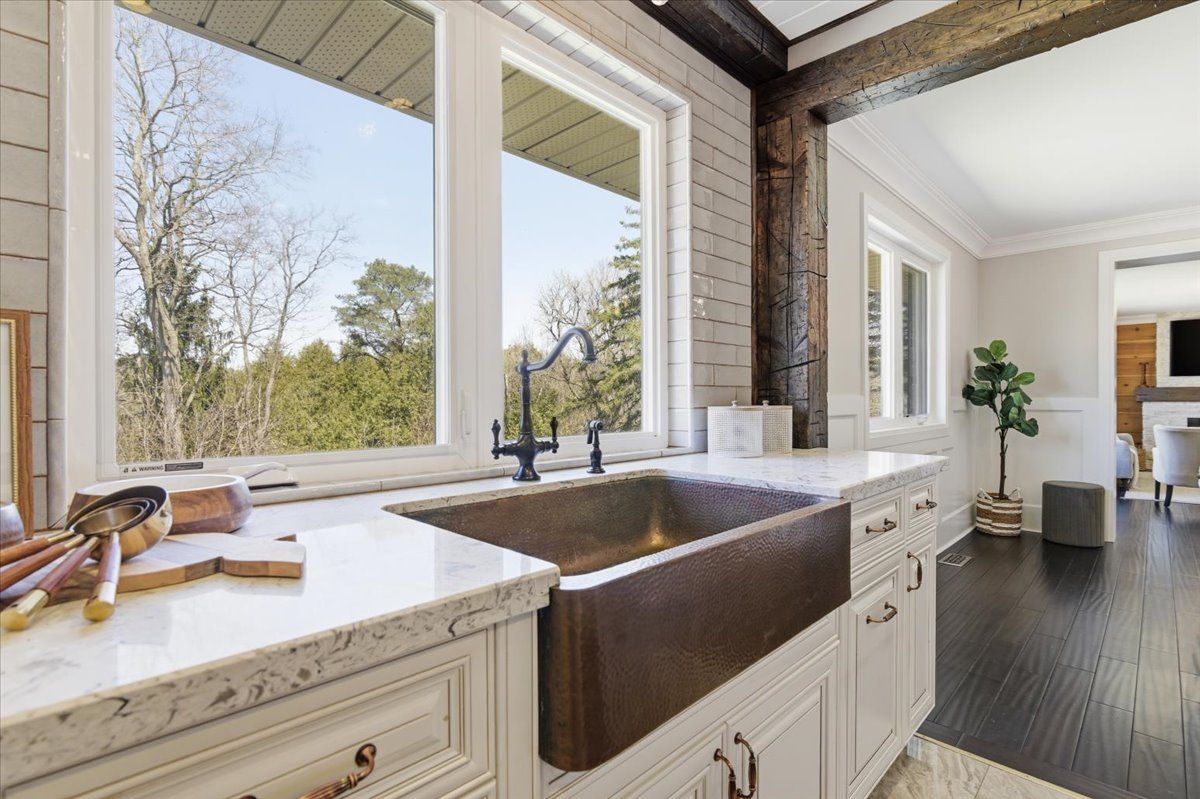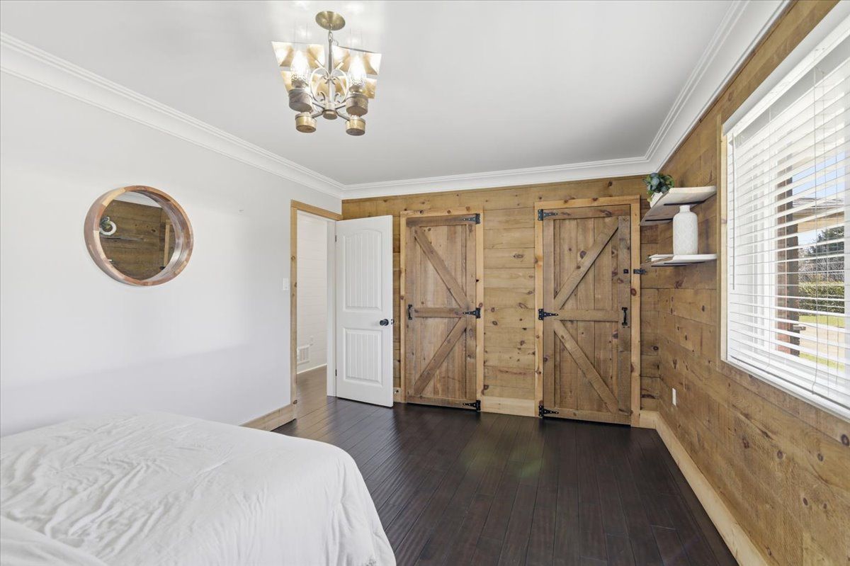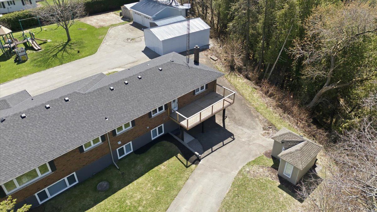 Experience the perfect blend of sophisticated design and quiet country living in this stunning brick bungalow, where superb attention to detail is evident in every corner. From the moment you step into the large, sun-drenched foyer the home's seamless floor plan and high-end finishes take center stage. The heart of the main level is a chef-inspired kitchen featuring sleek quartz countertops, backsplash, a convenient pot filler and rustic wood beams that add warmth to the space. Outfitted with a copper sink, a center island with integrated storage and a separate cooktop and oven, this culinary space flows effortlessly into a dining room adorned with elegant wainscoting. The refined aesthetic continues throughout the main floor with rich hardwood flooring and classic crown moldings. In the living room, massive windows flood the space with natural light, highlighting a striking wood and tile feature wall with a mantle over the fireplace. The private quarters include four generous bedrooms and a lavish main bathroom boasting dual sinks, a glass shower, and a soaking tub, complemented by a dedicated laundry room and an additional 3-piece bath. Far exceeding the expectations of a typical basement, the lower level reveals itself as a high-end, secondary residence that mirrors the quality and scale of the main floor. This bright, expansive living space features a walk-out to the garage and is flooded with natural light through large above-grade windows. It boasts a second gourmet kitchen with quartz counters and a center island, open to the dining area and a family room finished with hardwood. With two additional bedrooms one featuring a private ensuite, two separate recreation areas and a full 4-piece bath with its own laundry facilities, this level offers true independent luxury. Situated right off the 115, on an expansive lot with two separate driveways, two garages, and sheds, this property provides unparalleled space and versatility for any lifestyle.