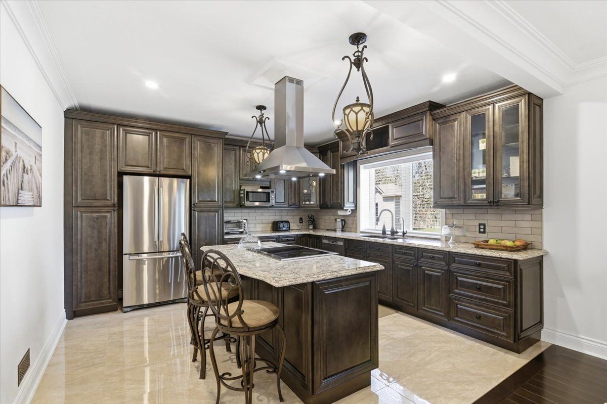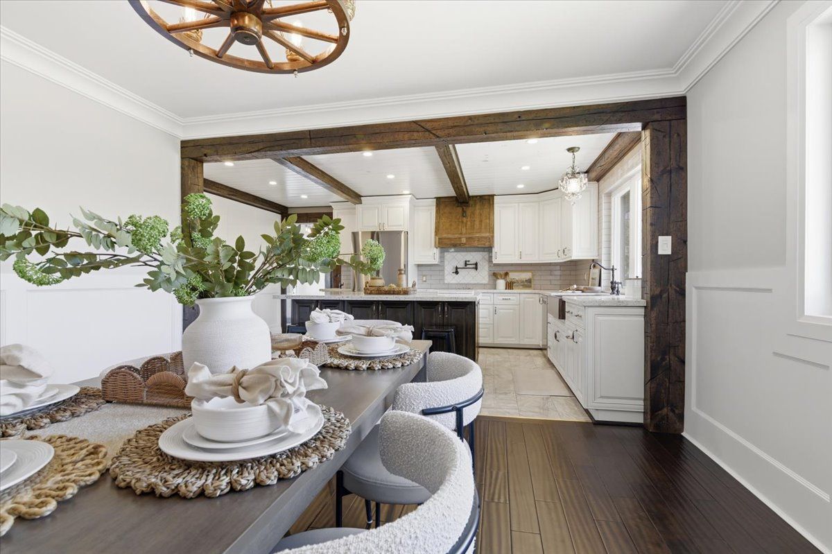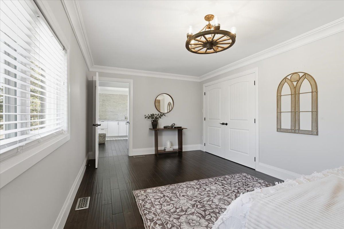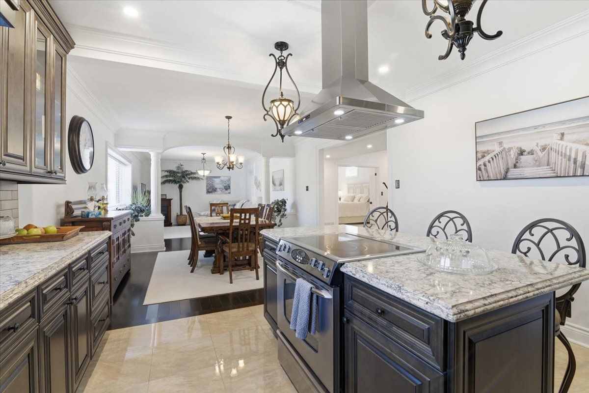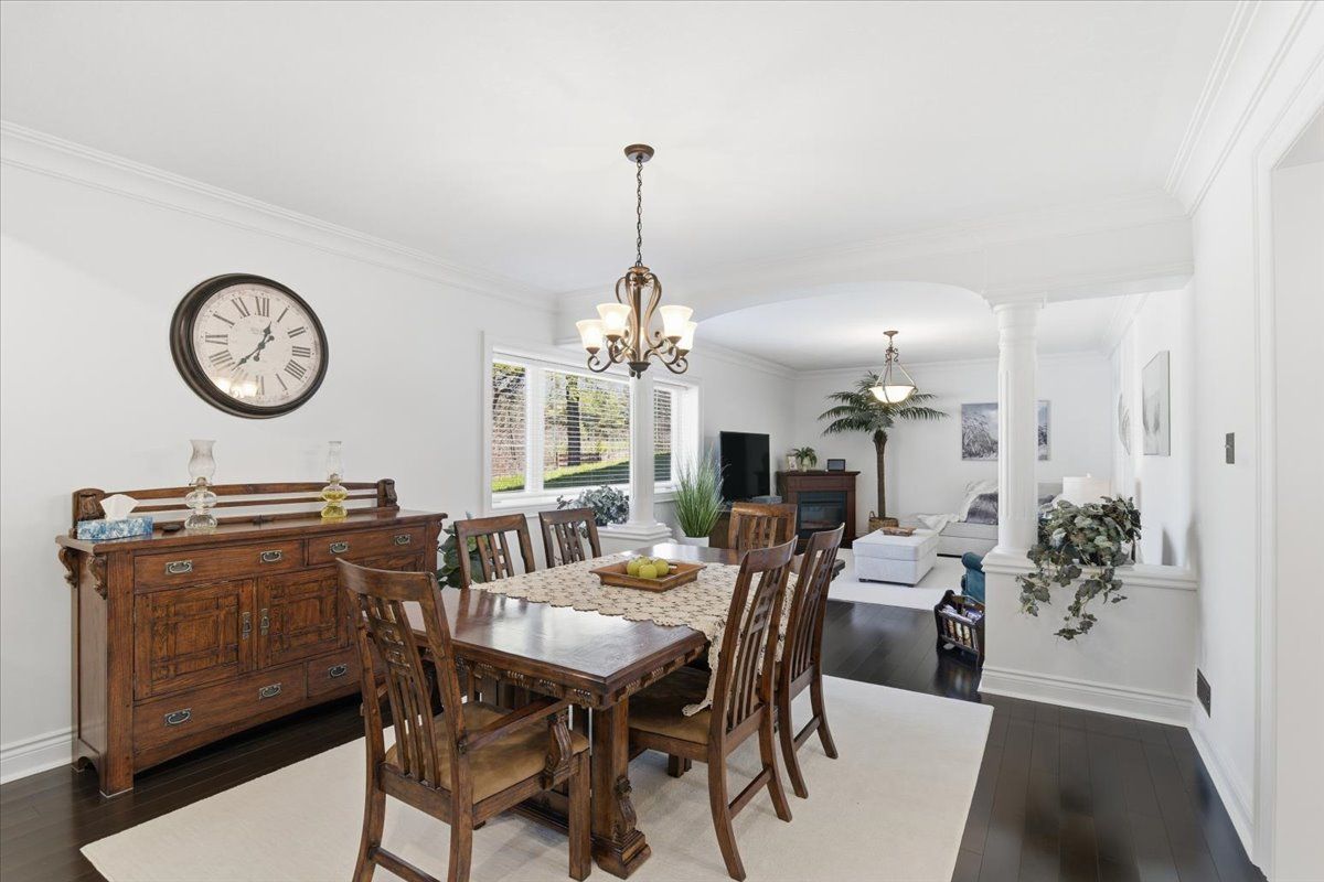 Experience the perfect blend of sophisticated design and quiet country living in this stunning brick bungalow, where superb attention to detail is evident in every corner. From the moment you step into the large, sun-drenched foyer the home's seamless floor plan and high-end finishes take center stage. The heart of the main level is a chef-inspired kitchen featuring sleek quartz countertops, backsplash, a convenient pot filler and rustic wood beams that add warmth to the space. Outfitted with a copper sink, a center island with integrated storage and a separate cooktop and oven, this culinary space flows effortlessly into a dining room adorned with elegant wainscoting. The refined aesthetic continues throughout the main floor with rich hardwood flooring and classic crown moldings. In the living room, massive windows flood the space with natural light, highlighting a striking wood and tile feature wall with a mantle over the fireplace. The private quarters include four generous bedrooms and a lavish main bathroom boasting dual sinks, a glass shower, and a soaking tub, complemented by a dedicated laundry room and an additional 3-piece bath. Far exceeding the expectations of a typical basement, the lower level reveals itself as a high-end, secondary residence that mirrors the quality and scale of the main floor. This bright, expansive living space features a walk-out to the garage and is flooded with natural light through large above-grade windows. It boasts a second gourmet kitchen with quartz counters and a center island, open to the dining area and a family room finished with hardwood. With two additional bedrooms one featuring a private ensuite, two separate recreation areas and a full 4-piece bath with its own laundry facilities, this level offers true independent luxury. Situated right off the 115, on an expansive lot with two separate driveways, two garages, and sheds, this property provides unparalleled space and versatility for any lifestyle.