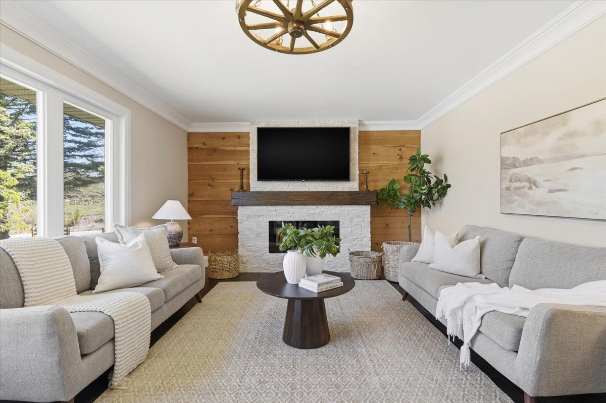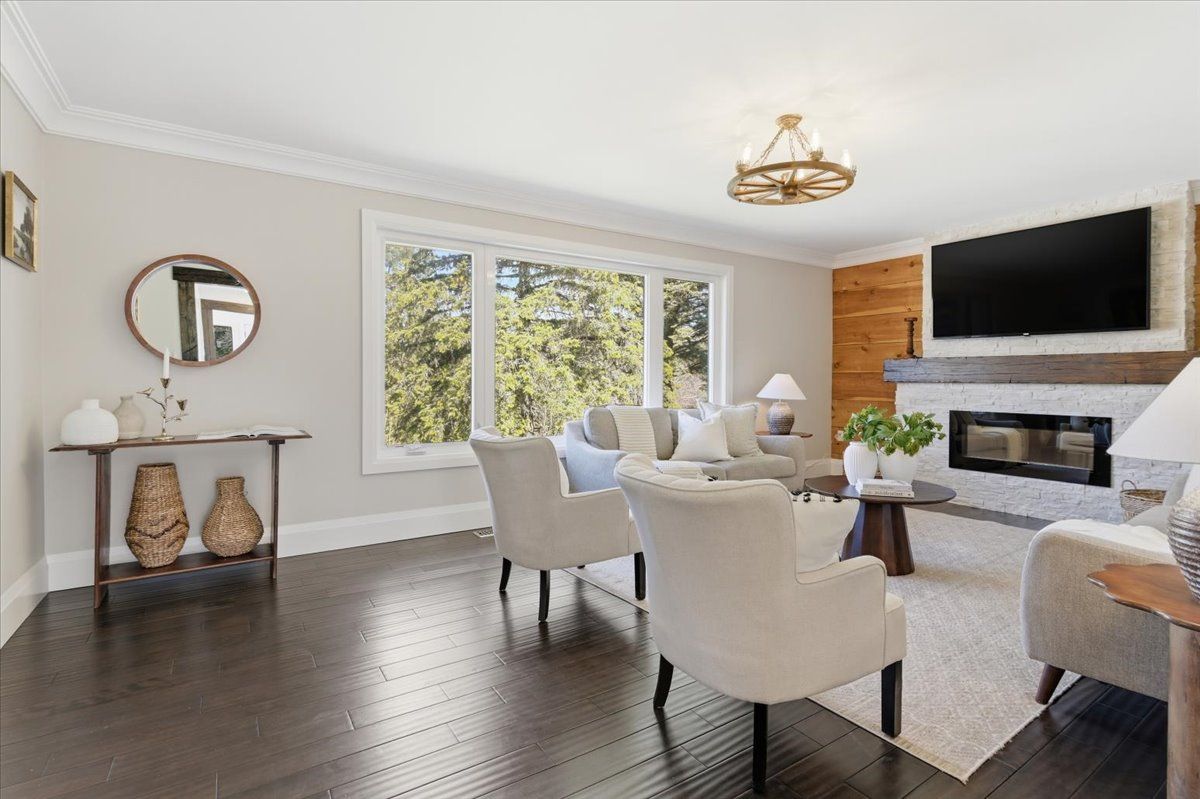 • Light-filled living room featuring a striking wood and tile fireplace.
