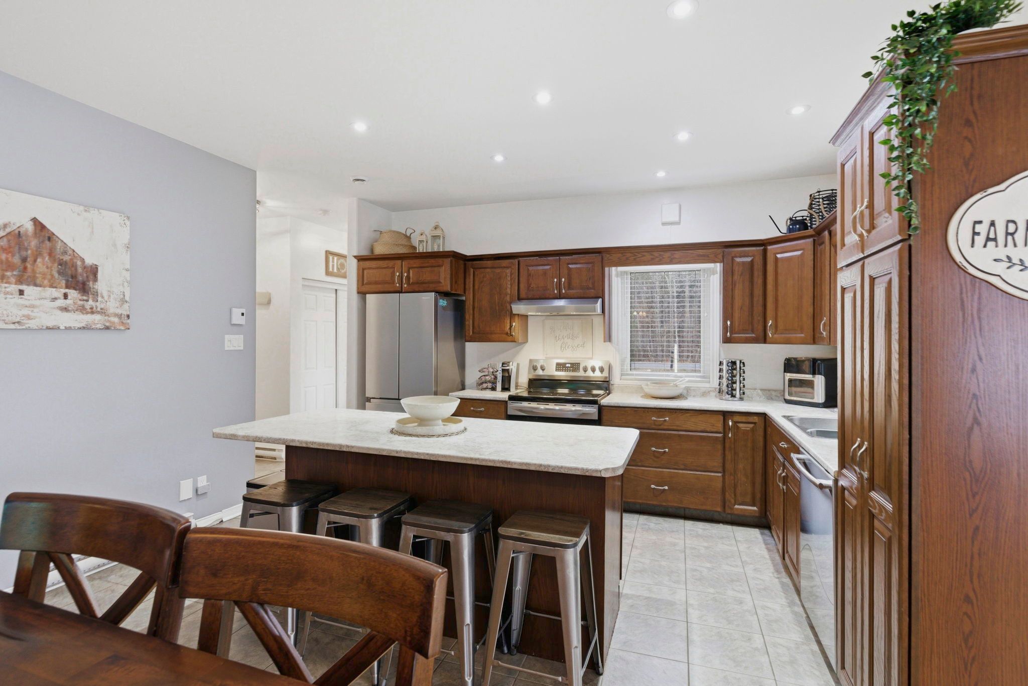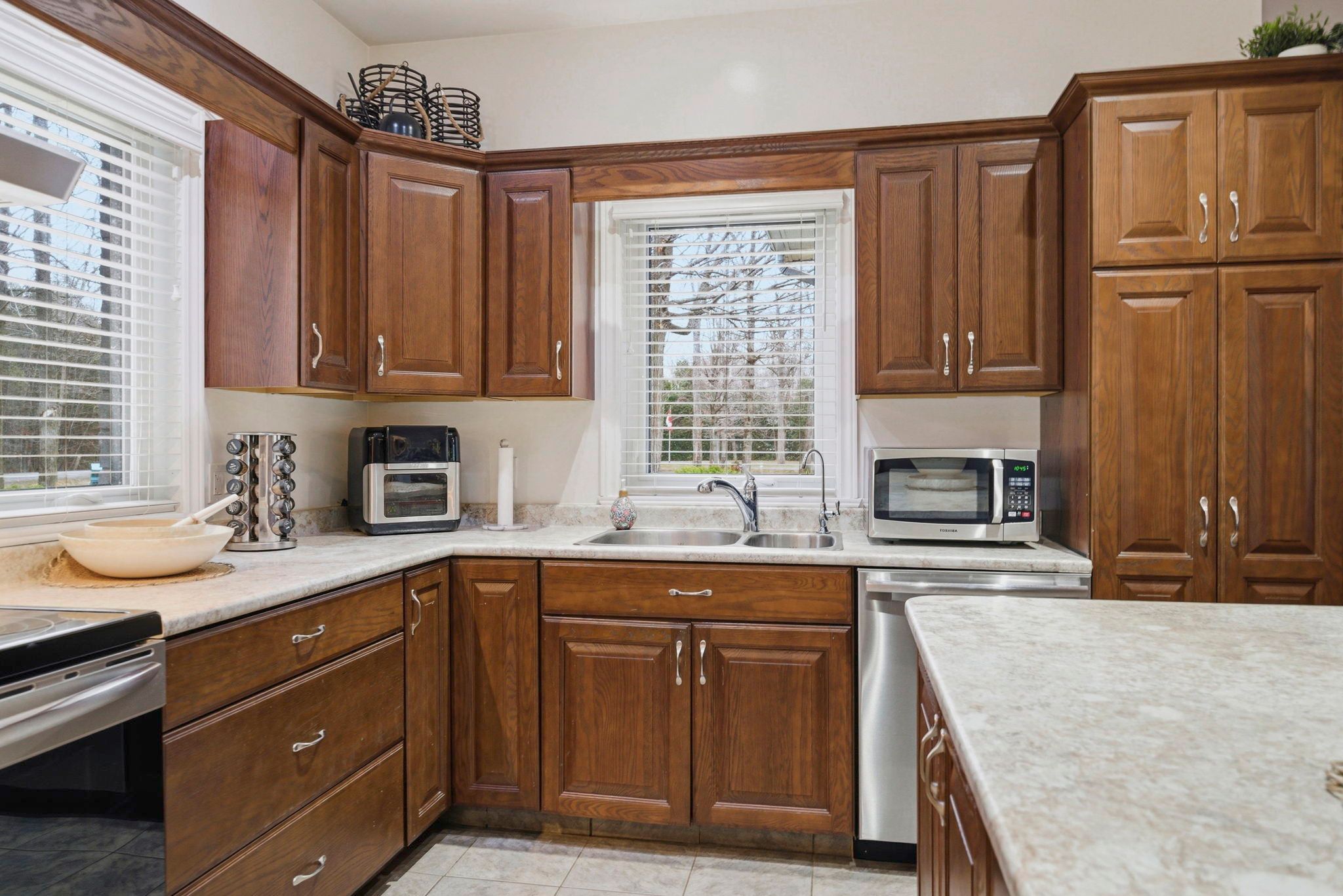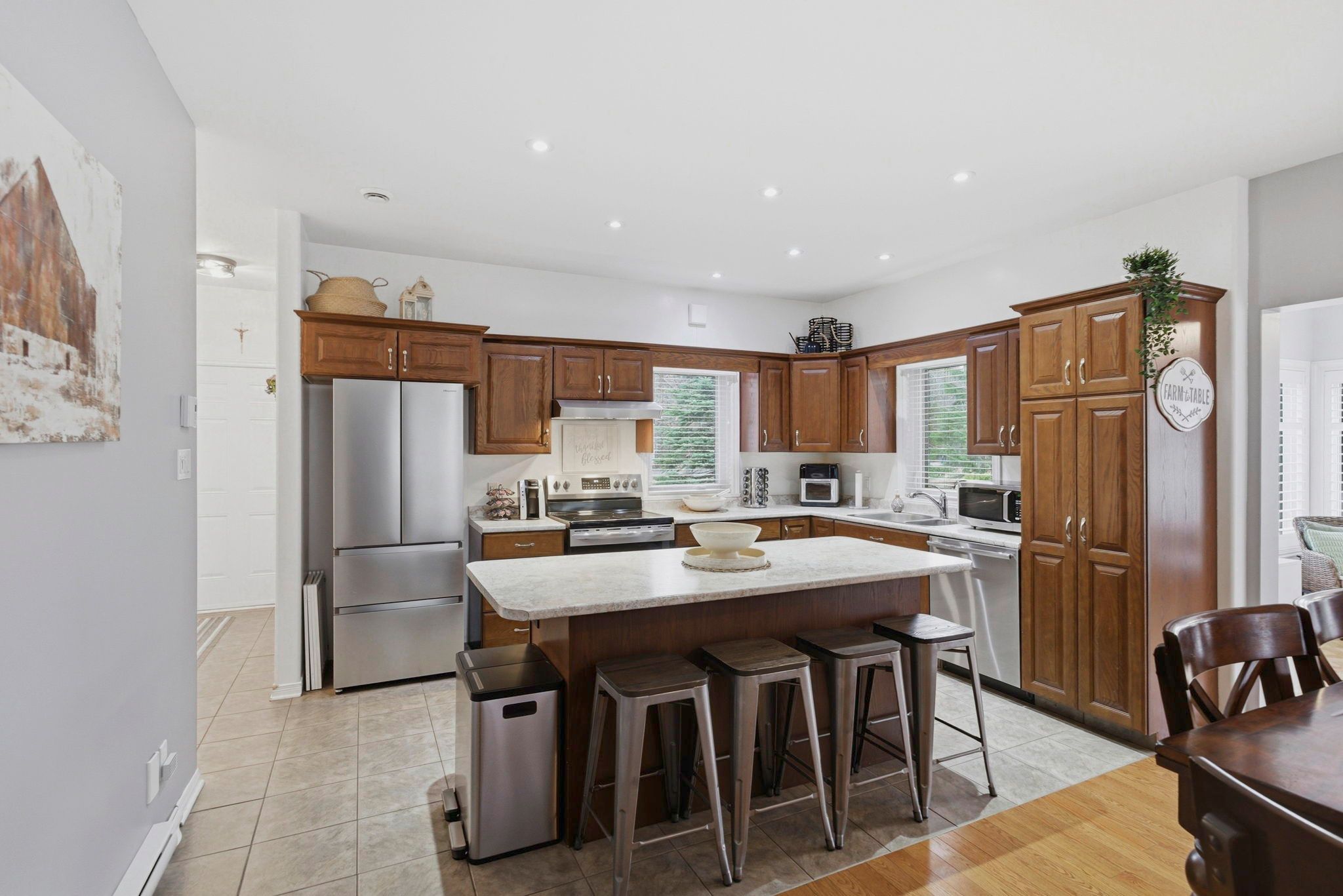 • Large oak kitchen island is perfect for family gatherings.