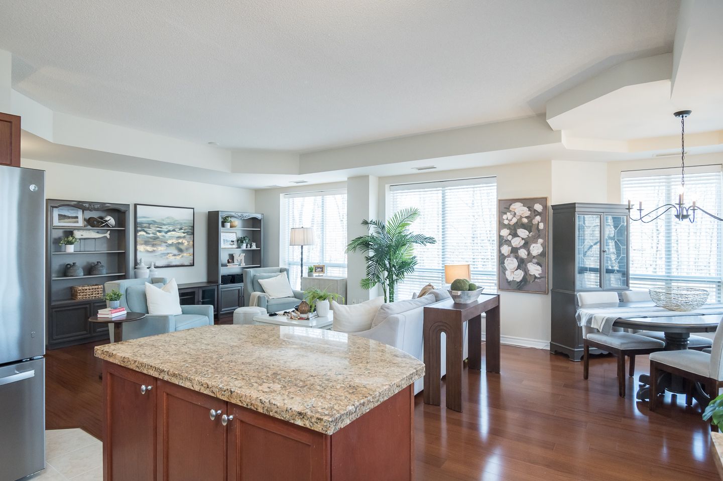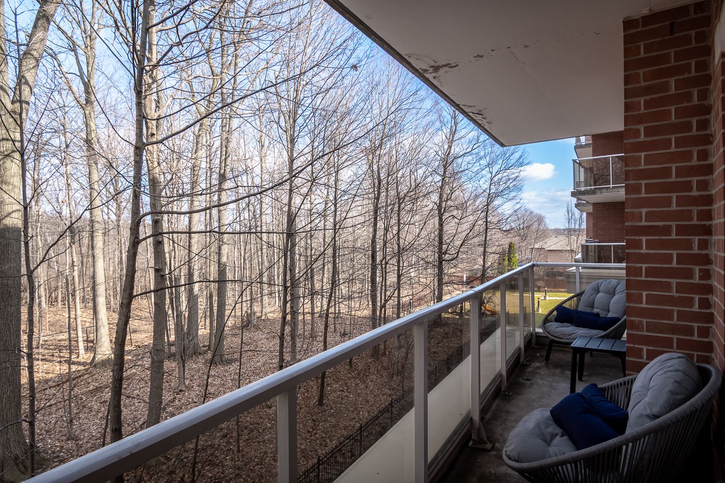 Welcome to this stunning corner unit in the prestigious woods end condominiums, ideally located in the sought-after hurontario neighbourhood of mississauga. Offering approximately 1200 sq ft of thoughtfully designed living space, this bright and spacious 2-bedroom, 2-bathroom condo showcases beautiful views of the surrounding wooded greenspace. The modern eat-in kitchen features a breakfast bar island, stainless steel appliances, tile backsplash, ample counter space, and direct access to a large private balcony complete with a gas line for bbqs. The open-concept living and dining areas are enhanced with hardwood flooring, upgraded lighting, expansive windows, and a neutral colour palette throughout. The generously sized bedrooms include a primary retreat with a walk-in closet and 4-piece ensuite, along with cozy newly installed carpeting and a large main bath. Enjoy upscale building amenities such as concierge service, guest suites, a party room, and an exercise facility. Conveniently located just minutes from square one shopping centre and the vibrant heartland area, with easy access to transit, parks, golf, and recreation-this is condo living at its finest.