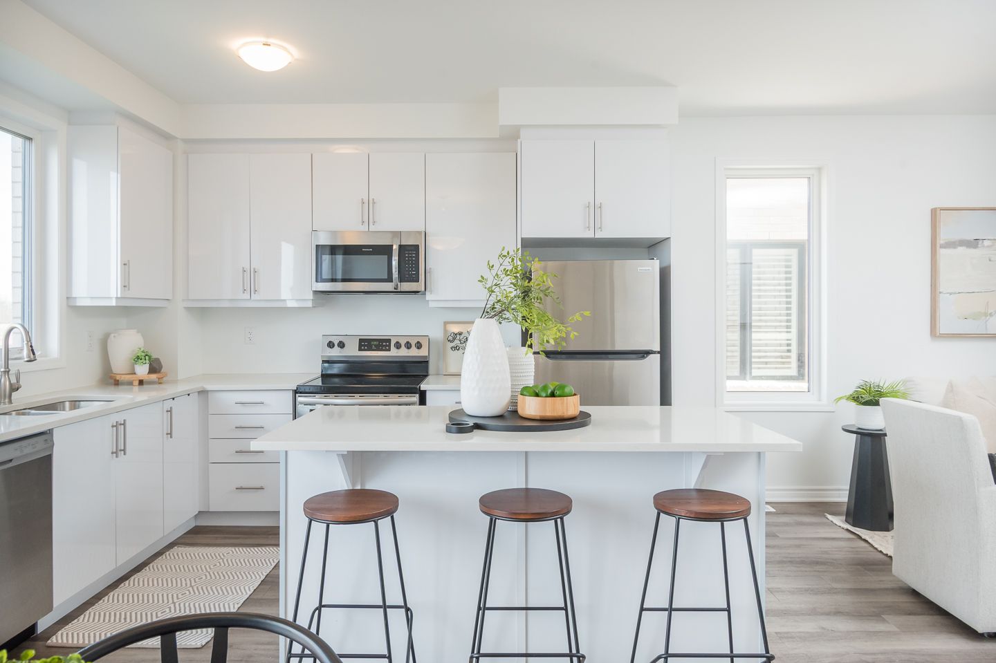 • Bright kitchen features quartz countertops and stainless steel appliances.