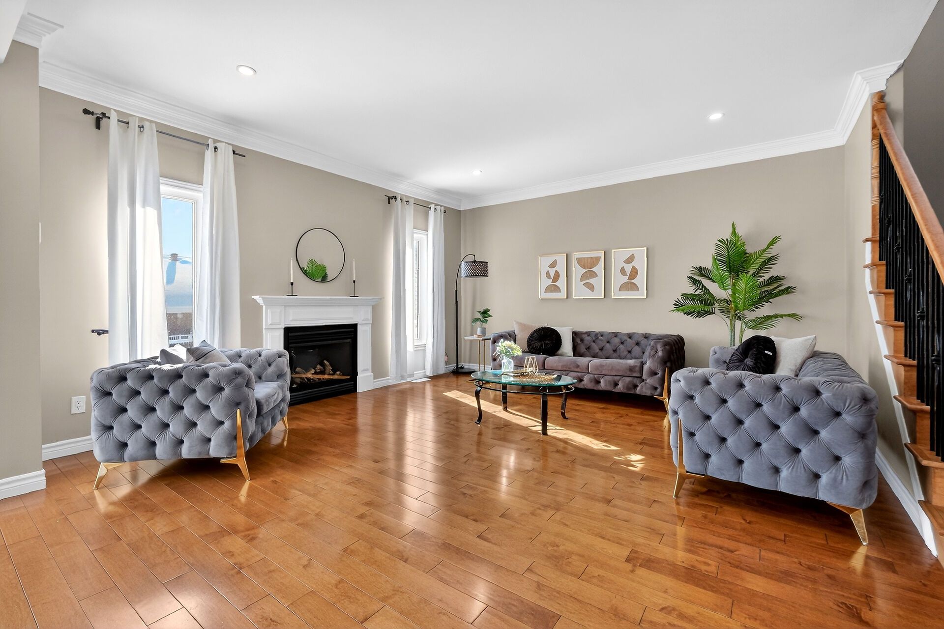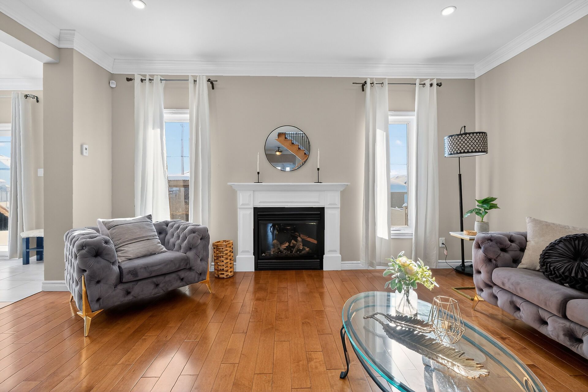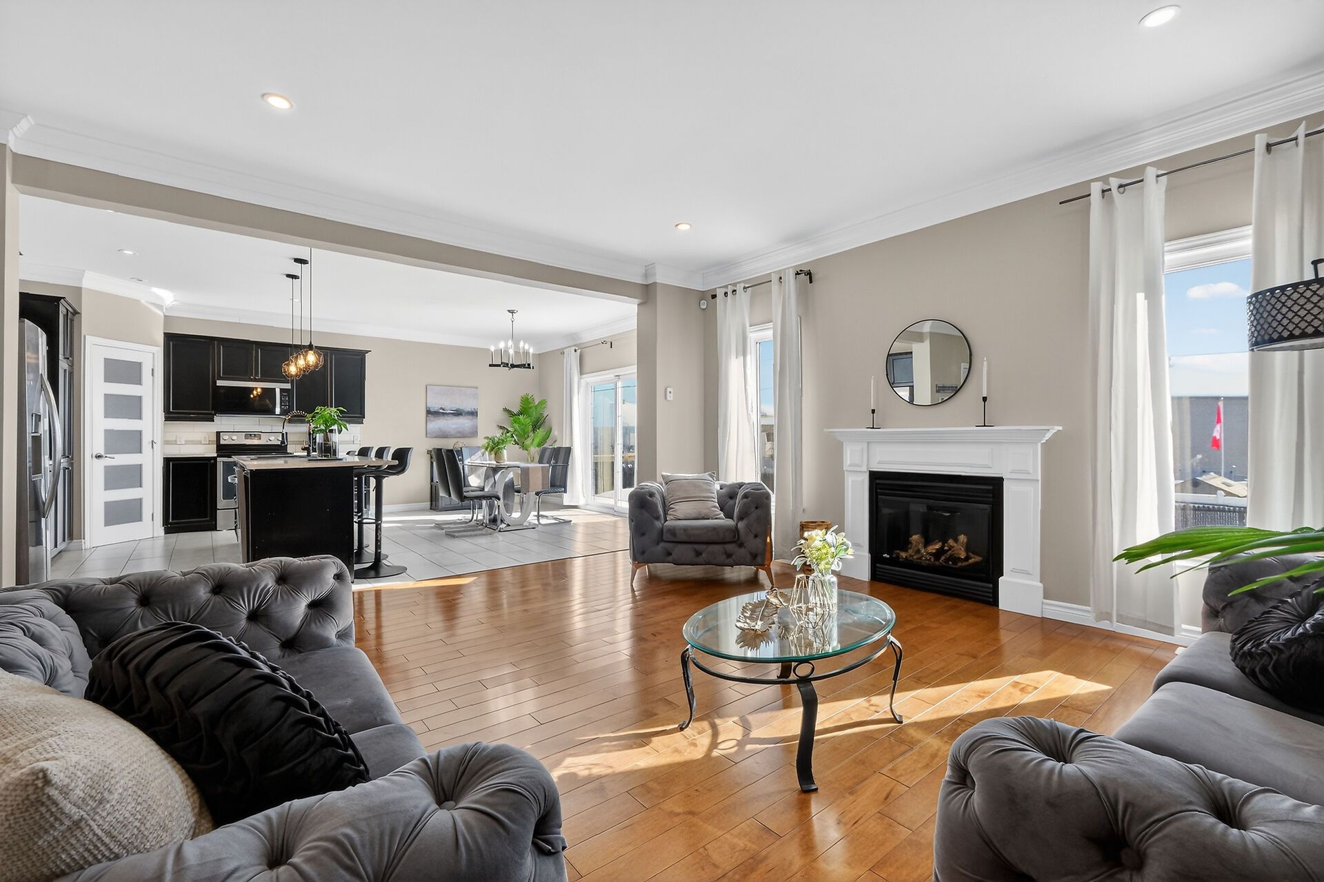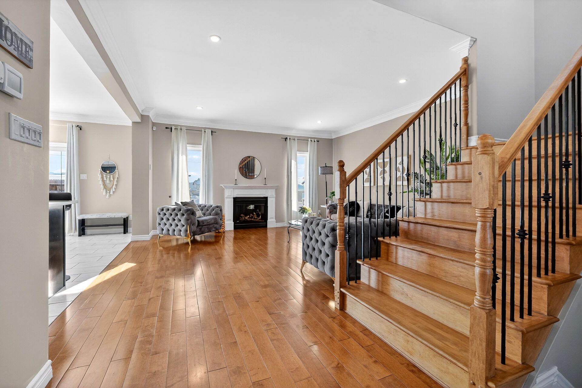 • Spacious open-concept main level with hardwood floors and bright living room.