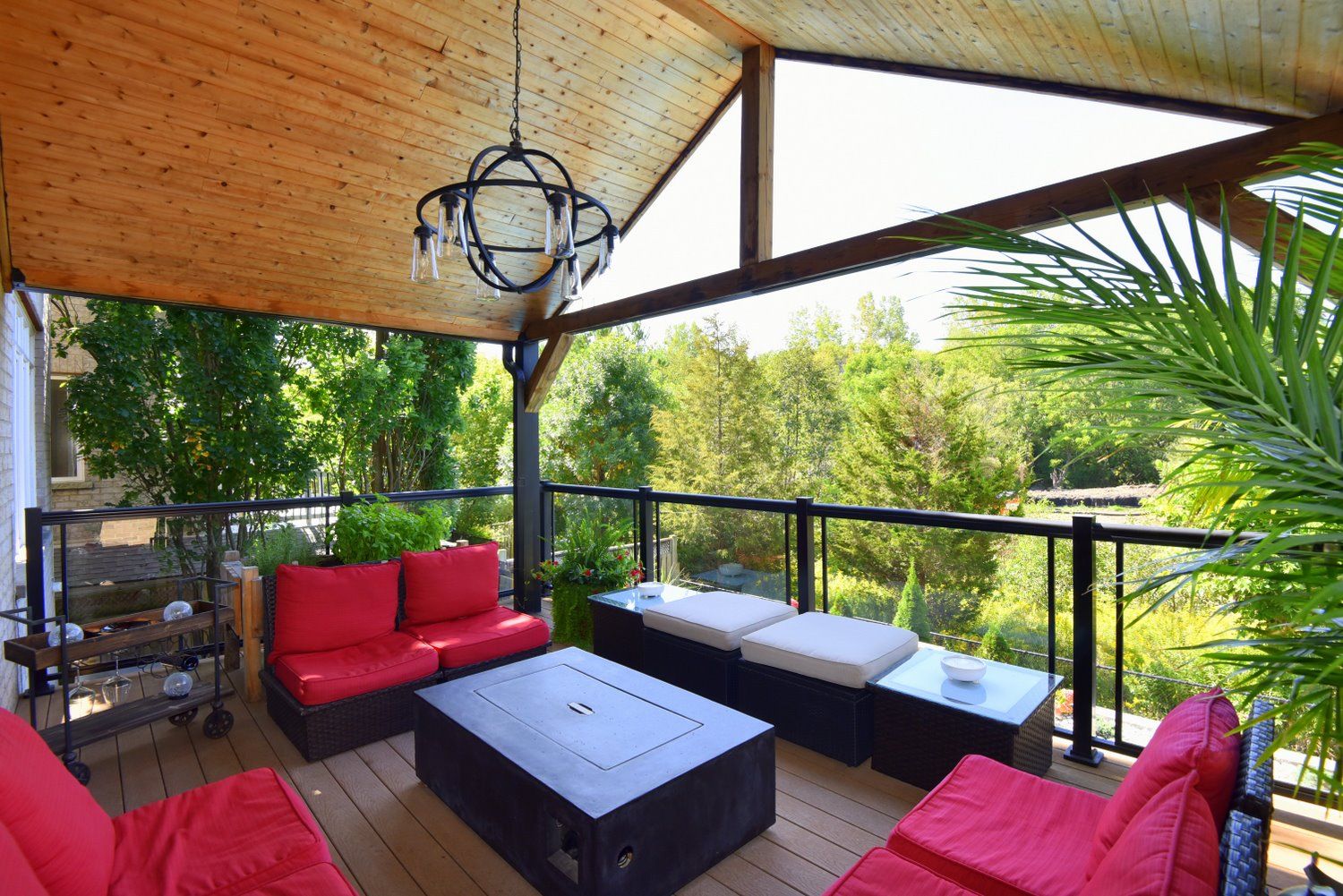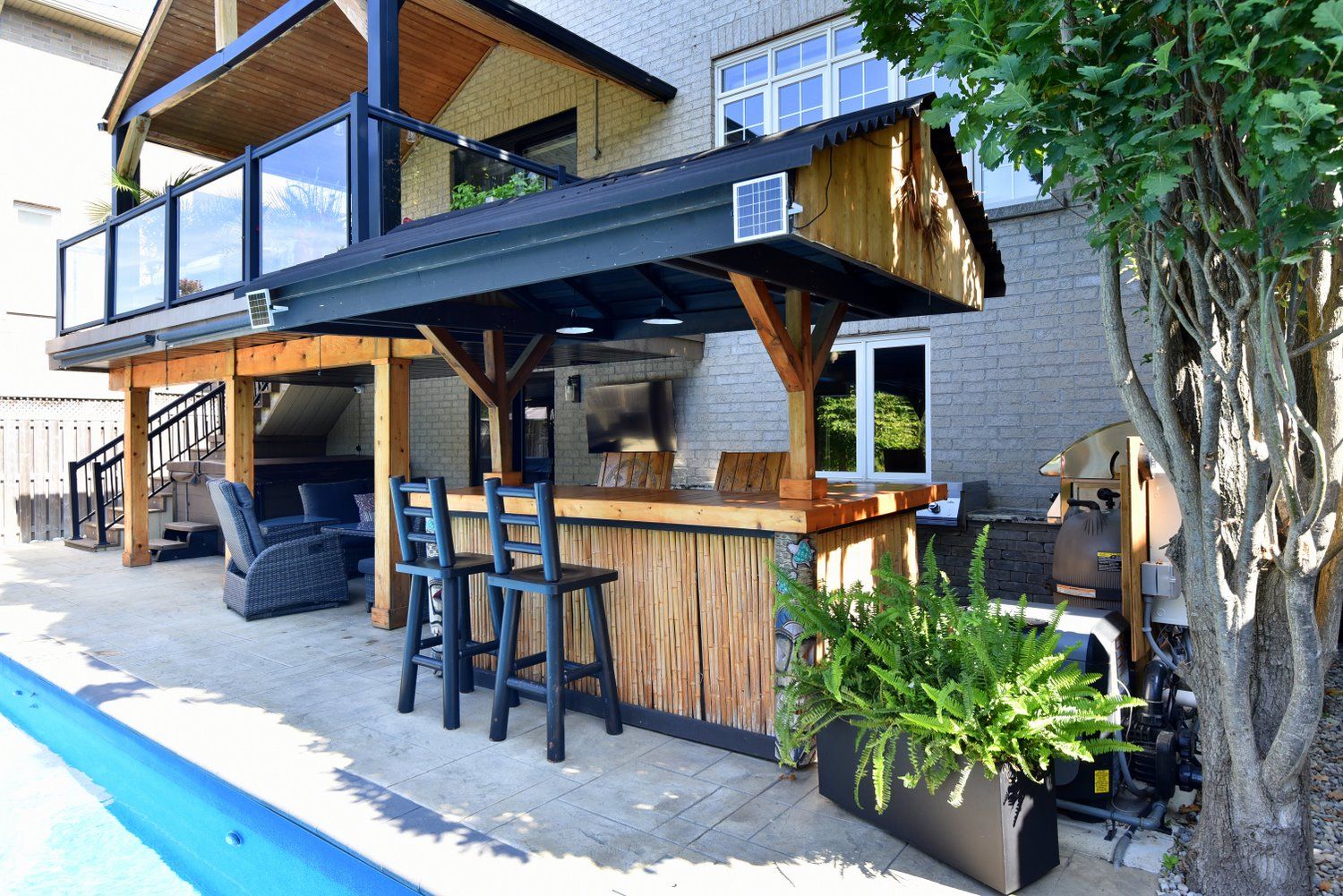 • Multiple outdoor living spaces including covered decks and a hot tub.