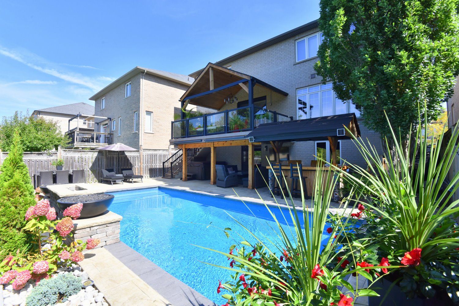 Stunning 4-bed home in ancaster's coveted parkview heights with an incredible backyard oasis featuring a heated inground saltwater pool. Hot tub, tiki bar, covered decks, and sunny patios overlooking greenspace, pond, and woods. Inside, a soaring foyer leads to the chef's kitchen with maple cabinetry, gas cooktop, double wall ovens, pantry, and 8' island, open to the breakfast area and covered deck. The family room offers a modern gas fireplace, built-ins, hardwood floors, and automated blinds. Dining room with tray ceiling, office with california shutters, laundry, and powder room complete the main level. The spacious principal suite includes a walk-in closet and ensuite with glass shower, separate tub, and double vanities plus serene views. Three additional bedrooms and full bath serve the family. The finished walk-out basement adds a second kitchen, large family room with gas fireplace, gym area, 3-pc bath, and storage. Outdoor living shines with multiple covered spaces and a resort-style pool and hot tub. A rare offering in a premium location . Rsa don't delay, arrange your viewing today!
